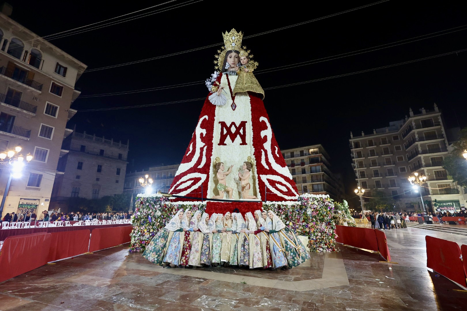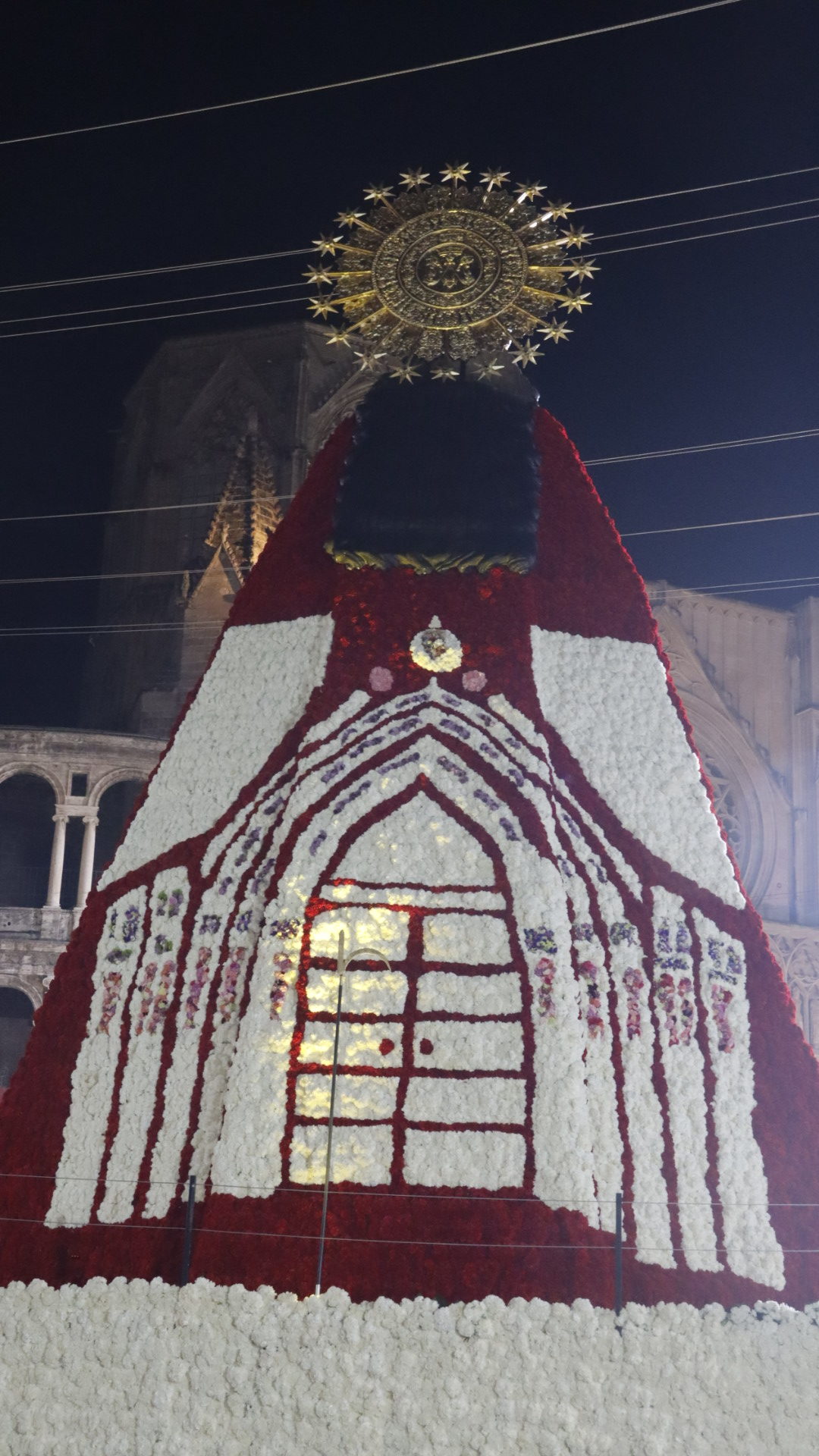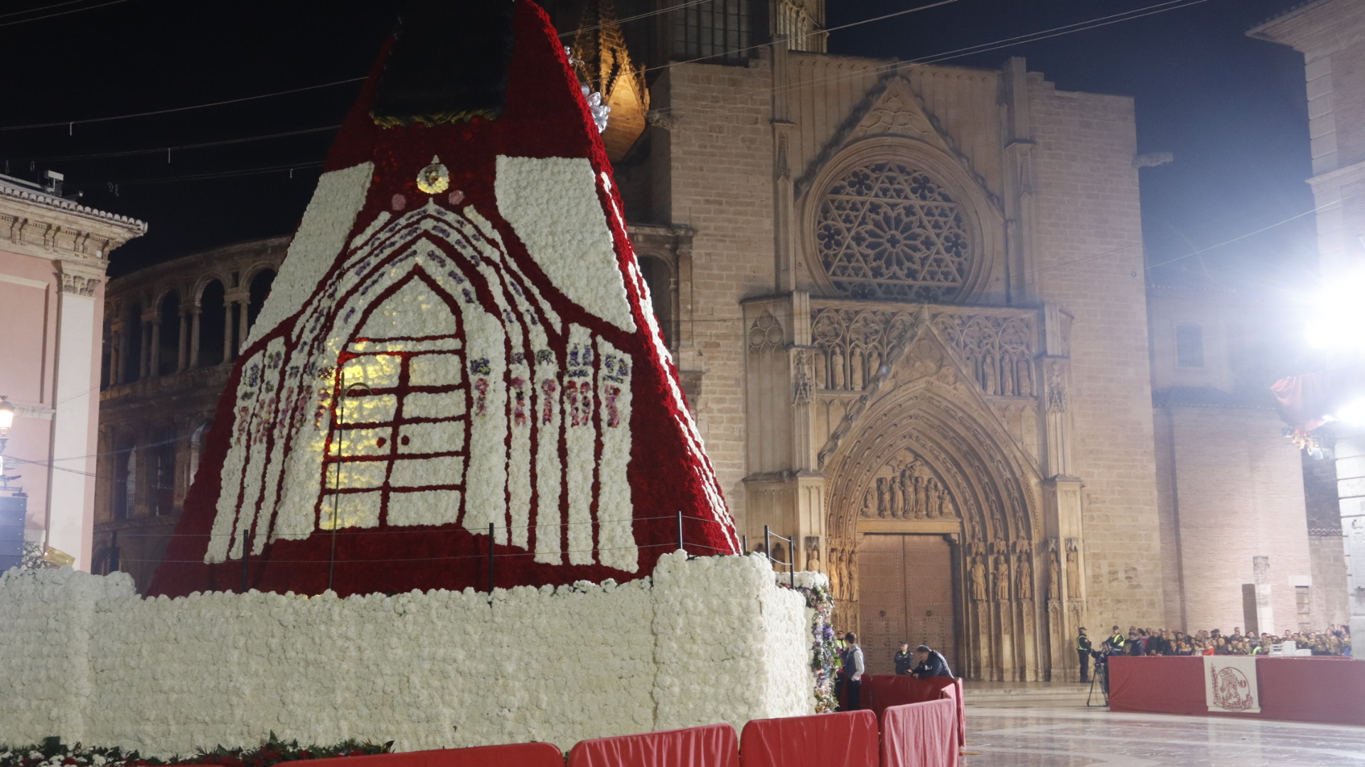 A medida que las comisiones entregaban este domingo sus flores en una ‘Ofrena’ que se alargó hasta bien entrada la madrugada y los vestidores trabajaban los claveles rojos y blancos, se pudo ir descubriendo cómo en el tapiz que recubre el cadafal se dibujaba un portal con líneas que recordaban al estilo gótico presente en la propia plaza de la Mare de Déu.