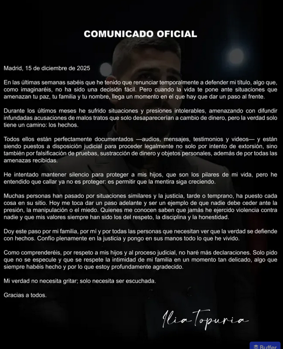 MADRID, 15 de diciembre de 2025 – El doble campeón de la UFC, Ilia Topuria (17-0), ha publicado un comunicado oficial en sus redes sociales explicando los problemas personales y legales que le han impedido defender su título en el primer trimestre de 2026.