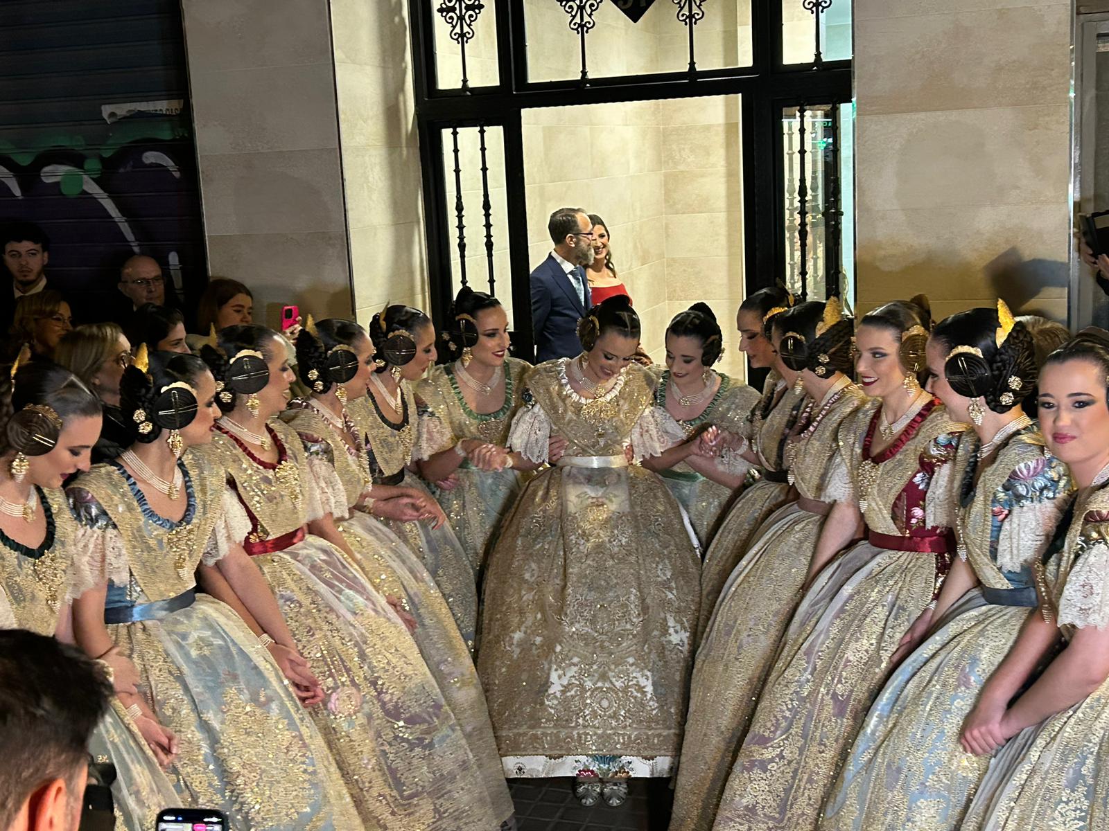 Consuelo Llobell sorprendía con una seda estrecha en color ‘Verde Túria’ de Vives y Marí con metal en oro blanco. Confeccionado por Marian Indumentaria se trata de un modelo del siglo XVIII con envarado interior siguiendo patrones clásicos de la época con almenas en la cintura.