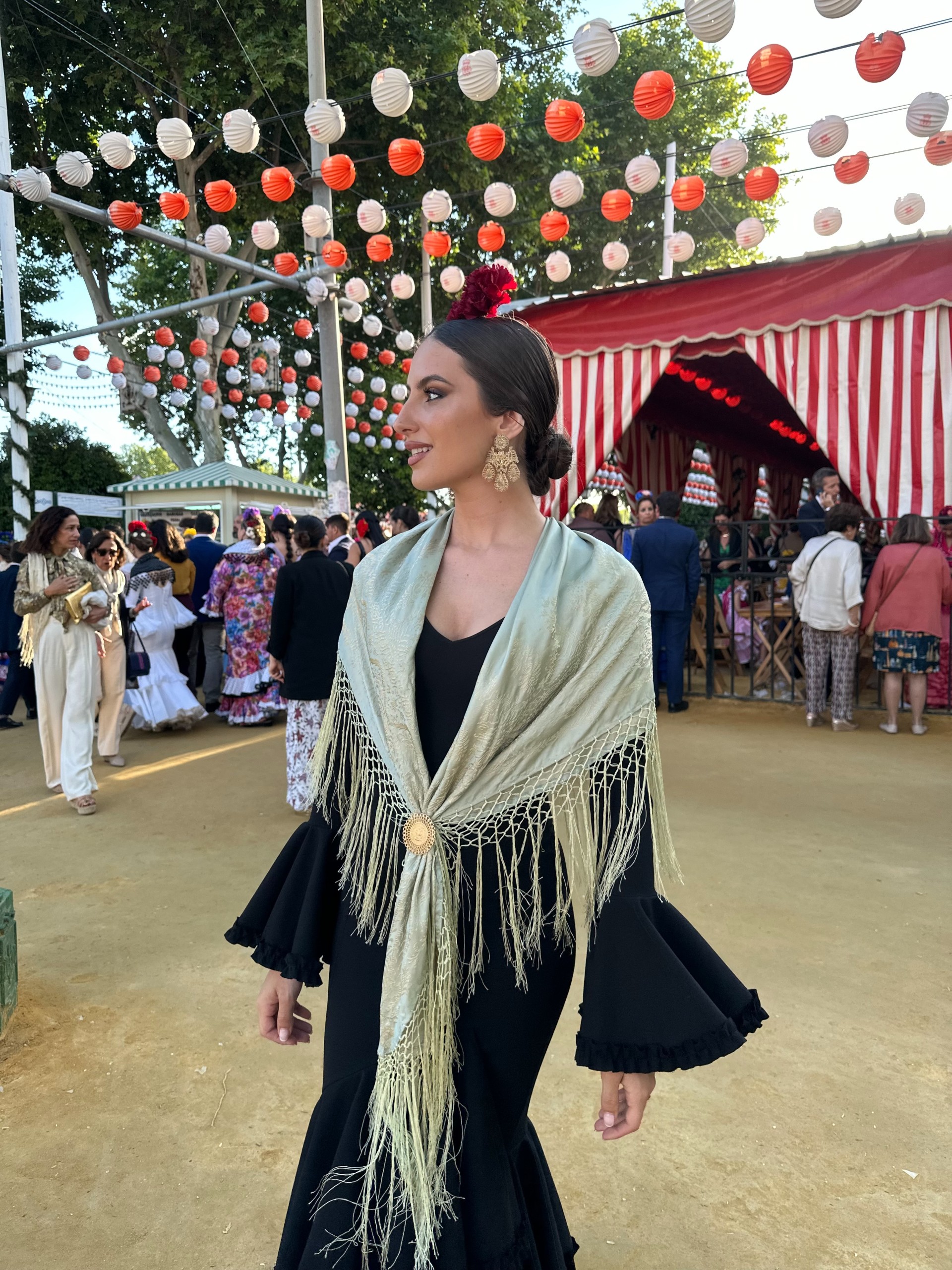 Durante su estancia en la feria, María Estela Arlandis eligió vestirse con el traje tradicional de flamenca, pero quiso incluir pequeños guiños a su tierra natal. Así, lució aderezos de la firma valenciana ArtAntic, en un gesto espontáneo que combinaba respeto y cariño por su pasado fallero.