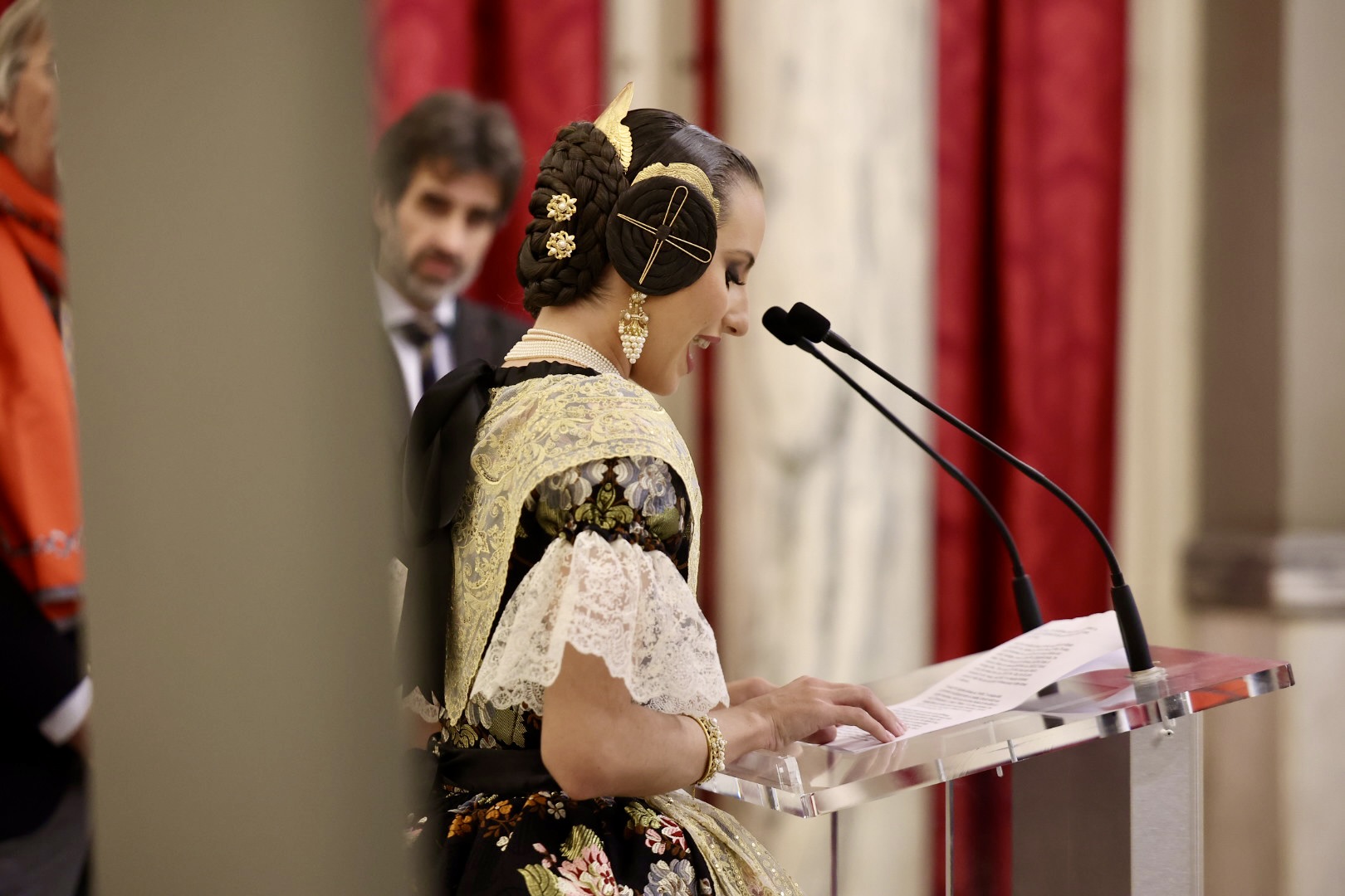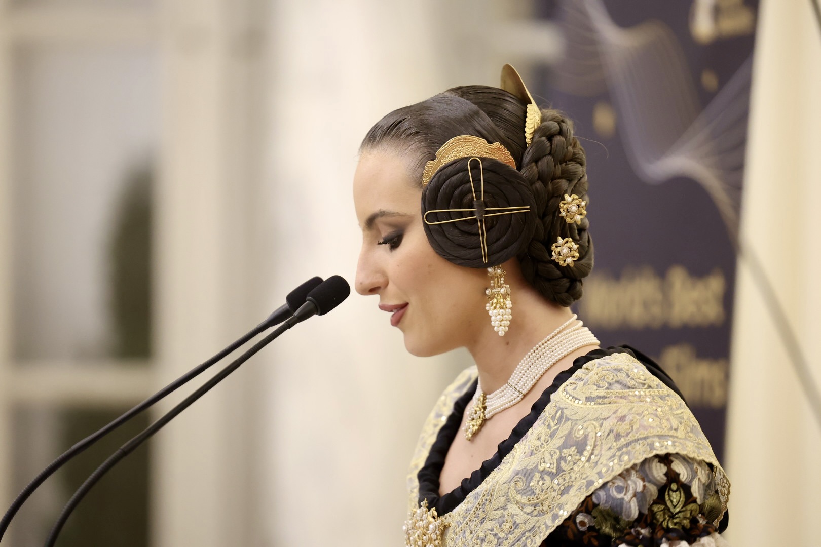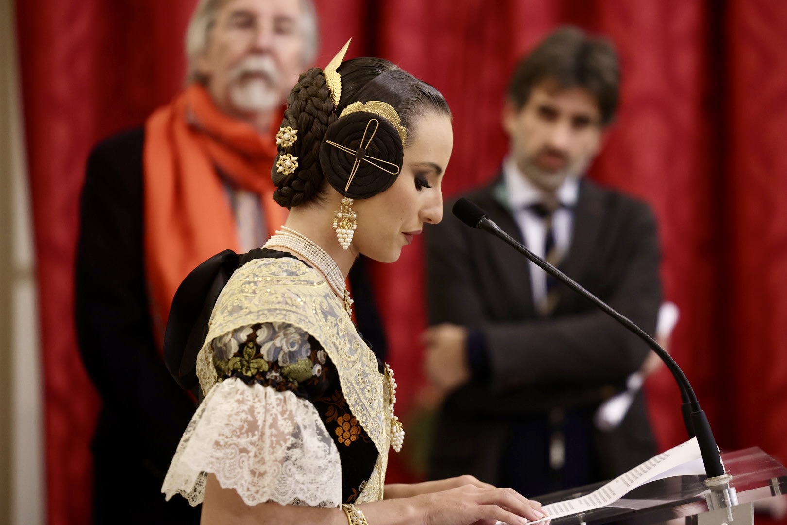 La Fallera Mayor de Valencia María Estela Arlandis ha estrenado este espectacular traje hoy para acudir a la 35 ª edición de una entrega de premios en el Ayuntamiento de Valencia.