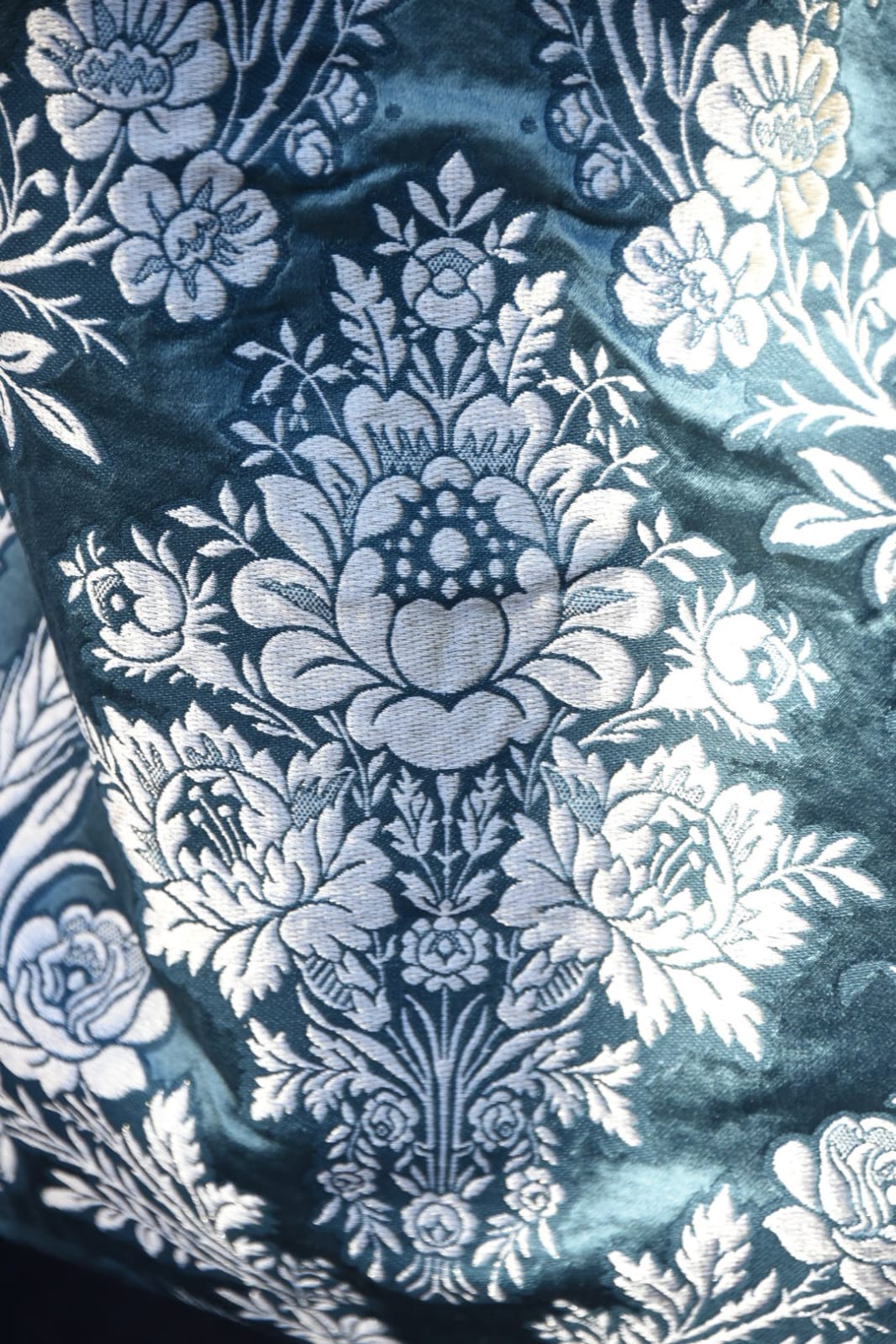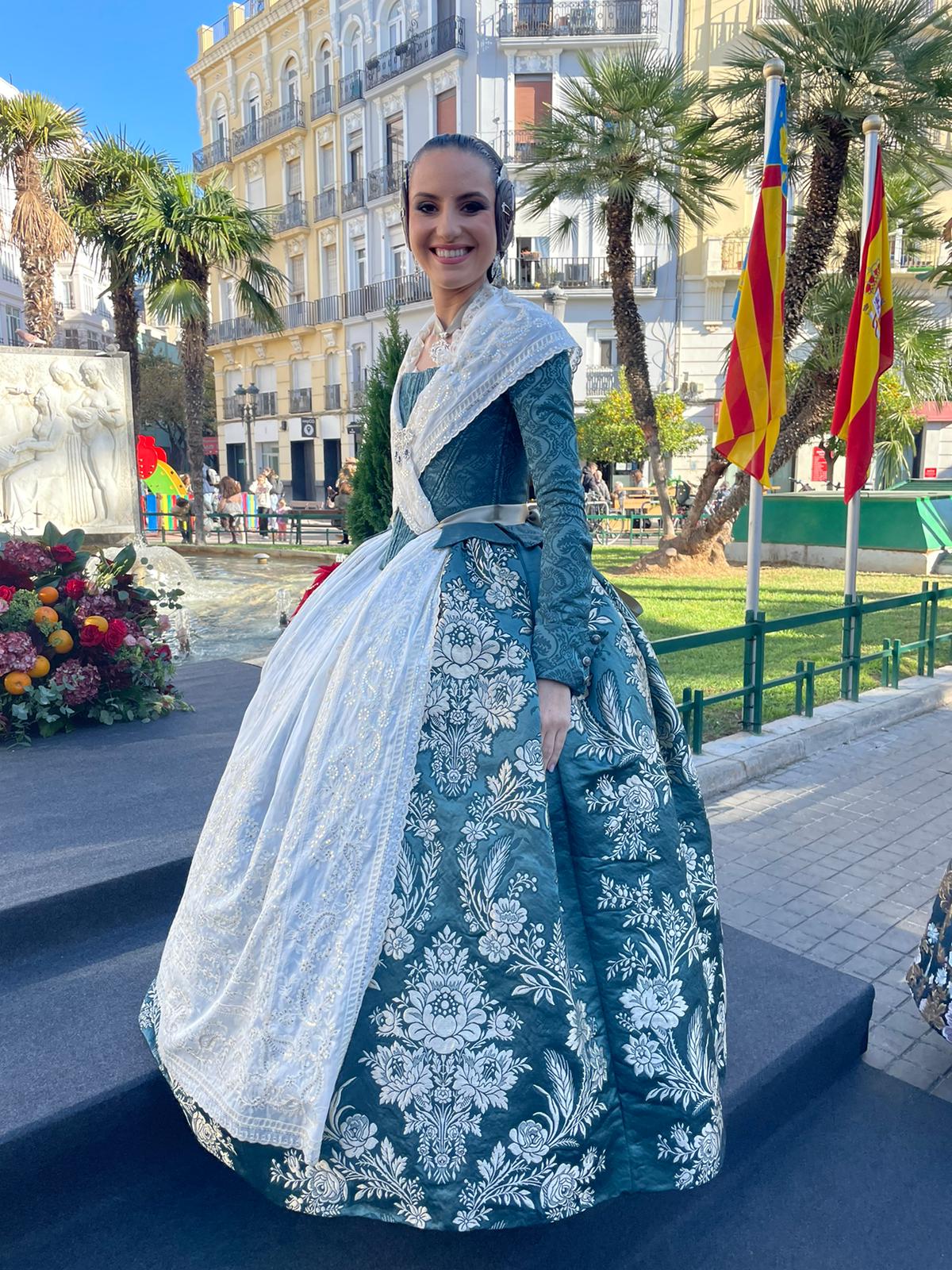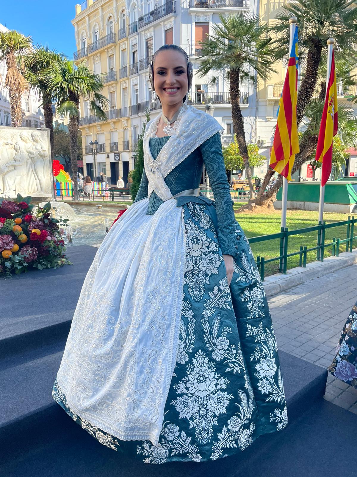 Este domingo, María Estela Arlandis, Fallera Mayor de Valencia 2024 , ha estrenado este espectacular San Felipe. Este especial brocatel de Compañía Valenciana de la Seda, está tejido en seda estrecha,  y ha sido tintado en un color exclusivo para ella, en tono petróleo con metal champange. Para el corpiño, María Estela se ha decantado por un damasco de seda al tono del traje con un puño vuelto abotonado en metal.
