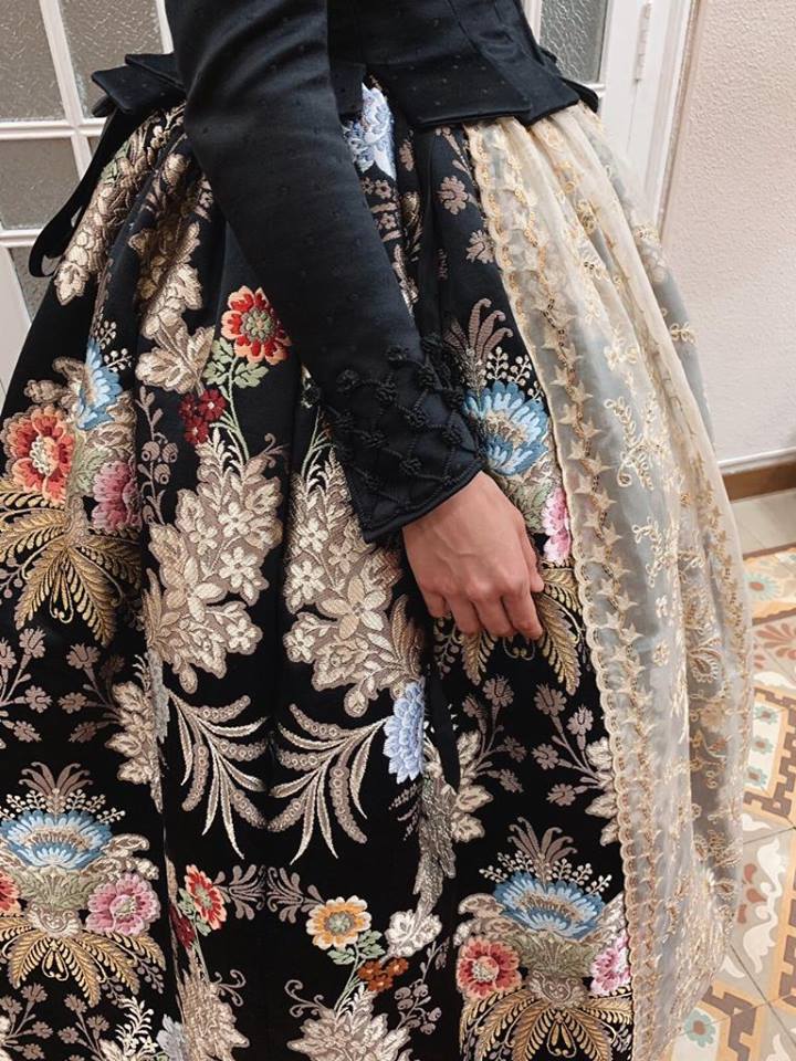 El espolín modelo “Lidón” de la firma Vives y Marí, regalo de su tía Espe, ha sido tejido en negro Azabache como fondo, con 30 colores de trama, la nobleza trabajada en tono topo y dos metales:oro volteado blanco rodeando el dibujo y oro brescado para las espigas de ramo central.