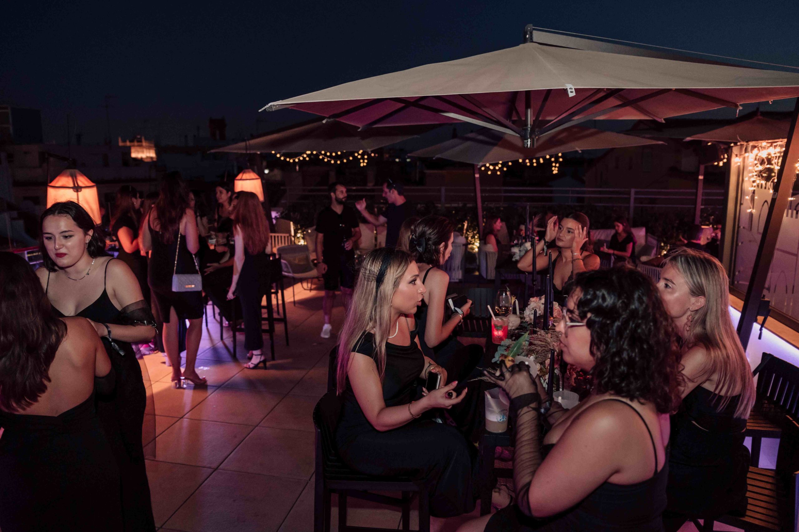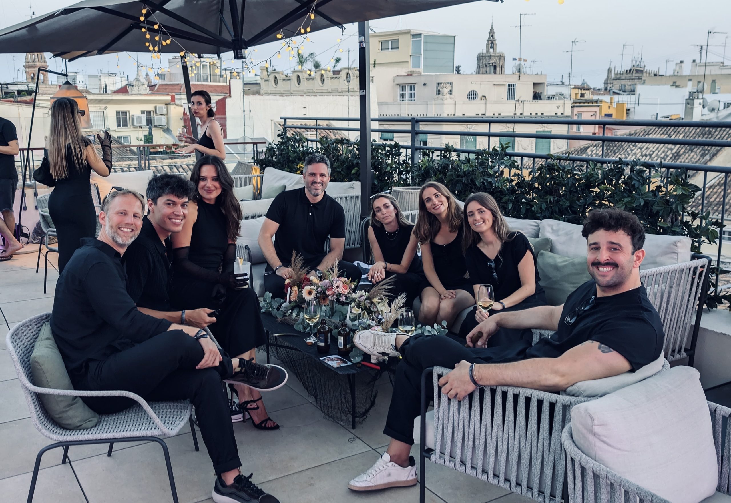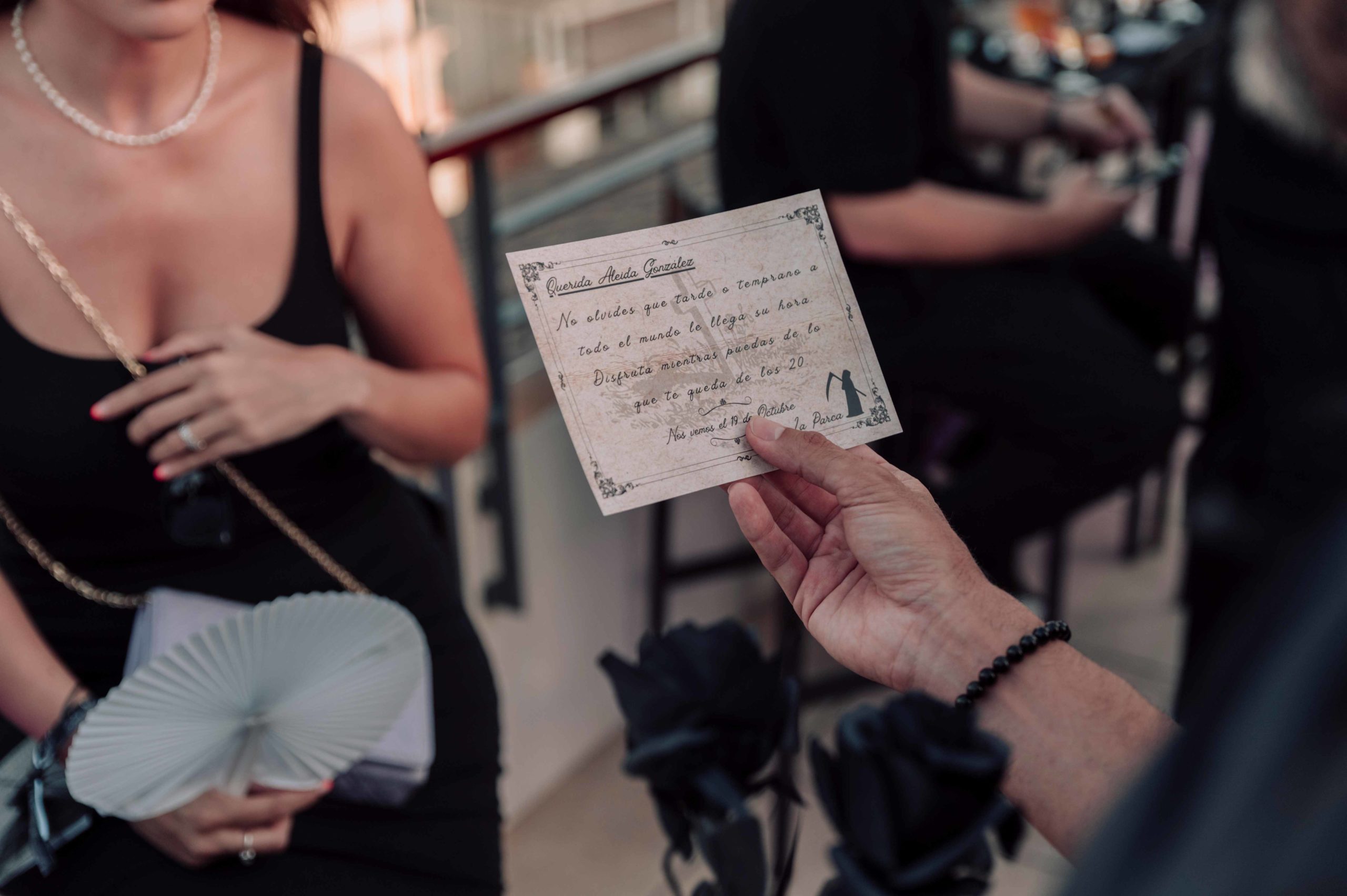 La fiesta se celebró en el rooftop Luna de Valencia del hotel, decorado con una atmósfera lúgubre pero elegante. Al llegar, los invitados fueron recibidos por dos actores, Rafa Martí y Jordi Tamarit de StresdeQuatre, vestidos como La Parca. Estos actores entregaron a cada invitado un Kit Funerario que incluía una carta de bienvenida, una pulsera tematizada, gafas de sol con el eslogan «RIP Twenties», un cacao labial personalizado, un abanico Pai Pai, una ilustración de un pecado capital y una pegatina anatómica.