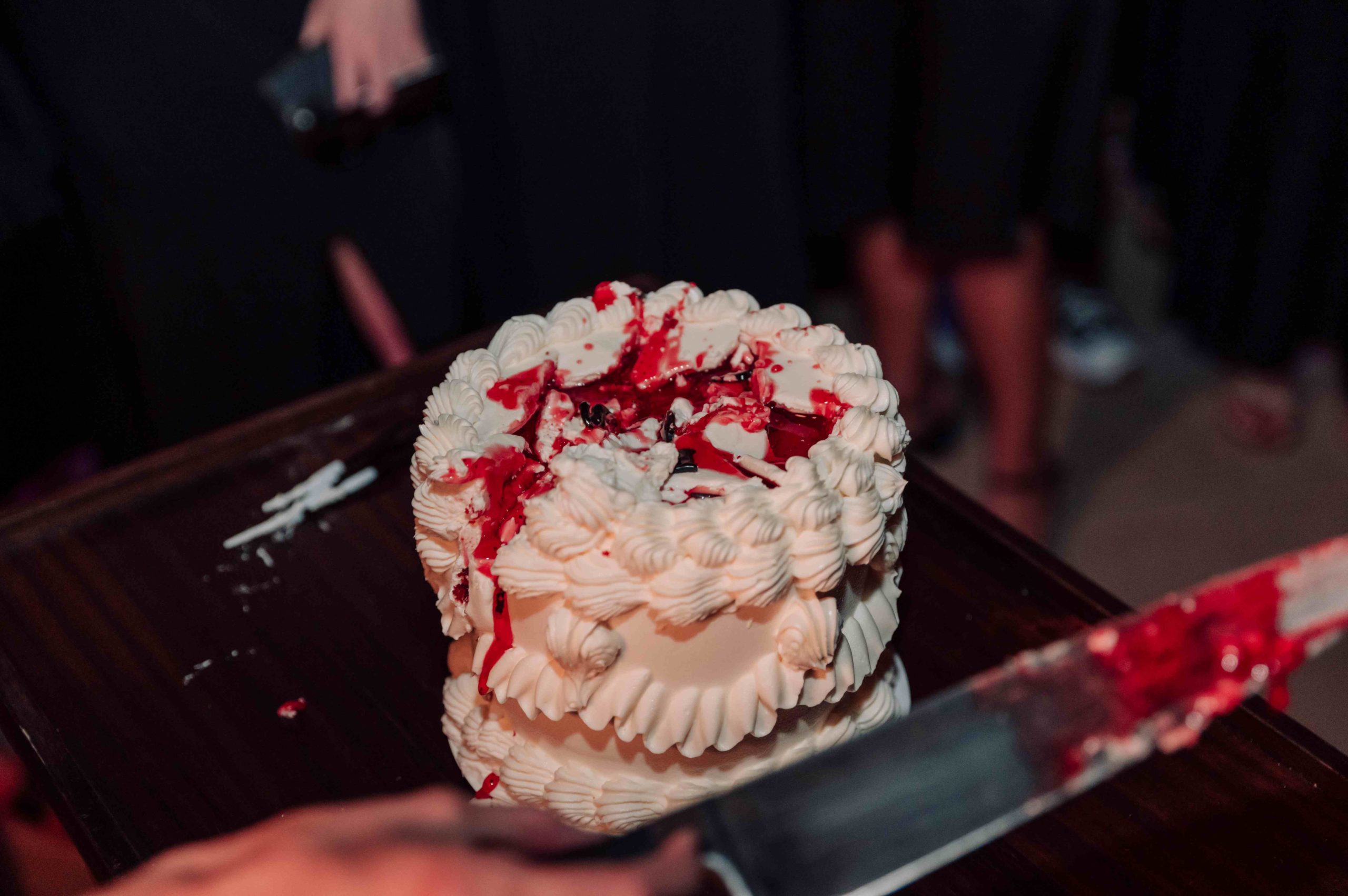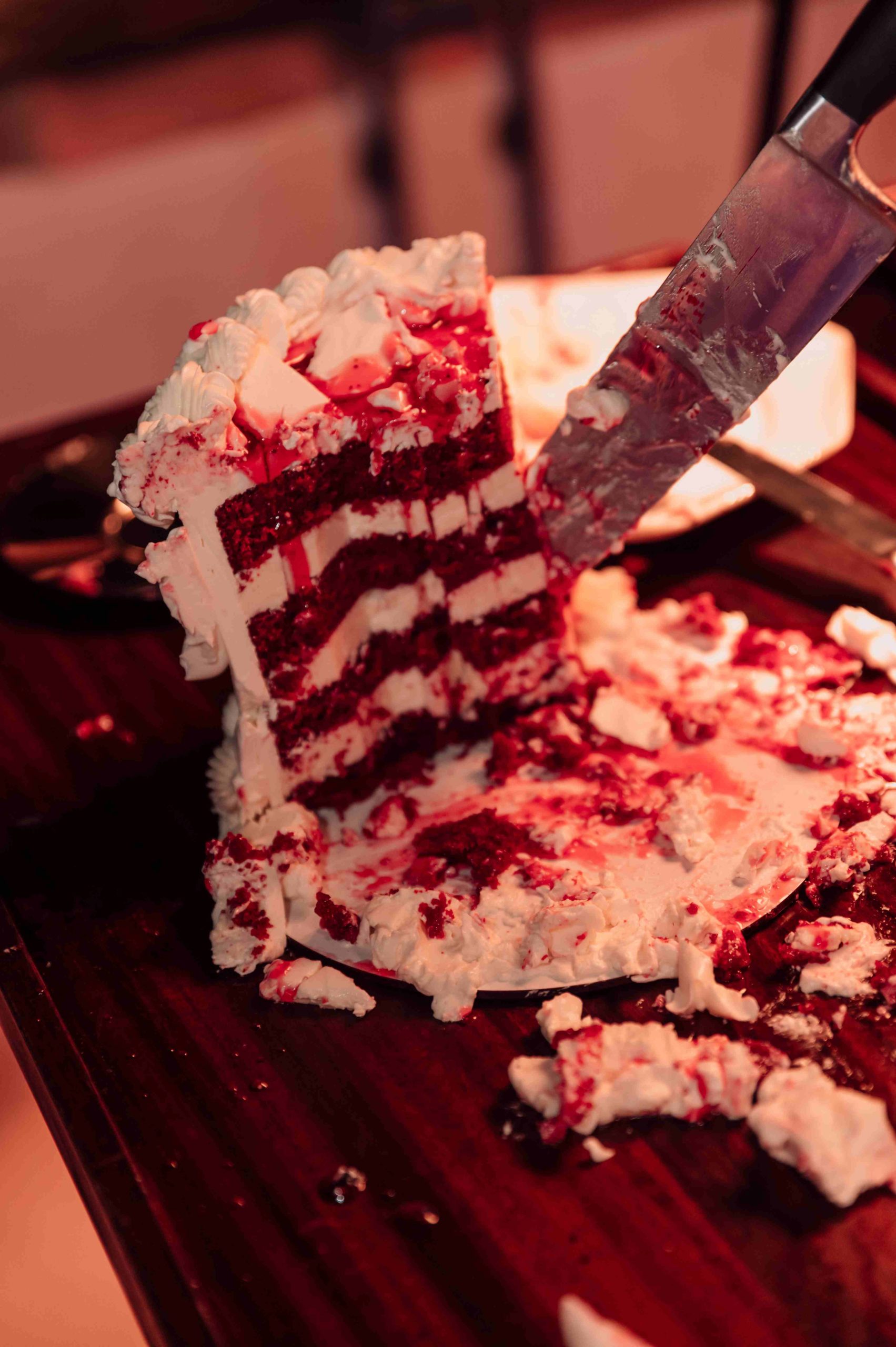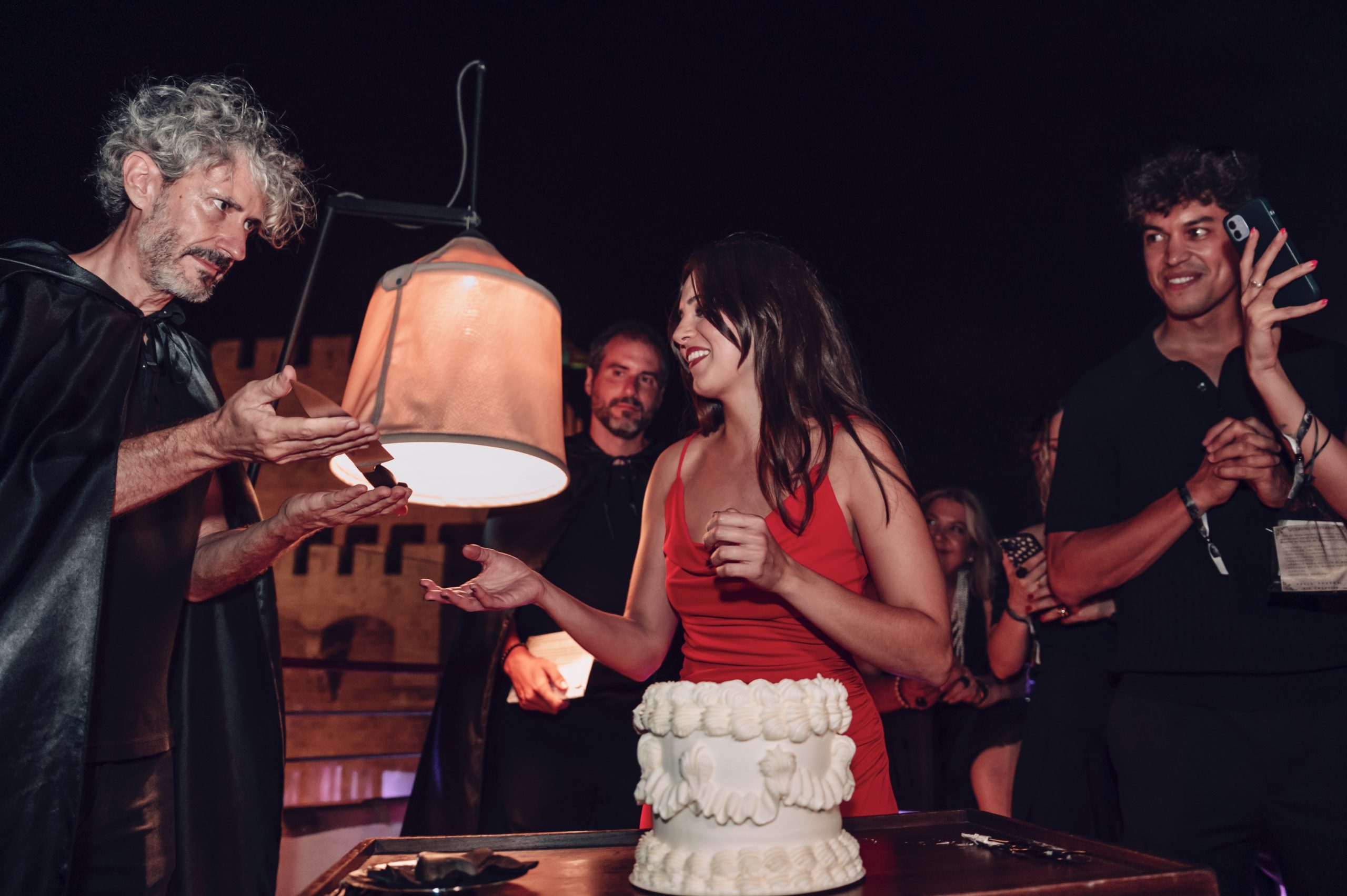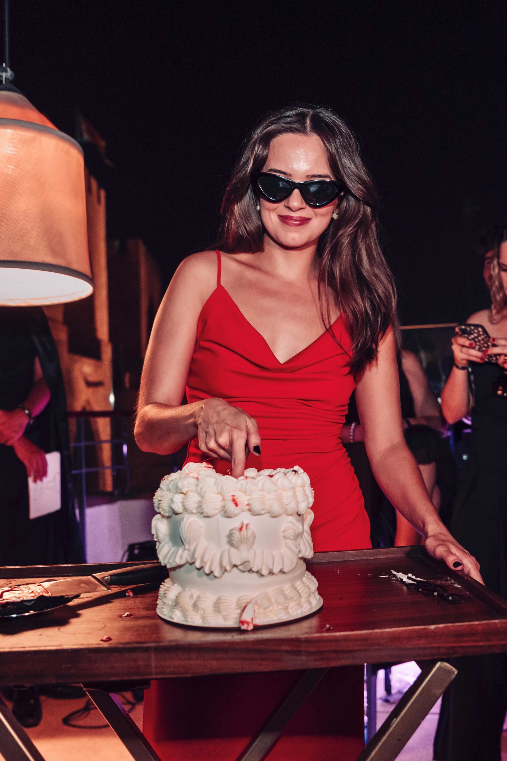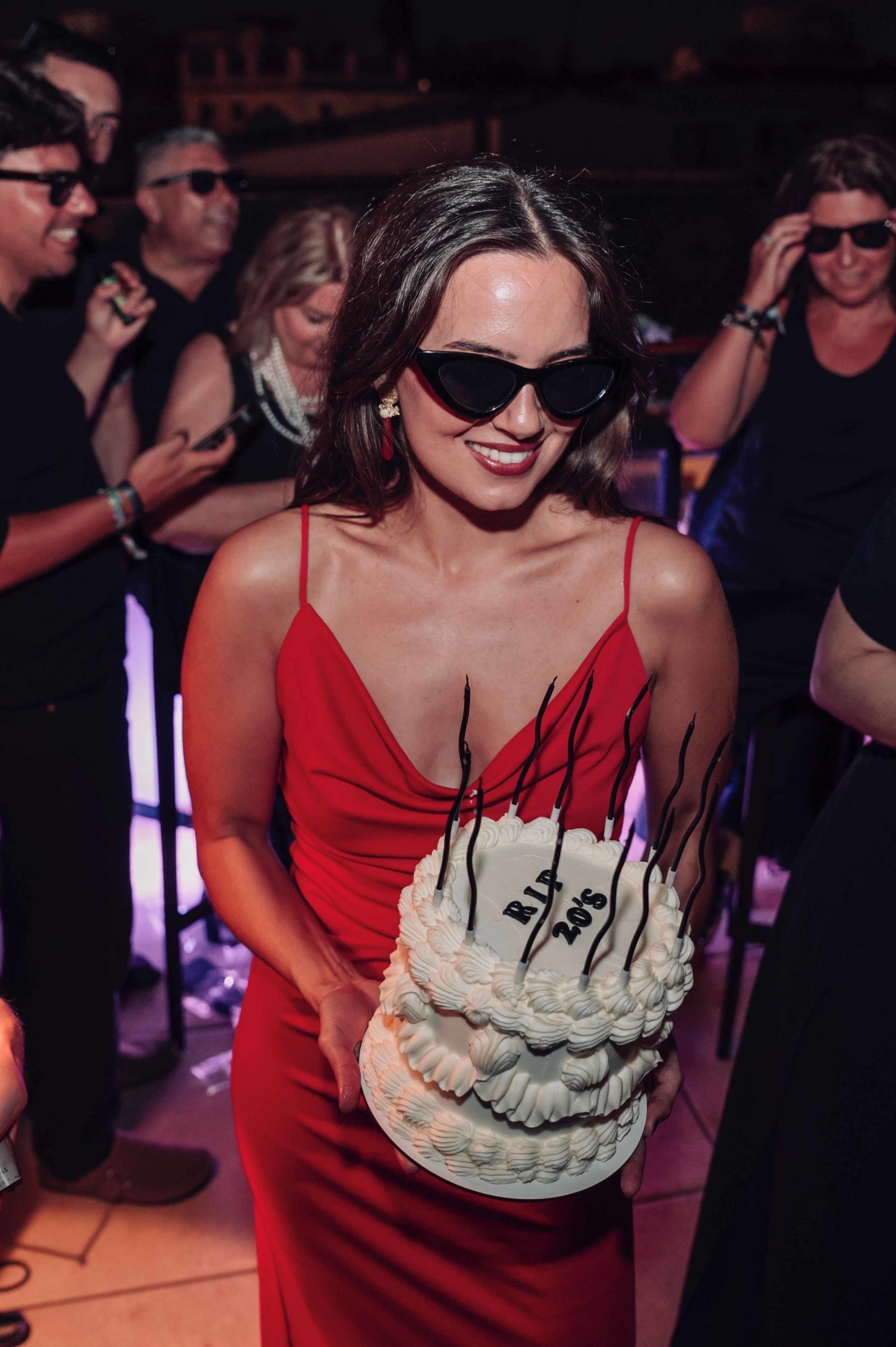 Al caer la noche, el ambiente se volvió más tétrico gracias a las cortinas de luces y focos de luz violeta contratados por Marina. En un momento culminante, Marina se cambió de vestido a uno rojo, simbolizando su renacimiento a los 30. Recibió una tarta blanca clásica con un relleno rojo simulando sangre. Al cortar la tarta, escenificó el fin de sus 20 años, mientras Rafa Martí daba un emotivo discurso de despedida.