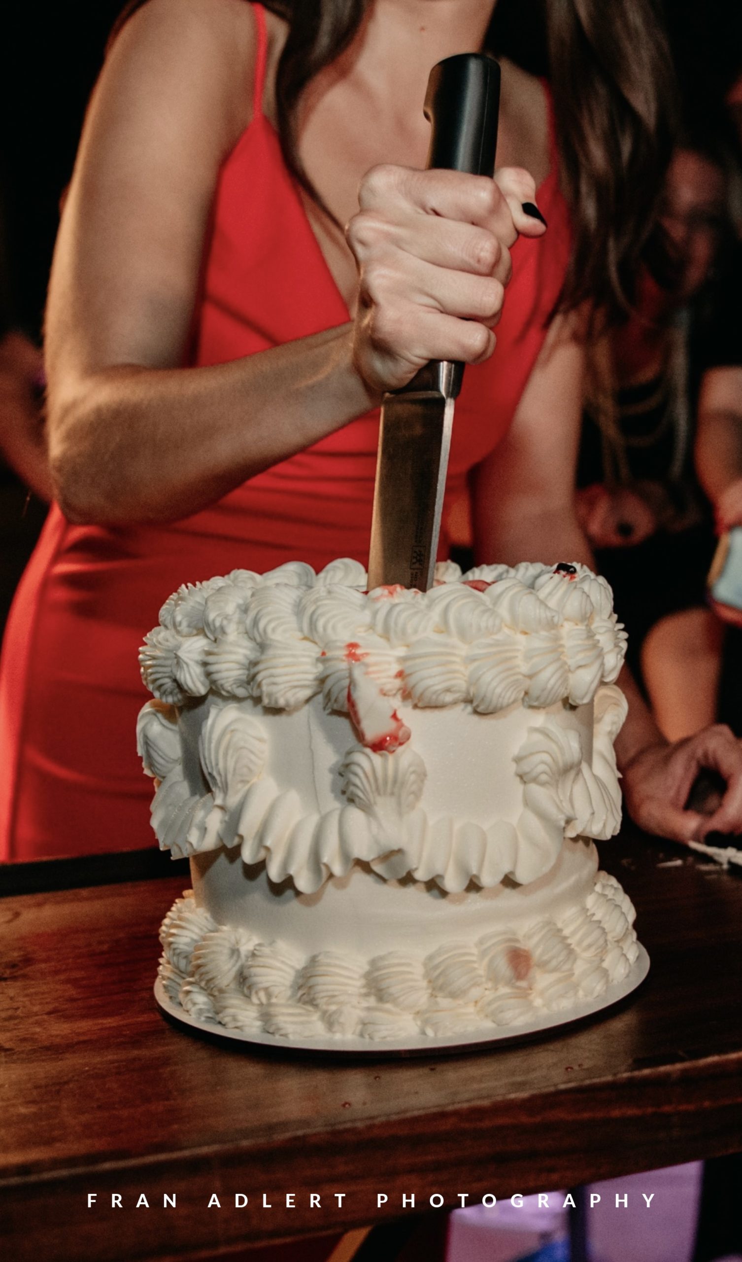 Al caer la noche, el ambiente se volvió más tétrico gracias a las cortinas de luces y focos de luz violeta contratados por Marina. En un momento culminante, Marina se cambió de vestido a uno rojo, simbolizando su renacimiento a los 30. Recibió una tarta blanca clásica con un relleno rojo simulando sangre. Al cortar la tarta, escenificó el fin de sus 20 años, mientras Rafa Martí daba un emotivo discurso de despedida.