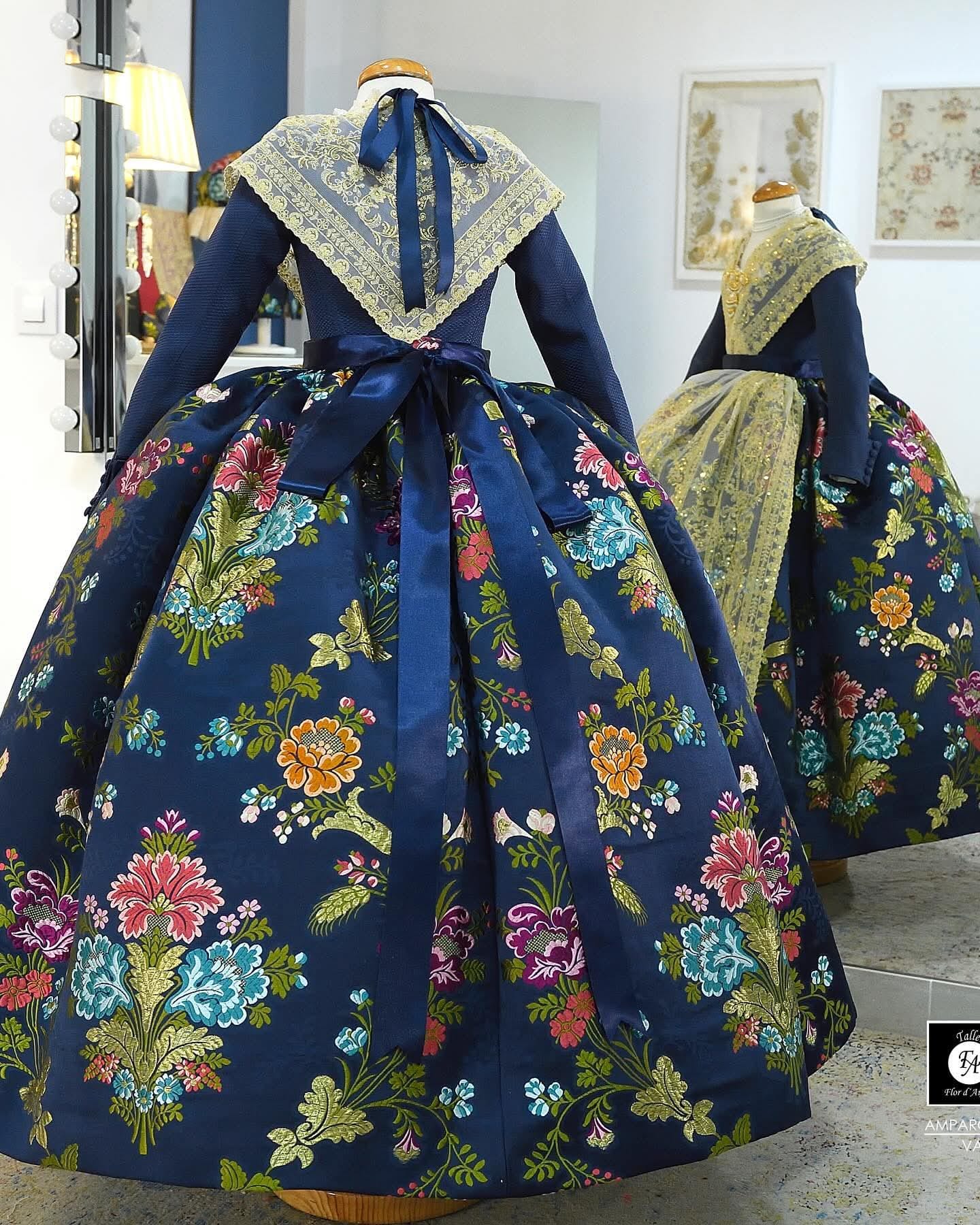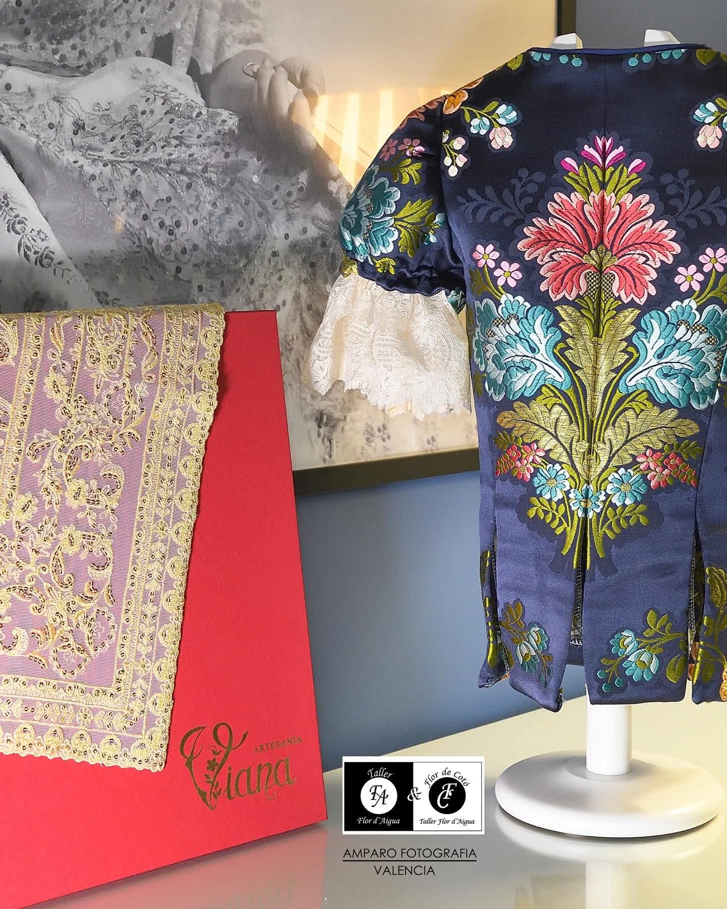 El vestido, confeccionado en seda Preille con fondo Zafiro, de Compañía Valenciana de la Seda refleja la maestría de los indumentaristas de Flor de Cotó, quienes han trabajado con precisión. Las manteletas de Viana aportan un contraste delicado y elegante, completando el conjunto.