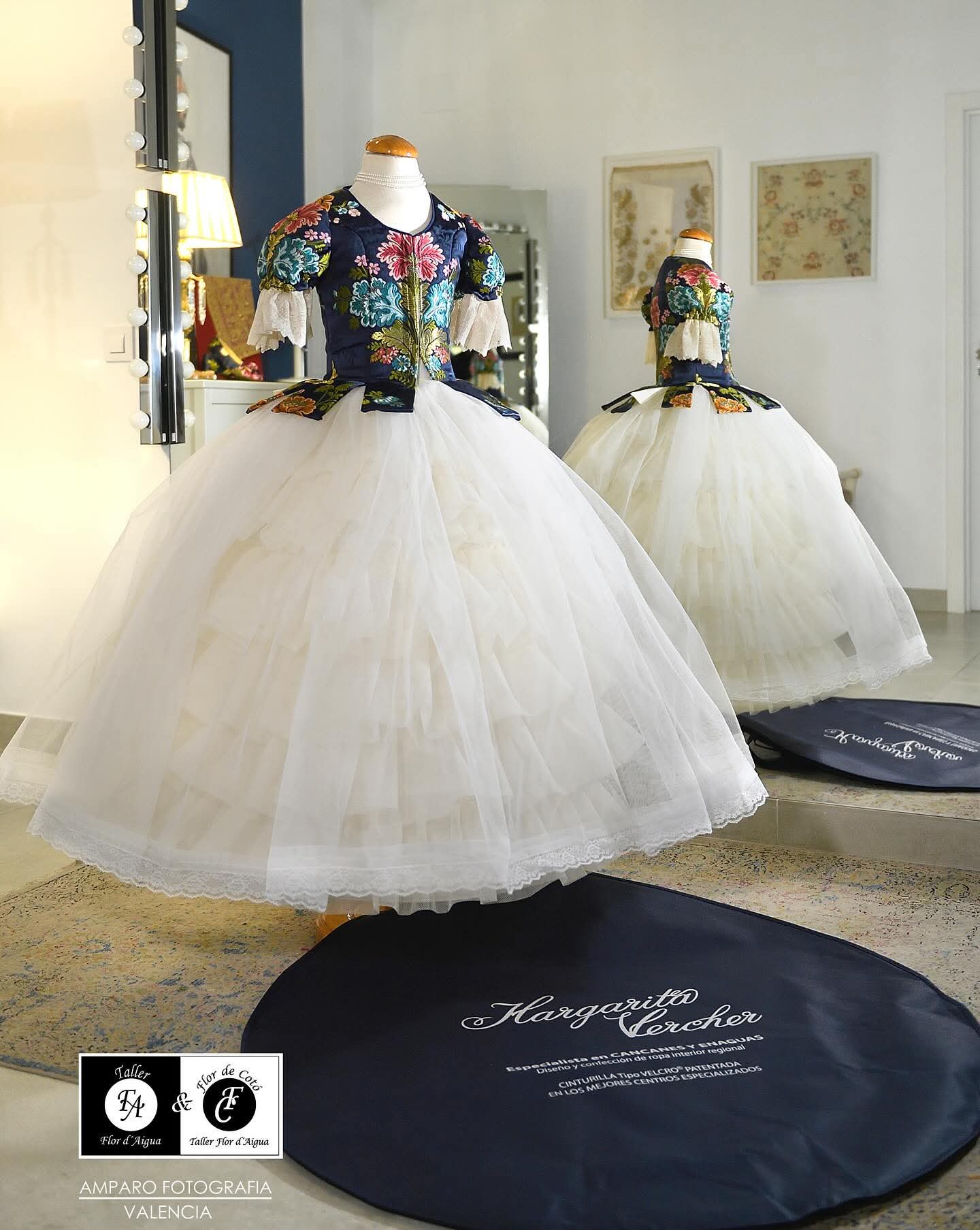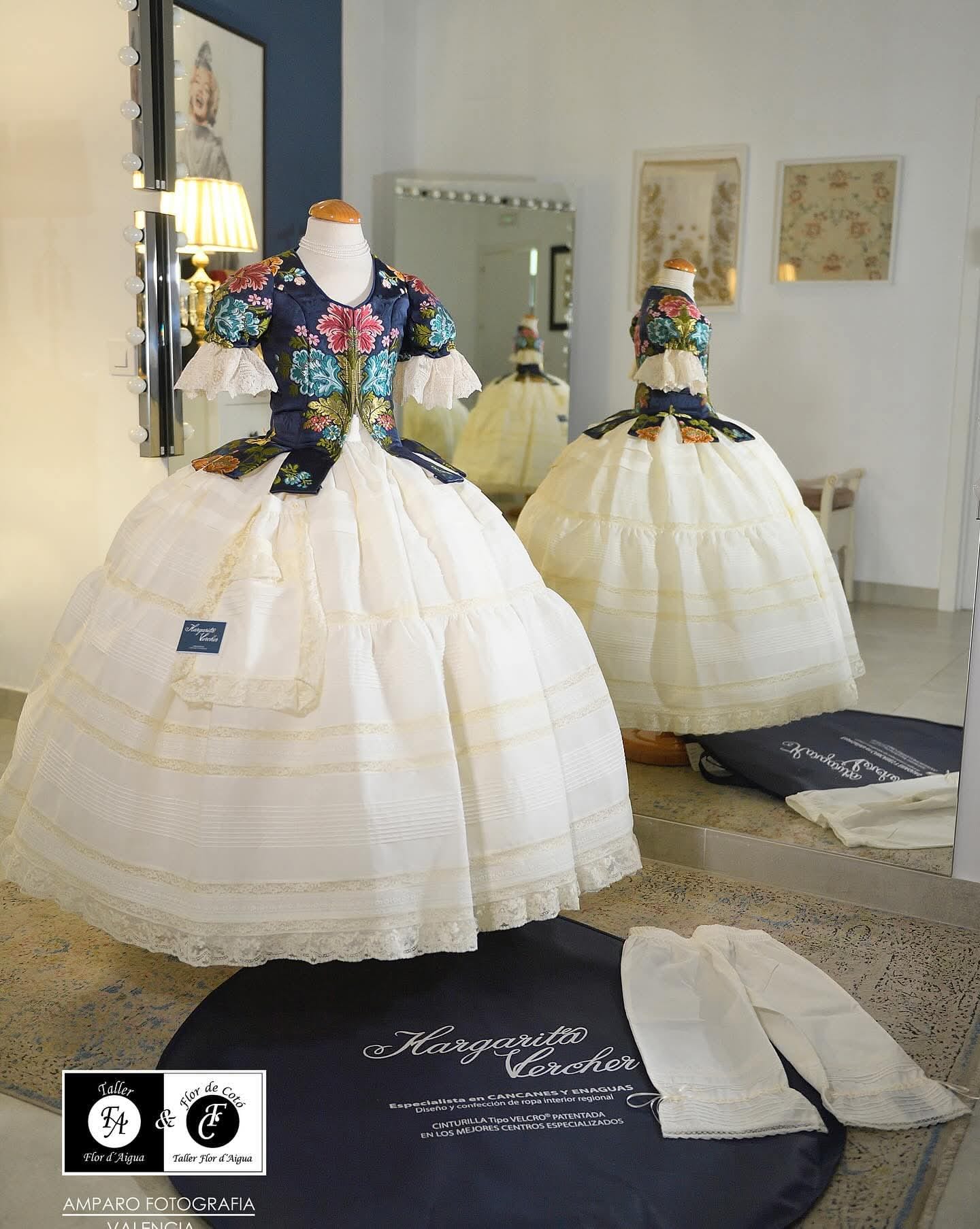El traje se completa con zapatos de Solepiel, y el conjunto se estructura gracias al ahuecador y enagua de Margarita Vercher, que aseguran la forma y volumen perfectos del vestido. La intervención de los indumentaristas de Flor de Cotó garantiza que cada elemento esté perfectamente armonizado, desde el cuerpo del vestido hasta los accesorios más delicados.