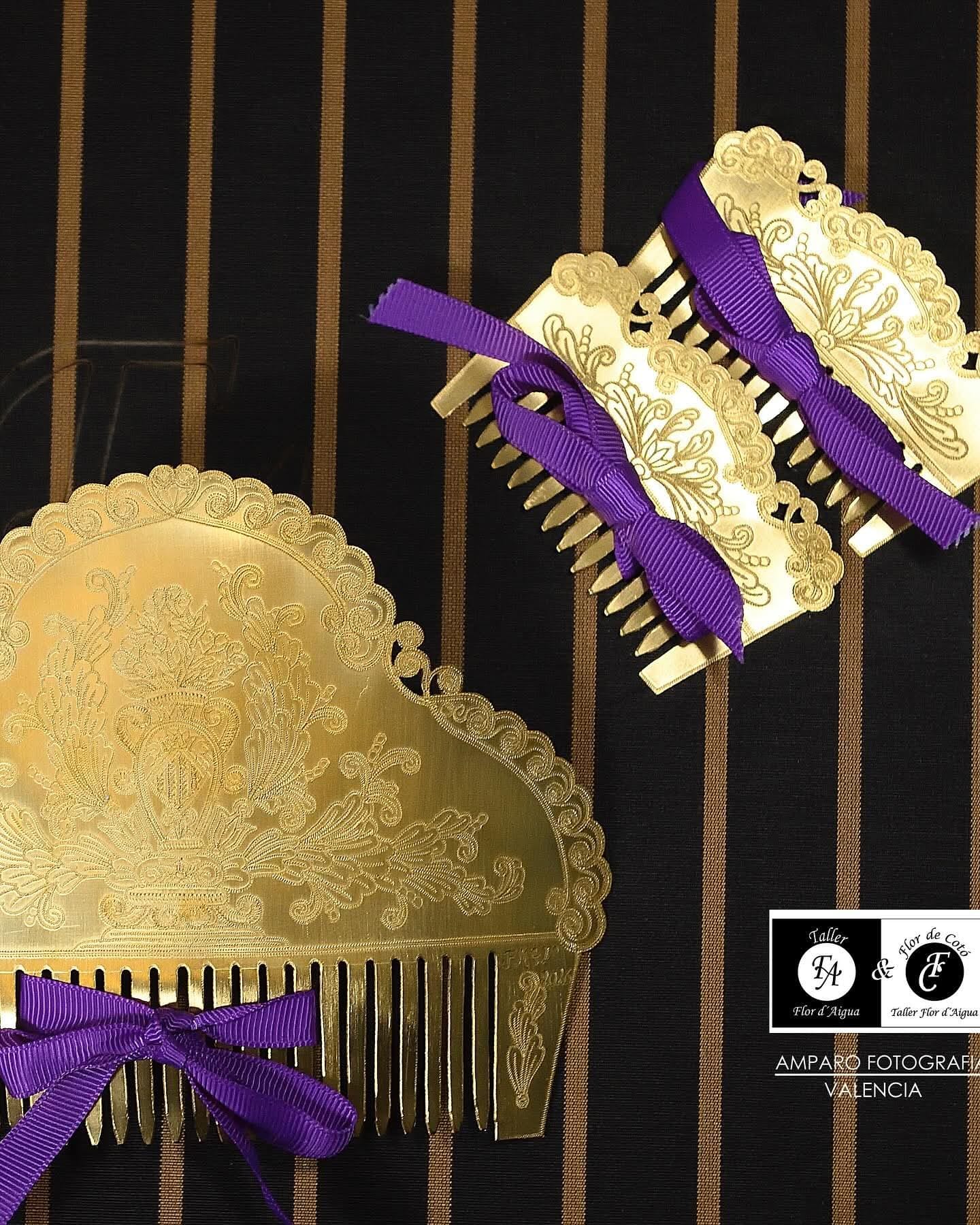 Las peinetas de dibujo exclusivo del Taller Flor d’Aigua y el aderezo de Dalmau realzan la sofisticación del conjunto. Cada pieza ha sido seleccionada por el equipo de Flor de Cotó, que durante años ha sido referencia en indumentaria valenciana, asegurando que la tradición y el estilo artesanal estén presentes en cada detalle.