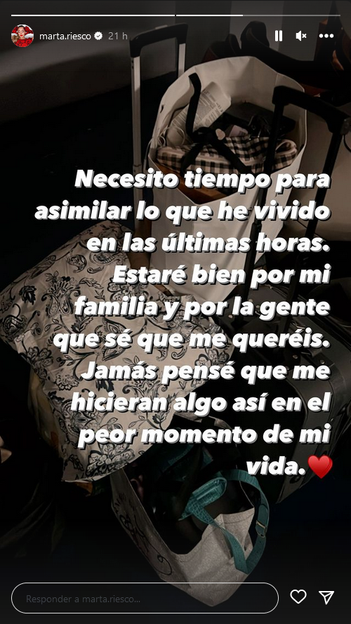 “Necesito tiempo para asimilar lo que he vivido en las últimas horas. Estaré bien por mi familia y por la gente que sé que me queréis. Jamás pensé que me hicieran algo así en el peor momento de mi vida”, añade.