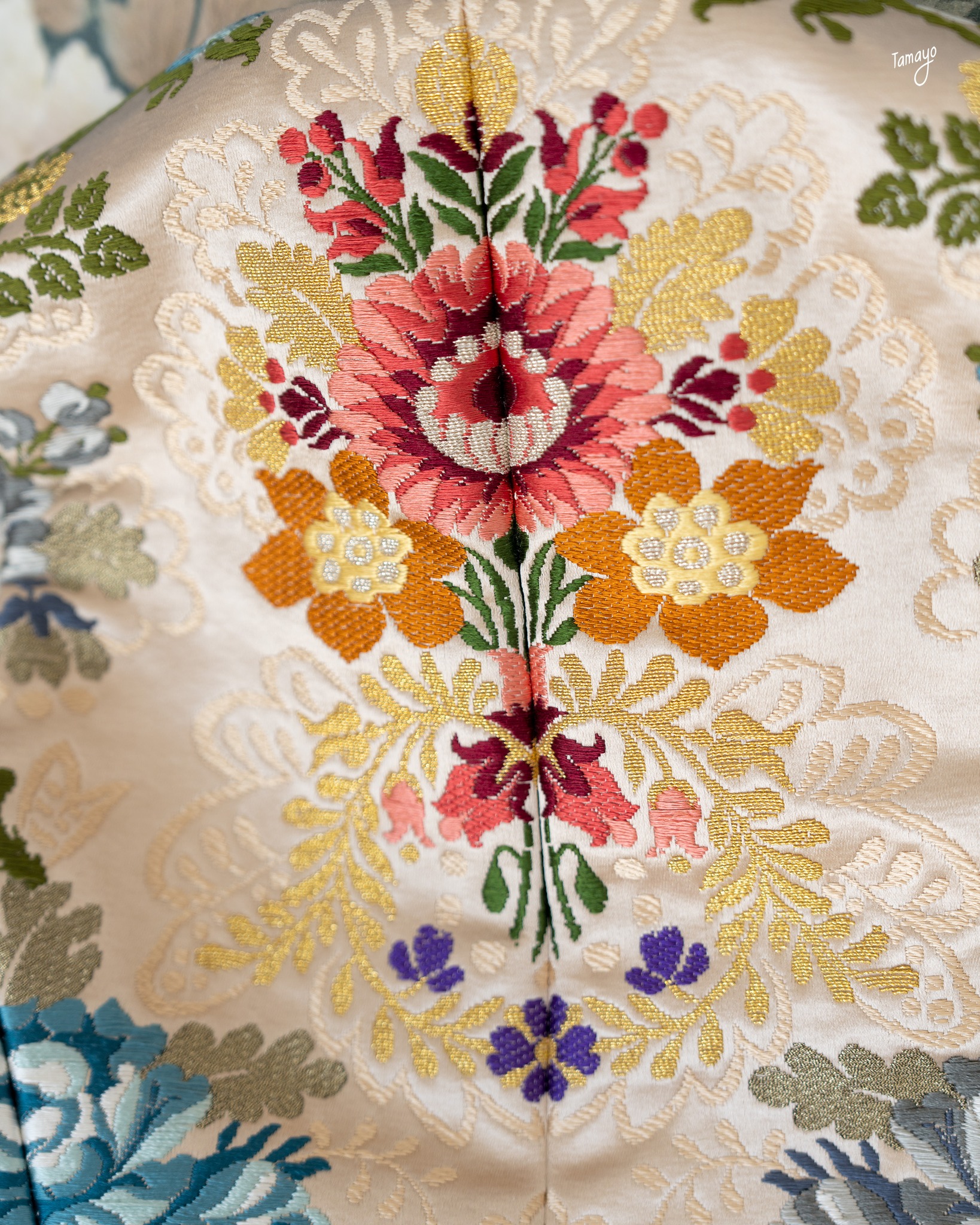 El espectacular espolín de Berta Peiró destaca por su sofisticado diseño en seda natural, con un color de fondo melanzane que mezcla púrpura y marrón, aportando lujo y creatividad. Con 6.210 hilos de urdimbre y 36 colores de trama, incorpora metales como oro volteado y plata vieja, logrando una apariencia cálida y elegante. Sus motivos florales y ornamentales, realzados por tonos dorados, reflejan arte, tradición y una meticulosa creatividad en sus 13 metros de tejido.
