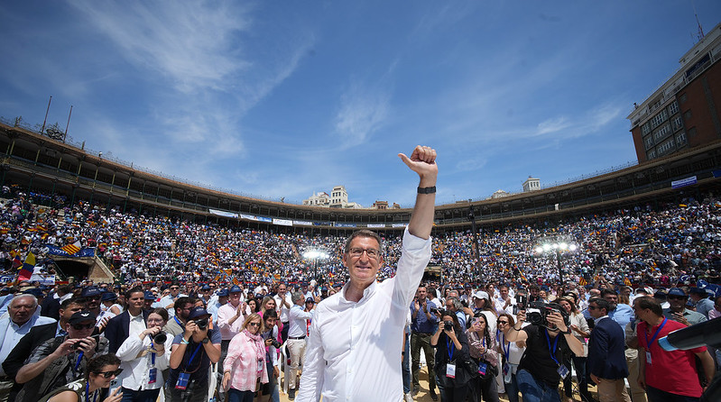 «Este es el cambio que empieza, lo que necesita España», ha afirmado Mazón, quien se ha comprometido trabajar «codo con codo» con Alberto Núñez Feijóo, de quien ha destacado que «hoy debuta» en la plaza de toros de València y ha asegurado que el domingo que viene habrá «un presidente de facto y un presidente de Falcon».