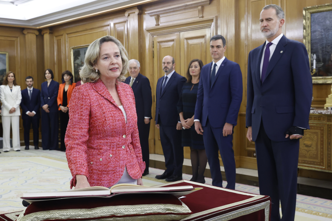 La vicepresidenta primera, Nadia Calviño, ha protagonizado la primera anécdota, puesto que después de la promesa, no tenía claro dónde situarse.