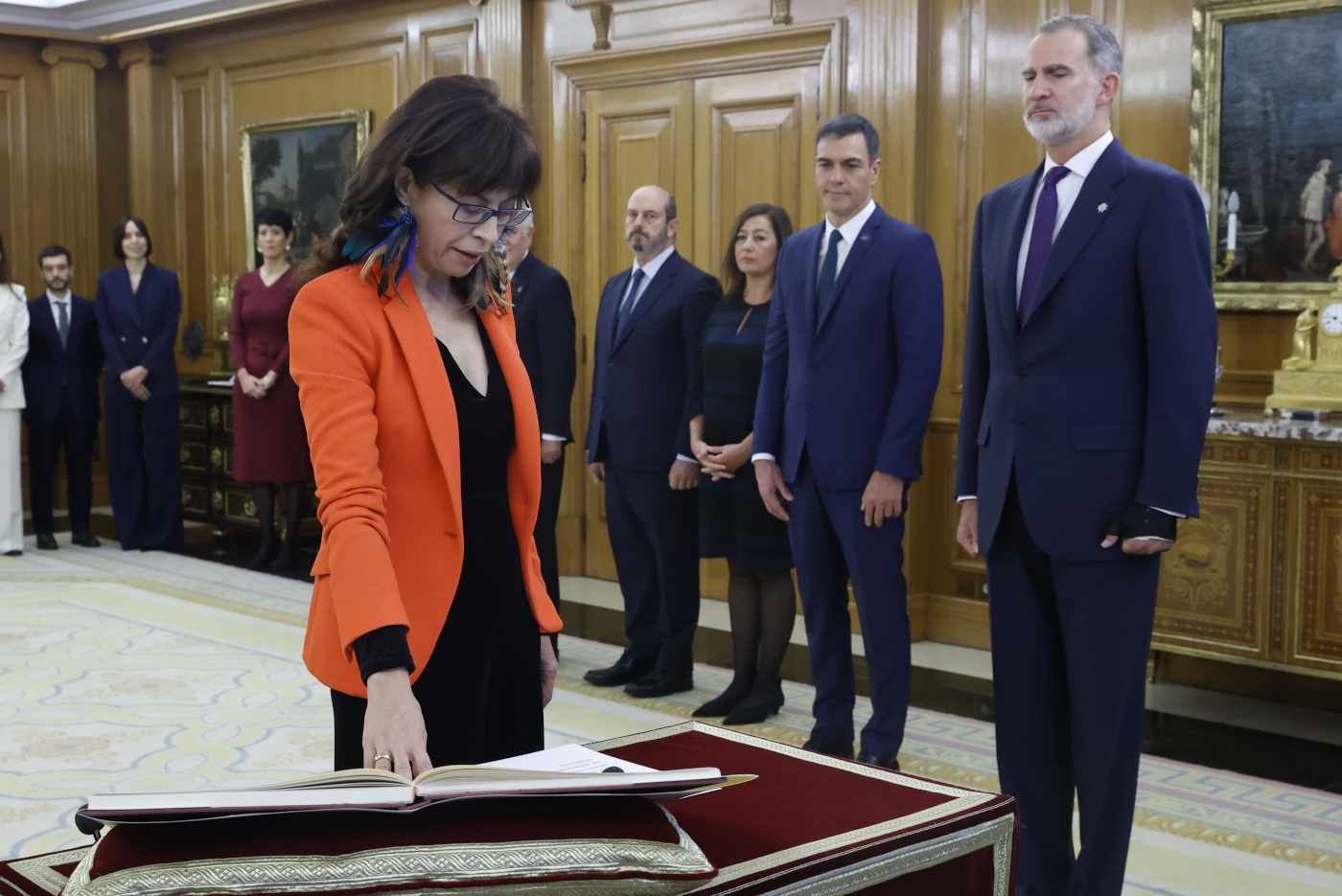 Ante un ejemplar de la Constitución y sin símbolos religiosos, los ministros, de ellos, nueve que se estrenan, han ido desfilando uno a uno por el Salón de Audiencias para leer la fórmula de la promesa ante el monarca y con el presidente del Gobierno, Pedro Sánchez, y los otros poderes del Estado como testigos.