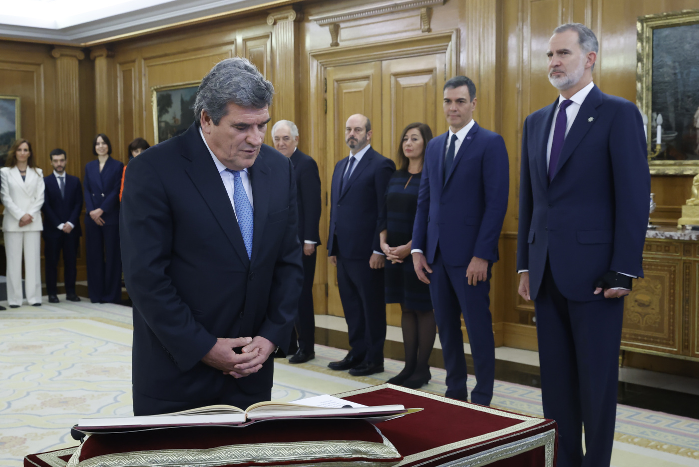 Antes de la promesa, los ministros han pasado por delante de Sánchez y del rey, ante quienes algunos han hecho una inclinación con la cabeza algo más marcada, como Luis Planas (Agricultura), Óscar Puente (Transportes) y la nueva responsable de Sanidad, Mónica García, de Sumar.