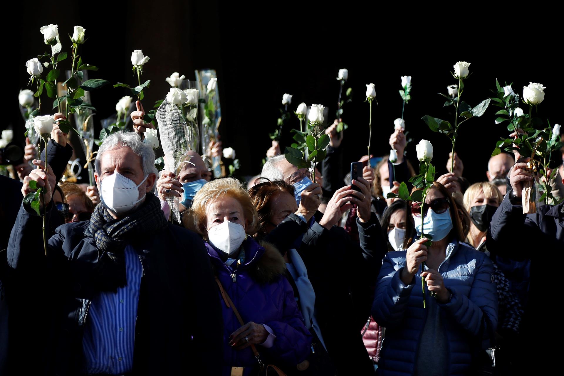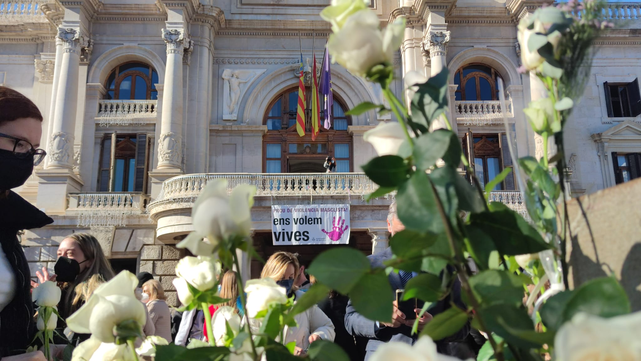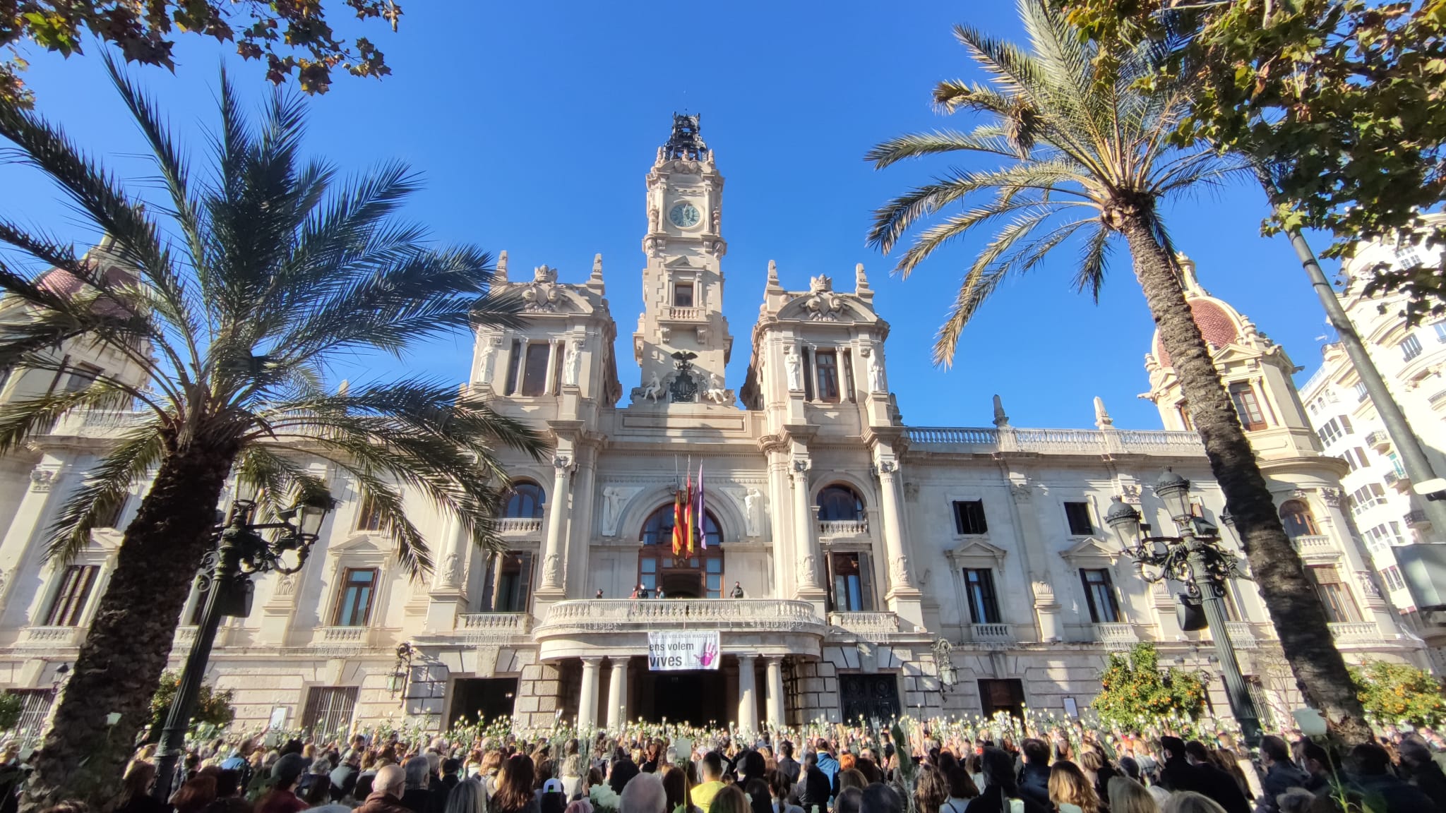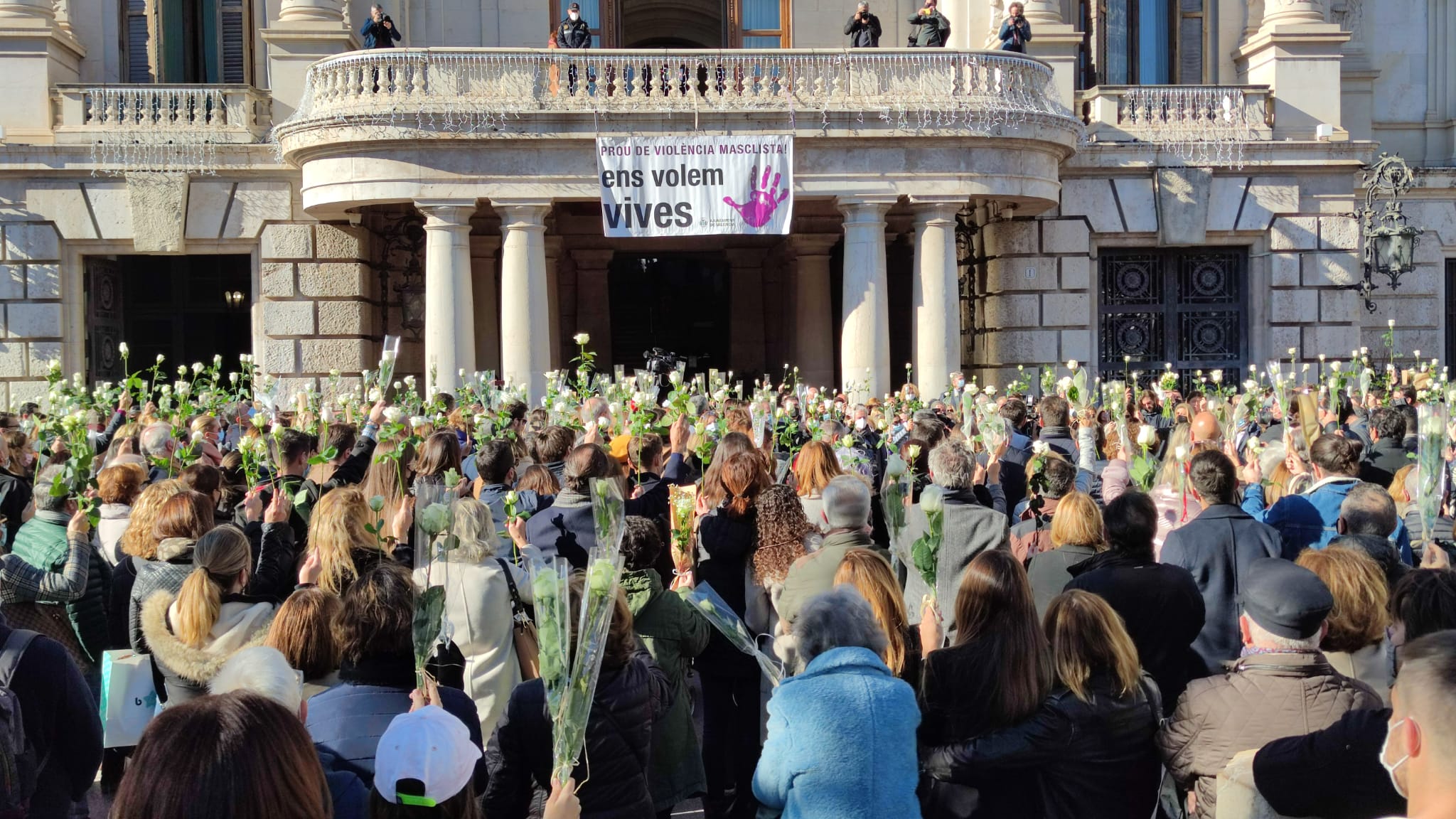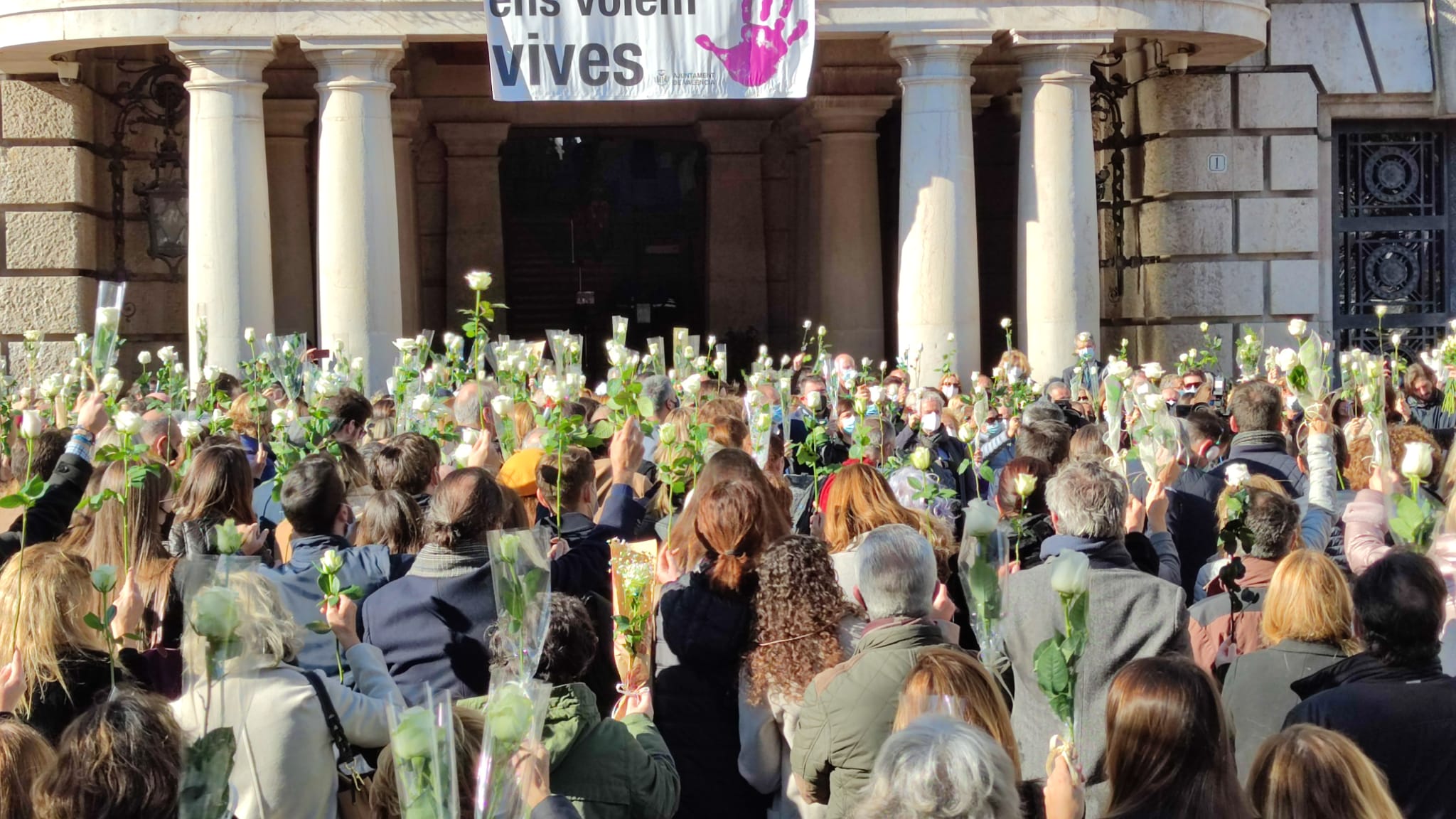 Centenares de personas se han concentrado este jueves en la plaza del Ayuntamiento de València para rendir un homenaje a Cristina, asesinada supuestamente por su pareja el pasado sábado, y lo han hecho portando rosas blancas, una de las flores preferidas de la joven valenciana.EFE/ Miguel Ángel Polo