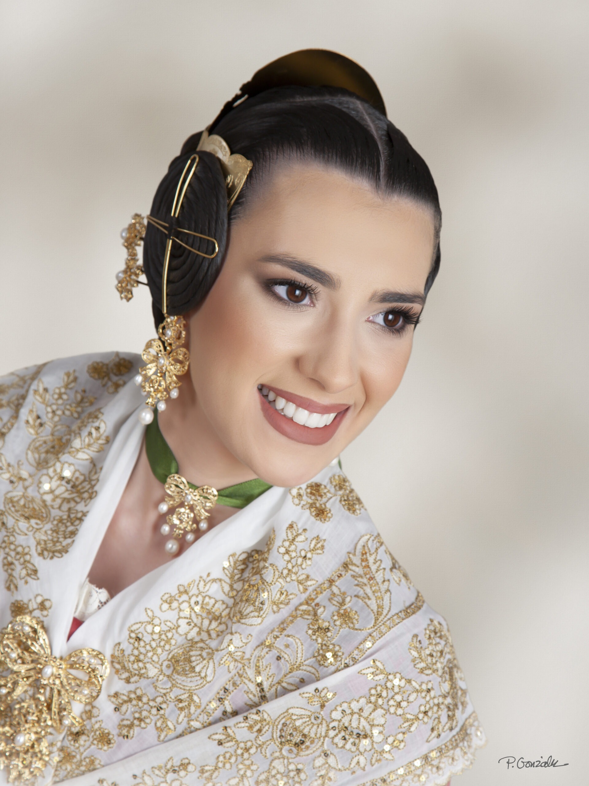 La imagen que ha conquistado a la actriz muestra a Trini luciendo un conjunto con alma y linaje: un guardapiés de seda verde original del siglo XIX, un jubón de tafetán de seda oro albero y unas manteletas de palmas bordadas en cadeneta sobre tul de algodón que ya llevó su madre, Hortensia Roig, en 1993, cuando formó parte de la Corte de Honor de la Fallera Mayor de València.