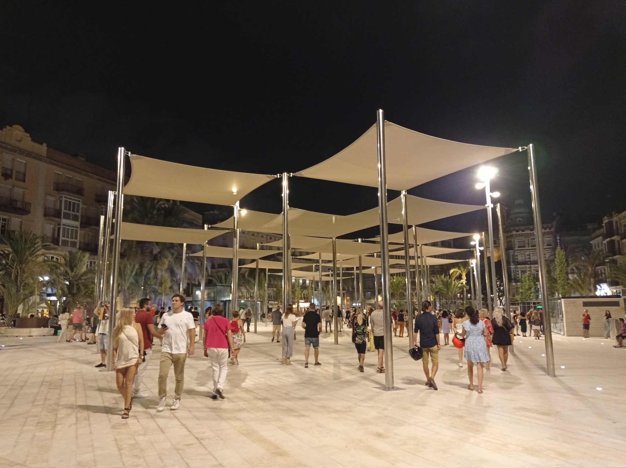 Además de la pavimentación de la plaza con piedra calcárea antideslizante de tonalidades que ayudan a no absorber el calor -el mismo material con el que se construyó la Catedral-, los trabajos realizados incorporan una zona de juegos infantiles, toldos de diferentes alturas, lavabos públicos, 1.378 arbustos y 115 árboles.