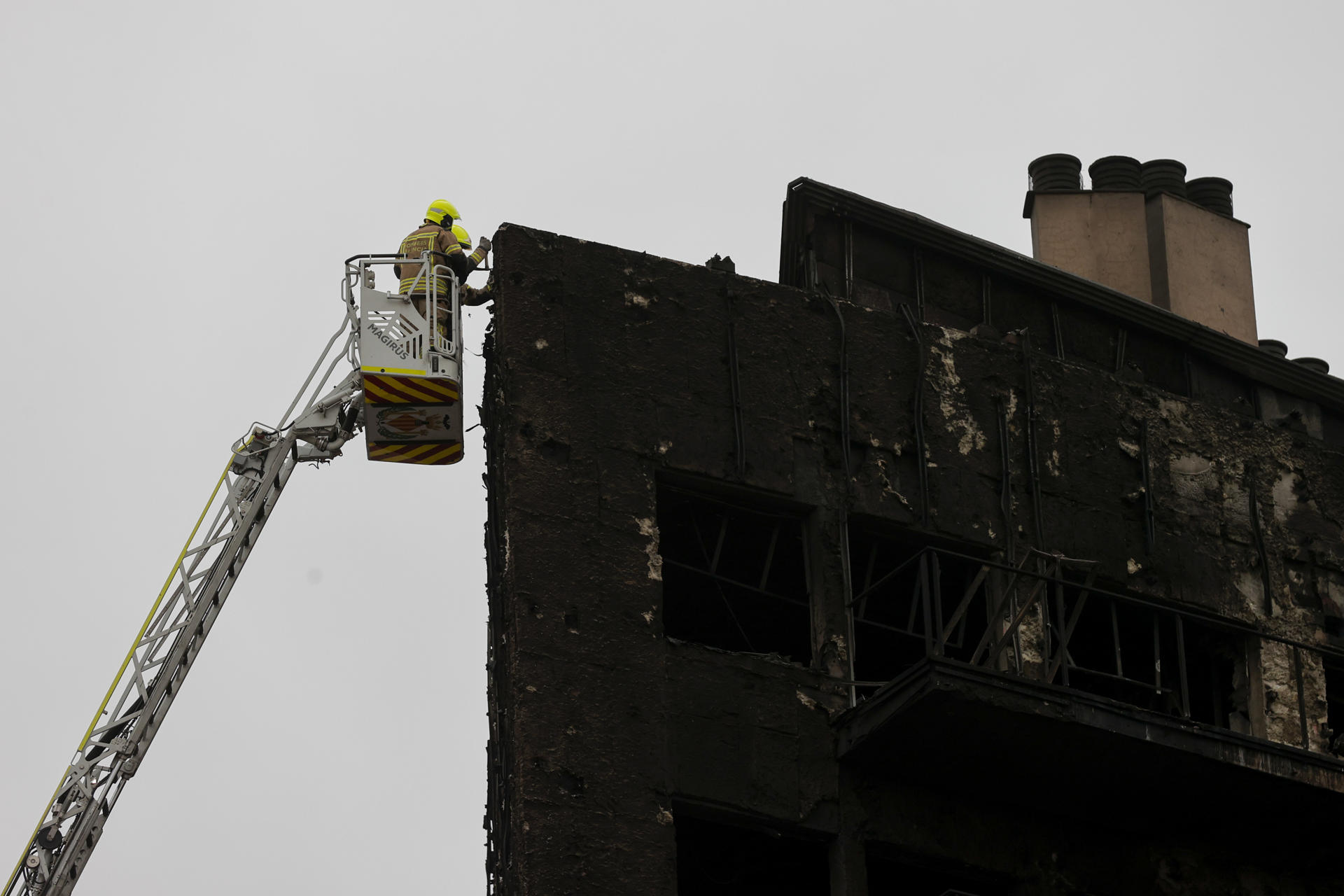 Bomberos trabajan en el edificio siniestrado en el barrio valenciano de Campanar, que intenta retomar el pulso vital este lunes, cuatro días después del incendio que se cobró la vida de diez personas. EFE/Manuel Bruque