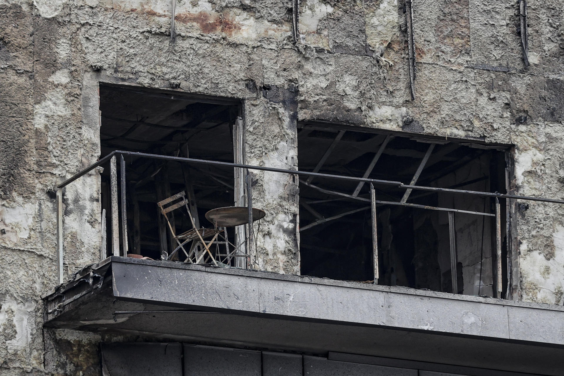 Una silla y una mesa de exterior ennegrecidos por el fuego en las viviendas del edificio calcinado en el barrio de Campanar de València. EFE/Manuel Bruque
