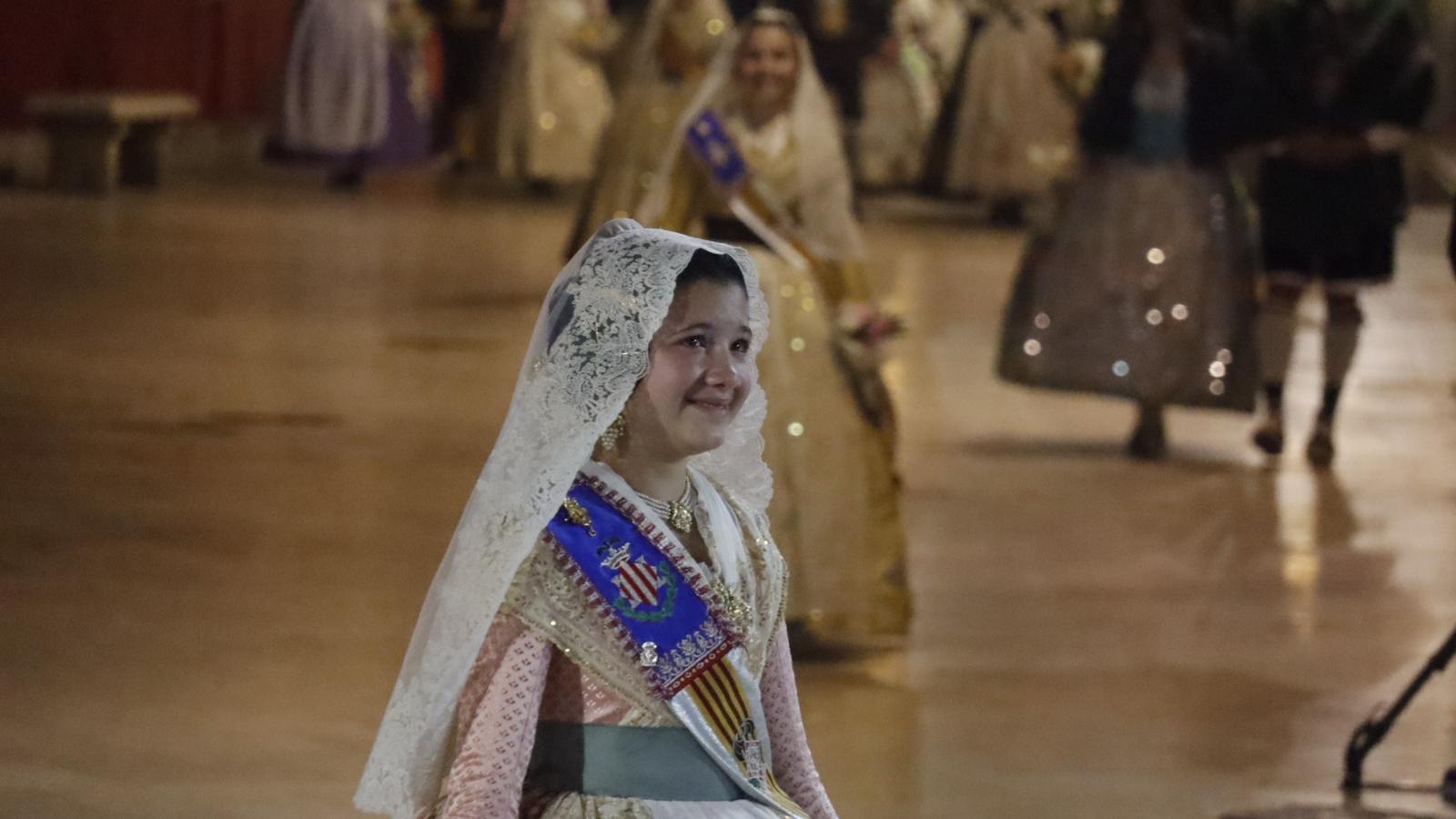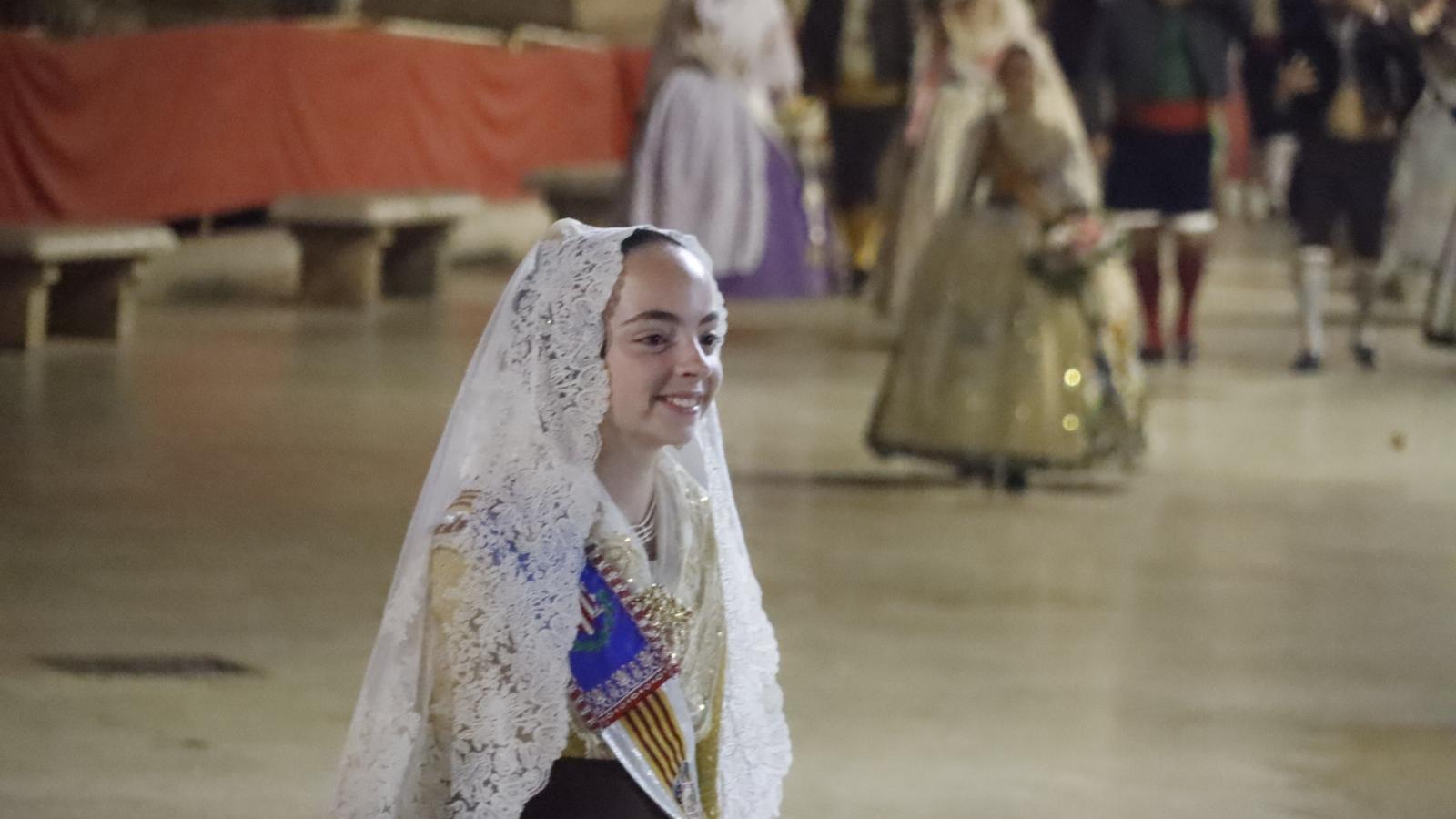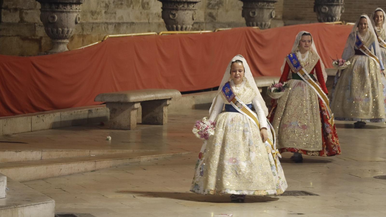 Tras finalizar la primera jornada de la Ofrenda floral fallera a la Mare de Déu, la Fallera Mayor Infantil y su Corte accedieron a la Basílica.