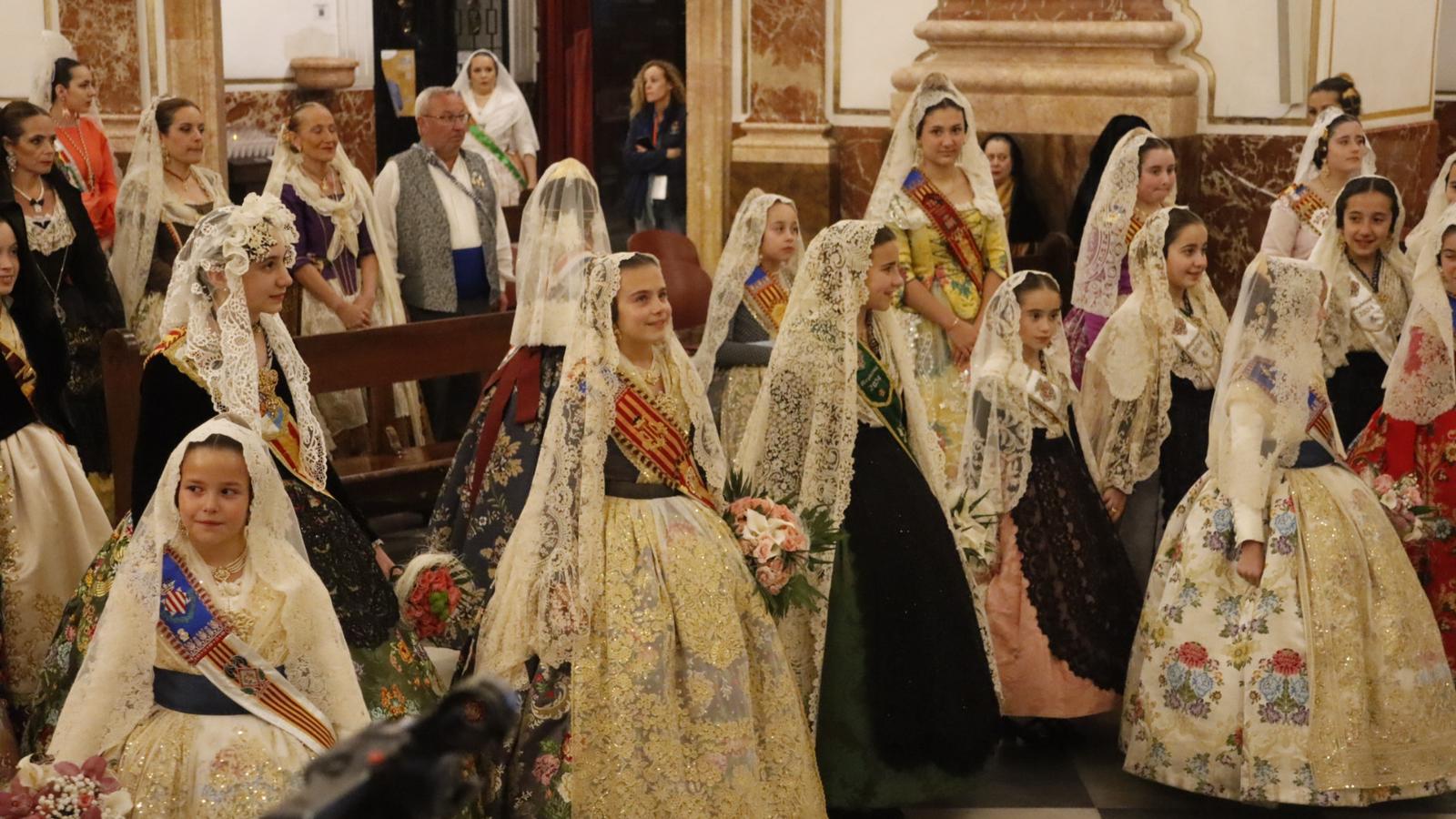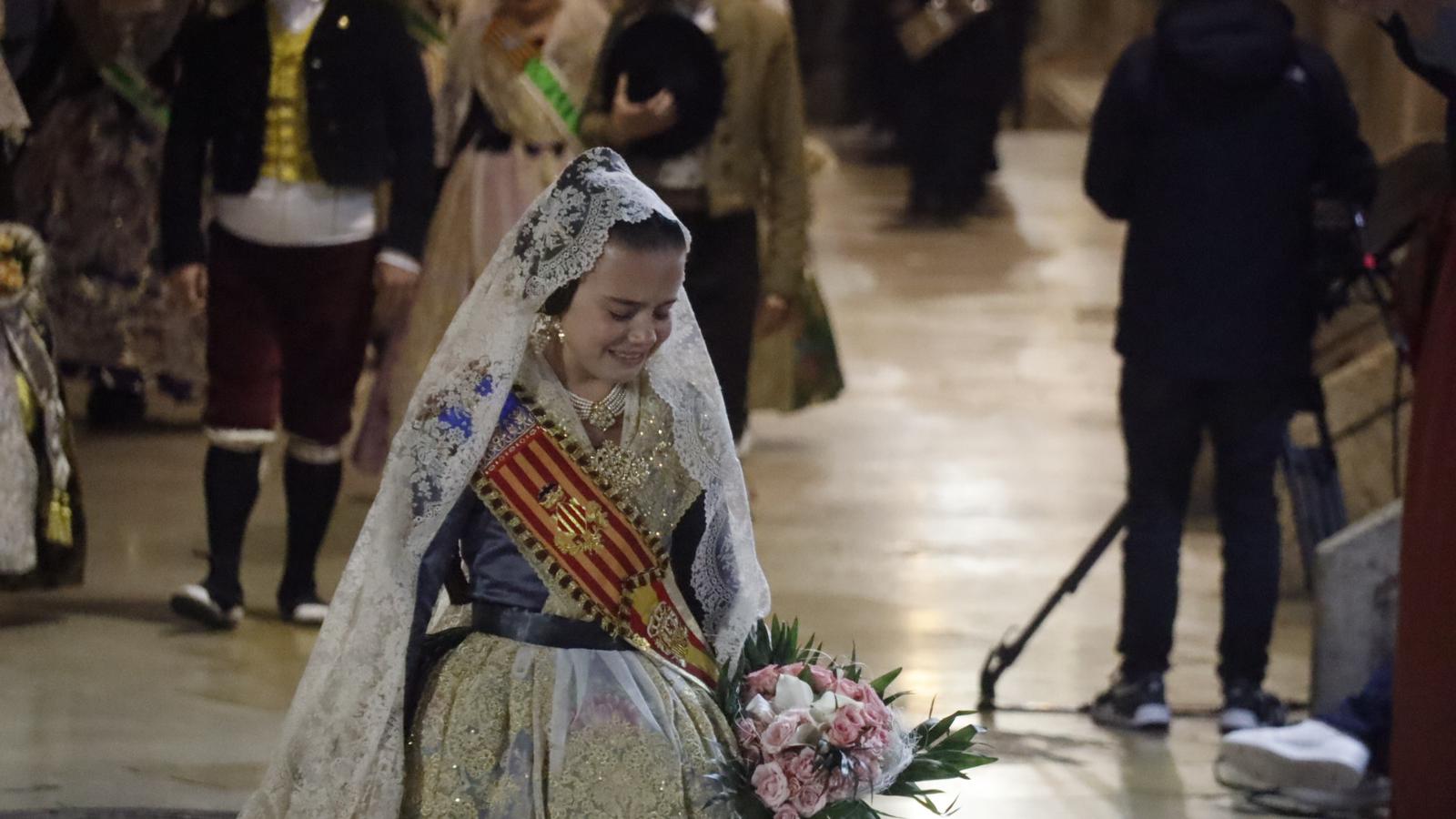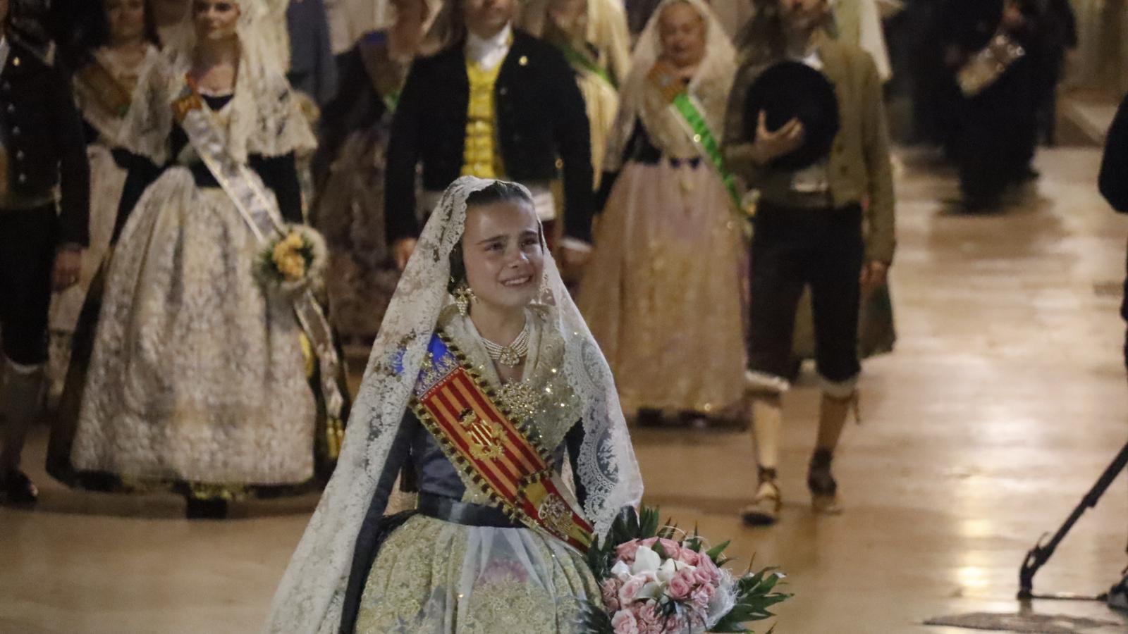 Tras finalizar la primera jornada de la Ofrenda floral fallera a la Mare de Déu, la Fallera Mayor Infantil y su Corte accedieron a la Basílica.
