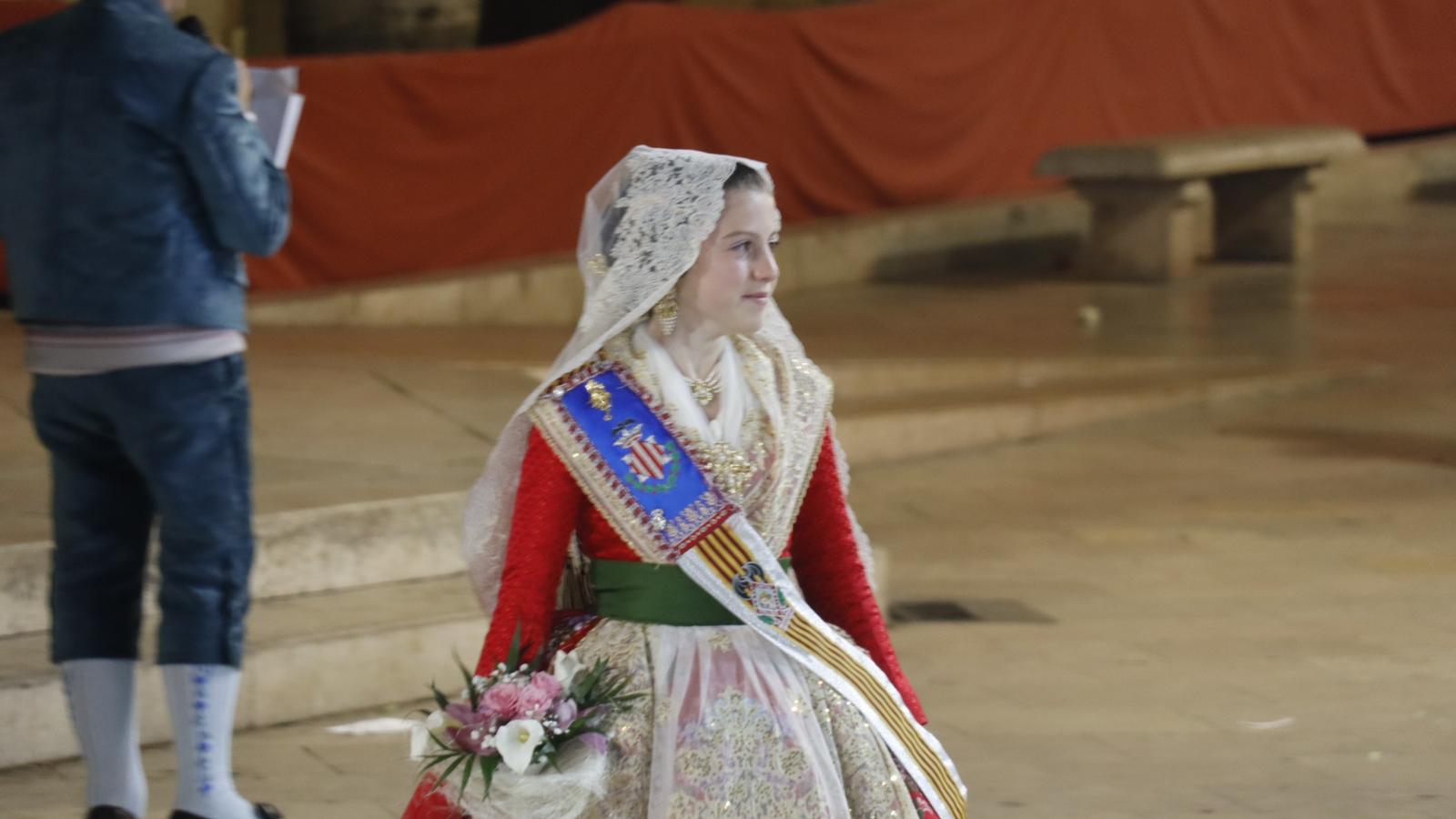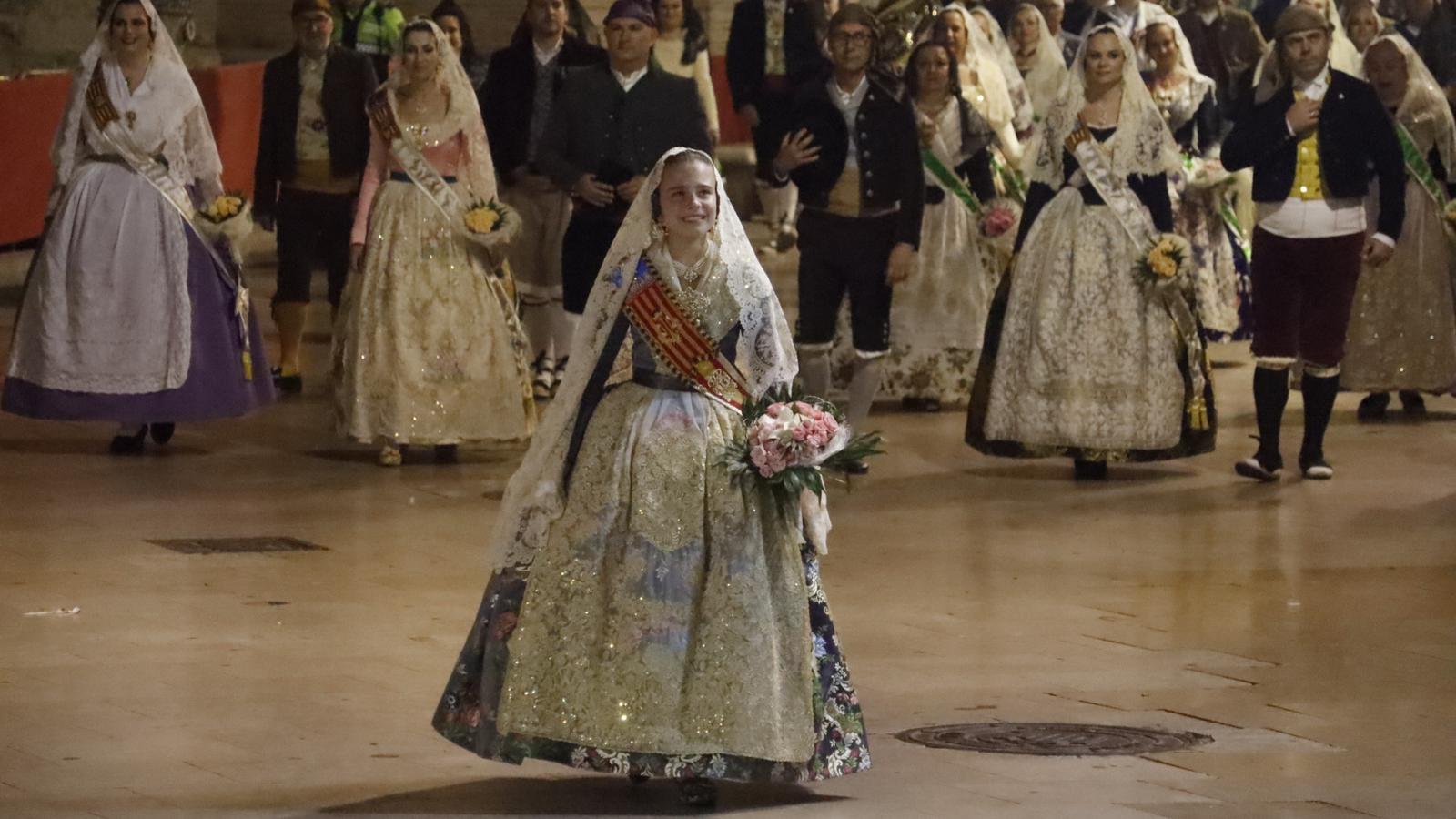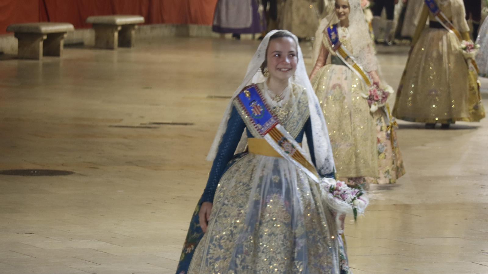 La Fallera Mayor Infantil de Valencia cerró la primera jornada de Ofrenda de las Fallas del 2024. Marina García Arribas escoltada por su Corte de Honor y toda la comitiva municipal hizo entrada en la plaza de la Virgen muy emocionada. Las pequeñas llegaron a la plaza alrededor de las tres de la madrugada.