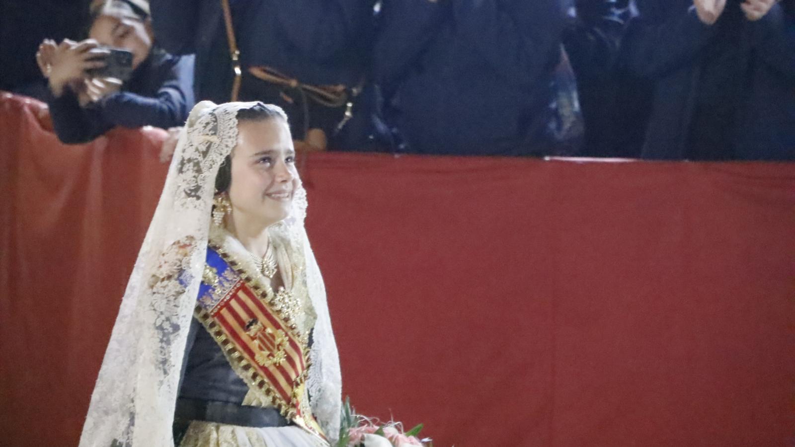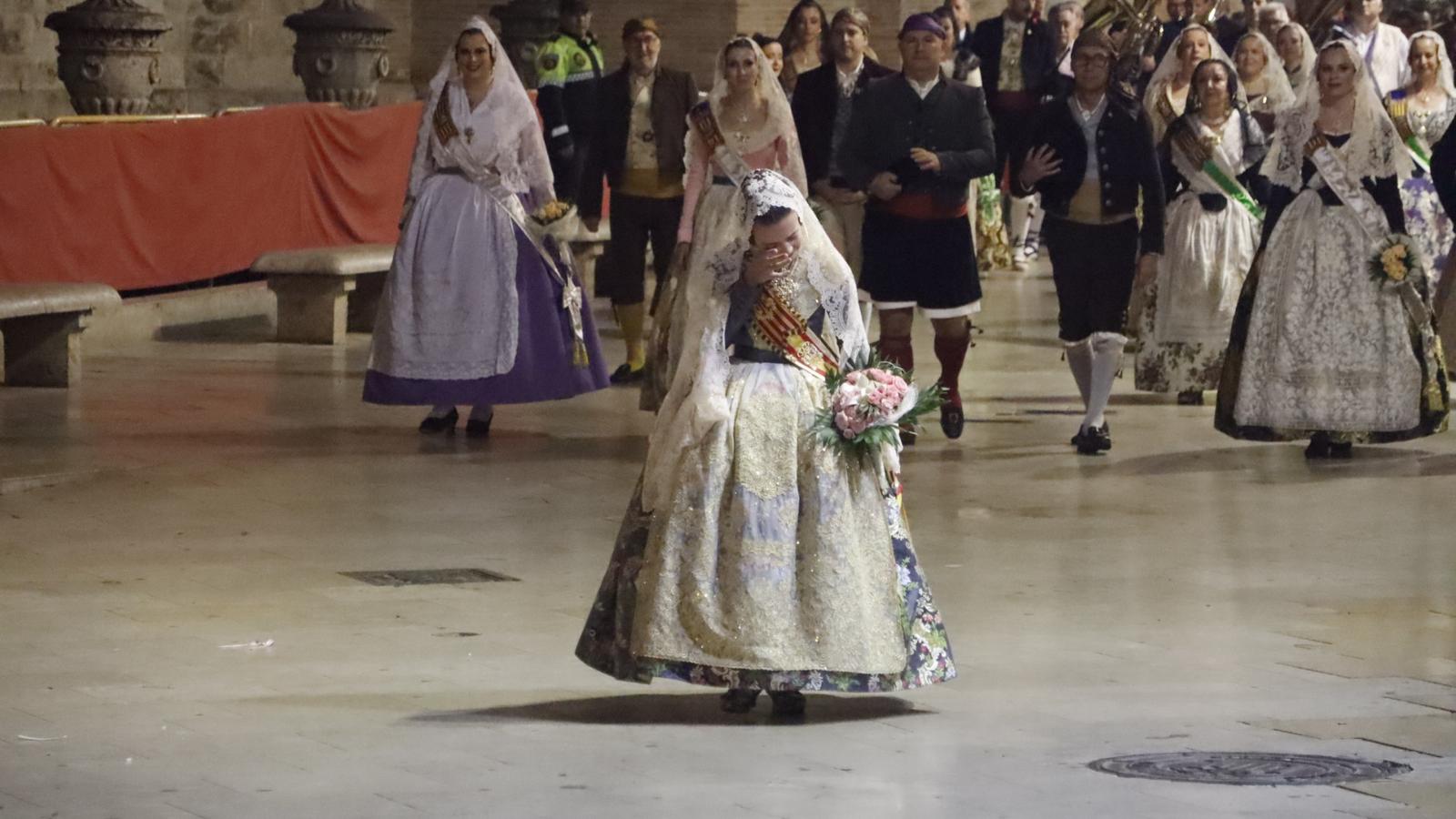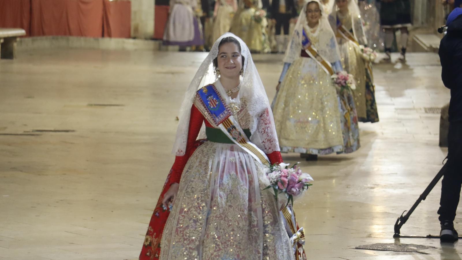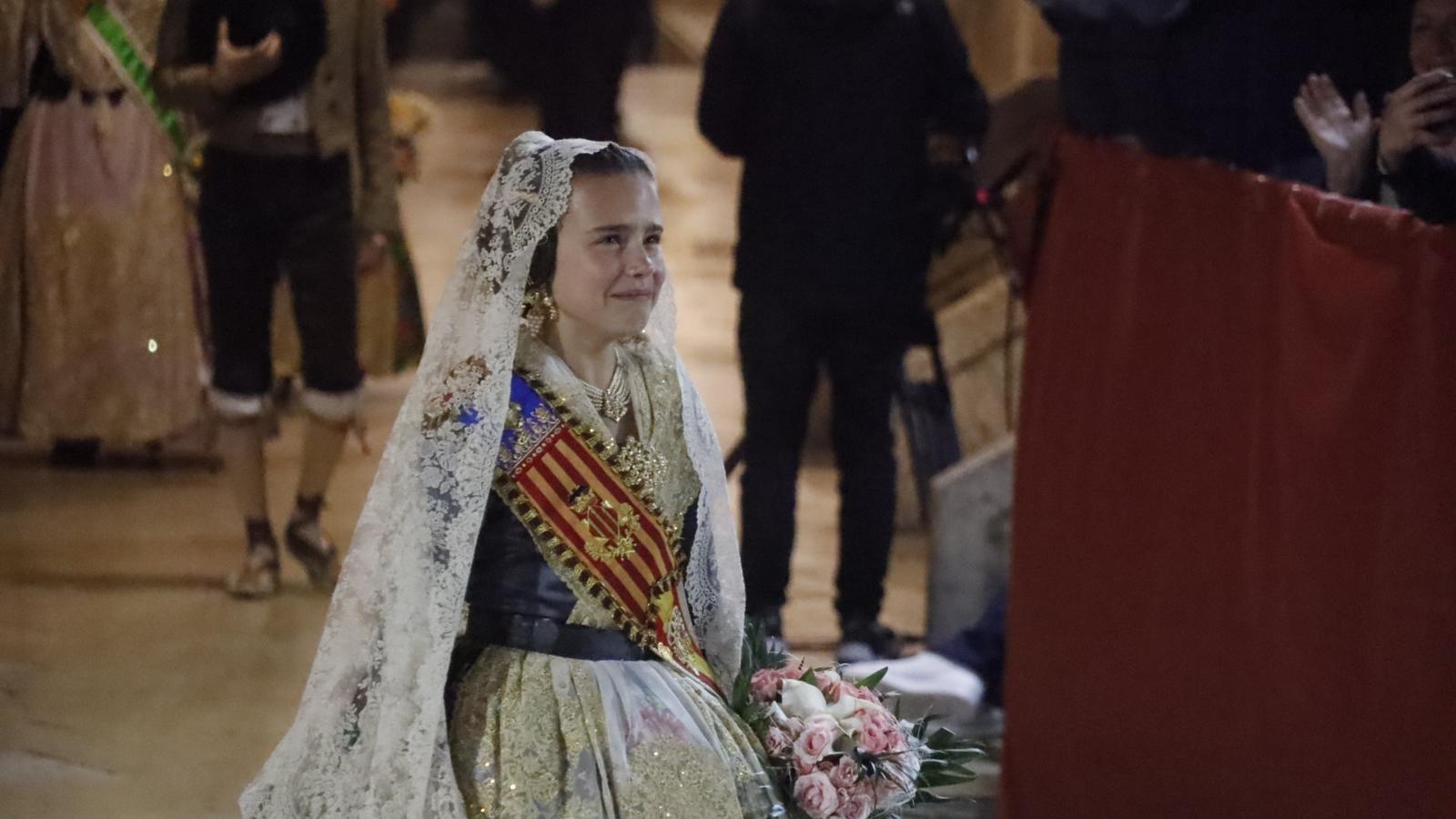 La Fallera Mayor Infantil de Valencia cerró la primera jornada de Ofrenda de las Fallas del 2024. Marina García Arribas escoltada por su Corte de Honor y toda la comitiva municipal hizo entrada en la plaza de la Virgen muy emocionada. Las pequeñas llegaron a la plaza alrededor de las tres de la madrugada.