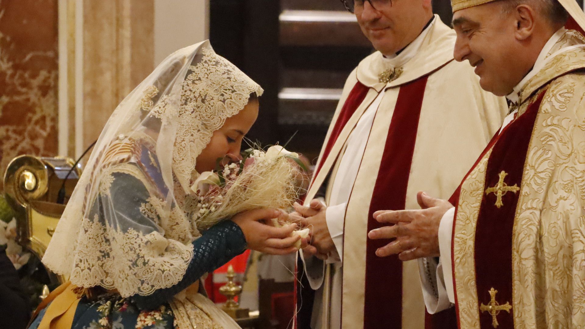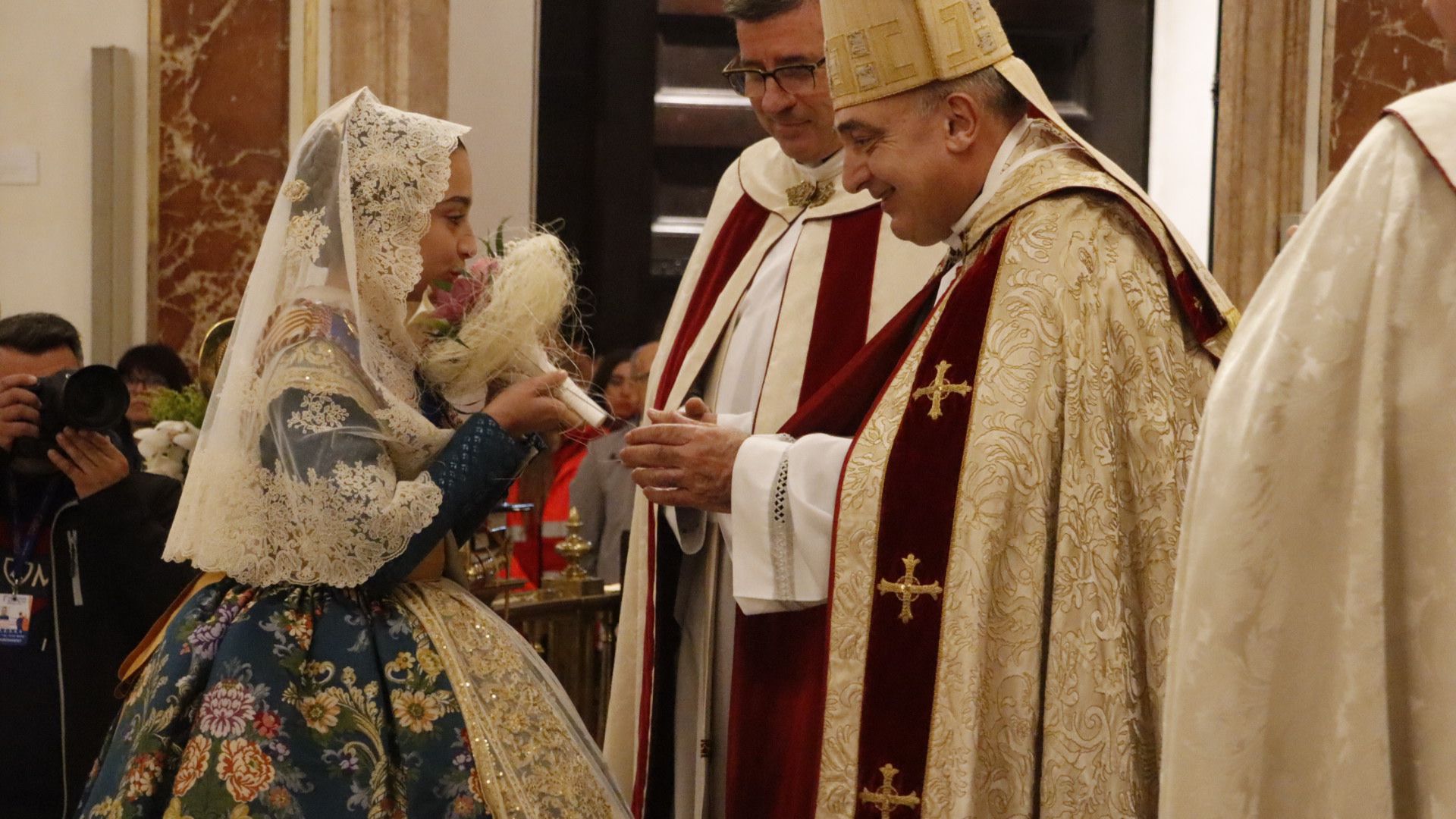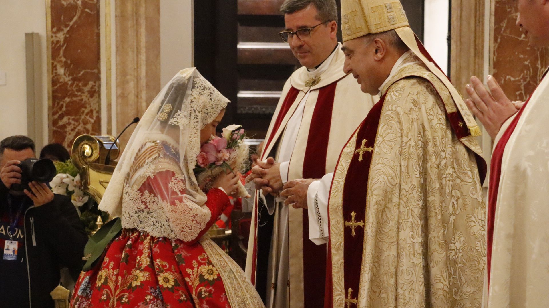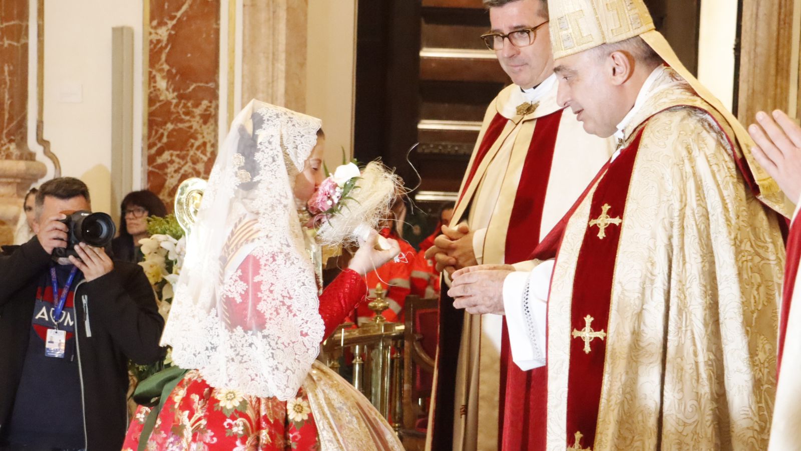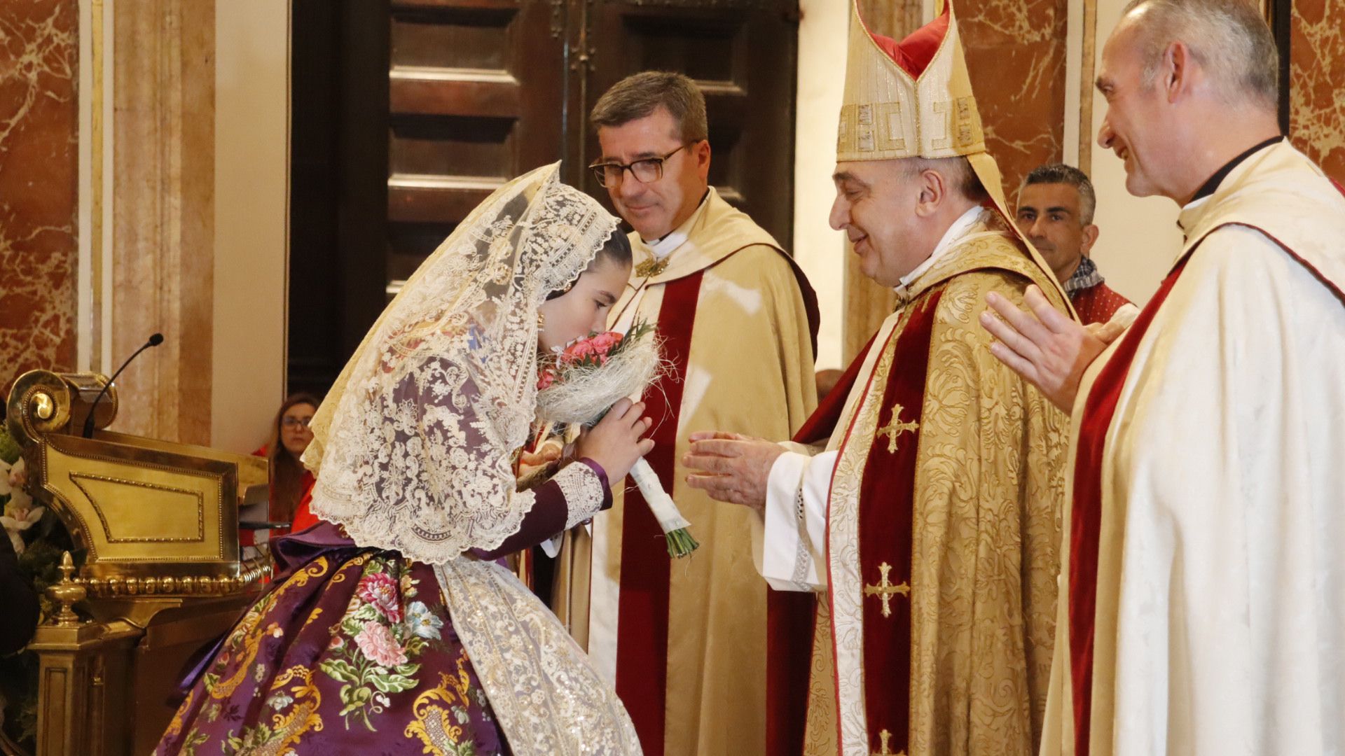 El arzobispo de Valencia, monseñor Enrique Benavent, recibió a la Fallera Mayor Infantil de Valencia, Marina García, y a su Corte de Honor en la Basílica de la Virgen de los Desamparados, donde entregaron su ramo a la Mare de Déu.