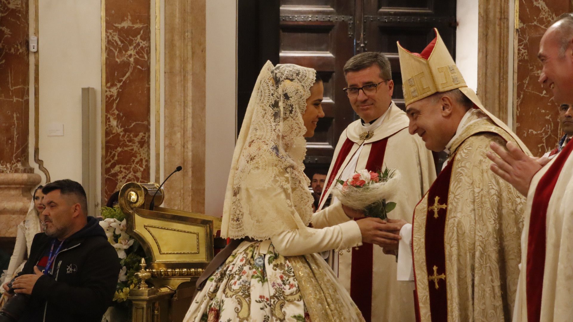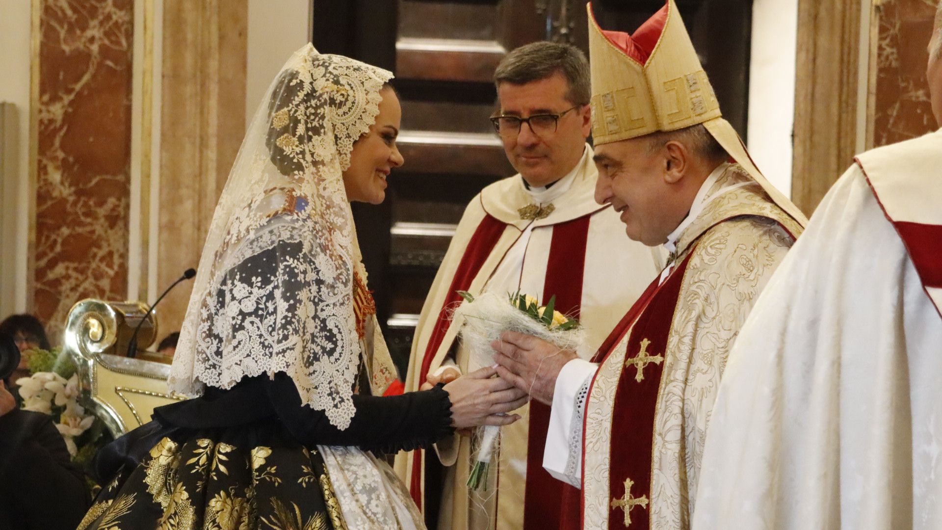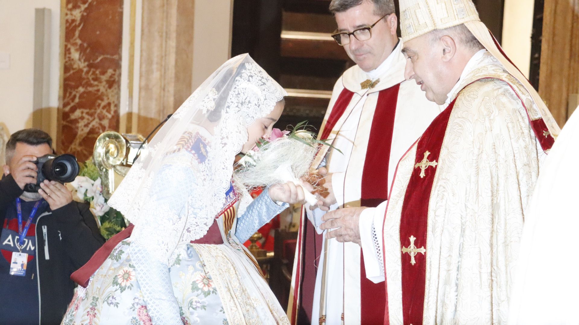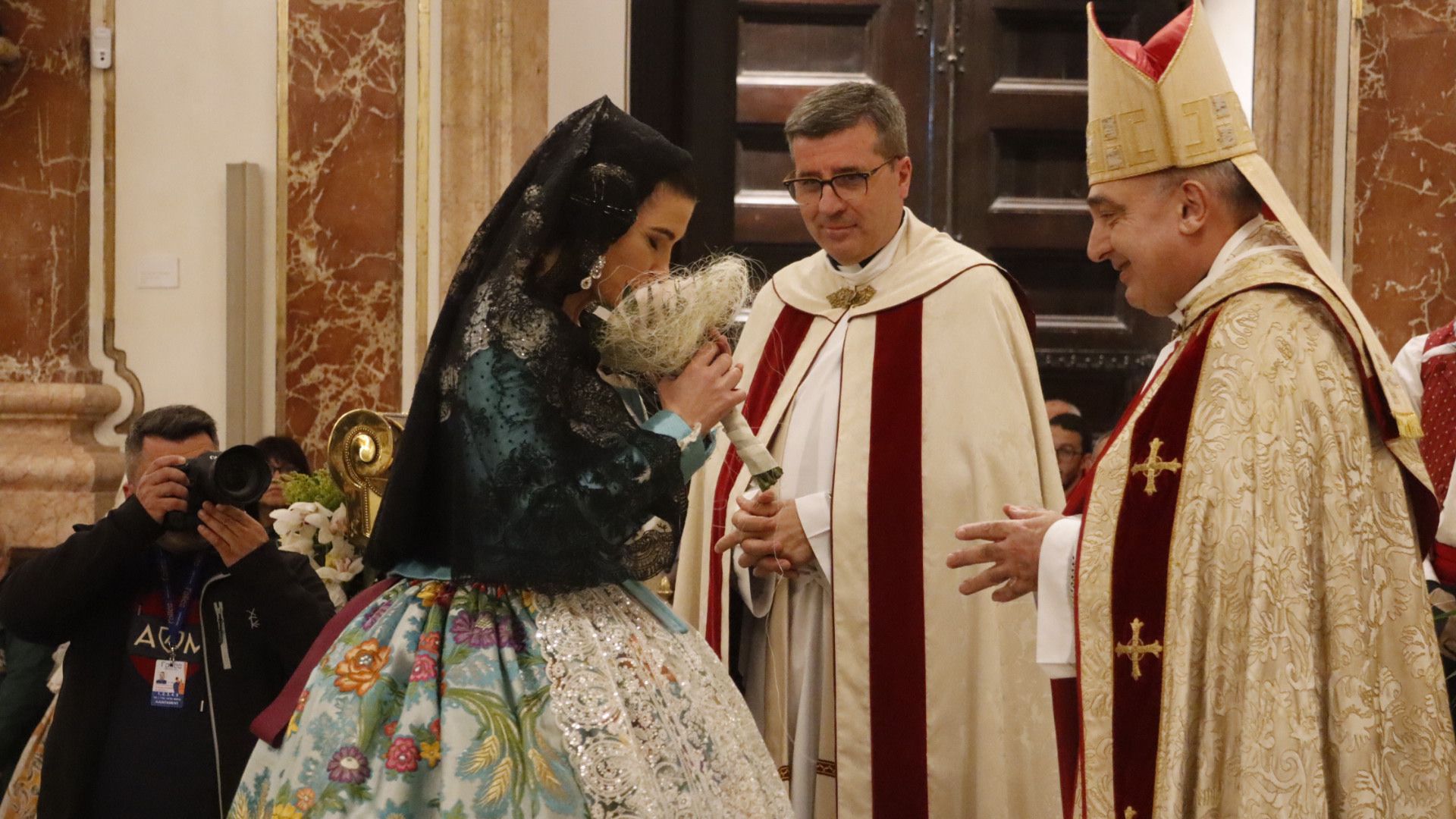 El arzobispo de Valencia, monseñor Enrique Benavent, recibió a la Fallera Mayor Infantil de Valencia, Marina García, y a su Corte de Honor en la Basílica de la Virgen de los Desamparados, donde entregaron su ramo a la Mare de Déu.