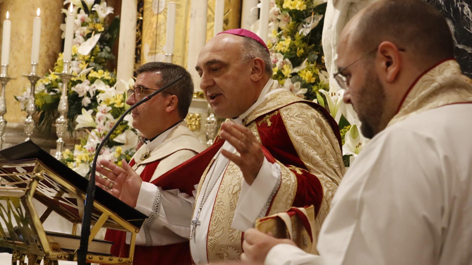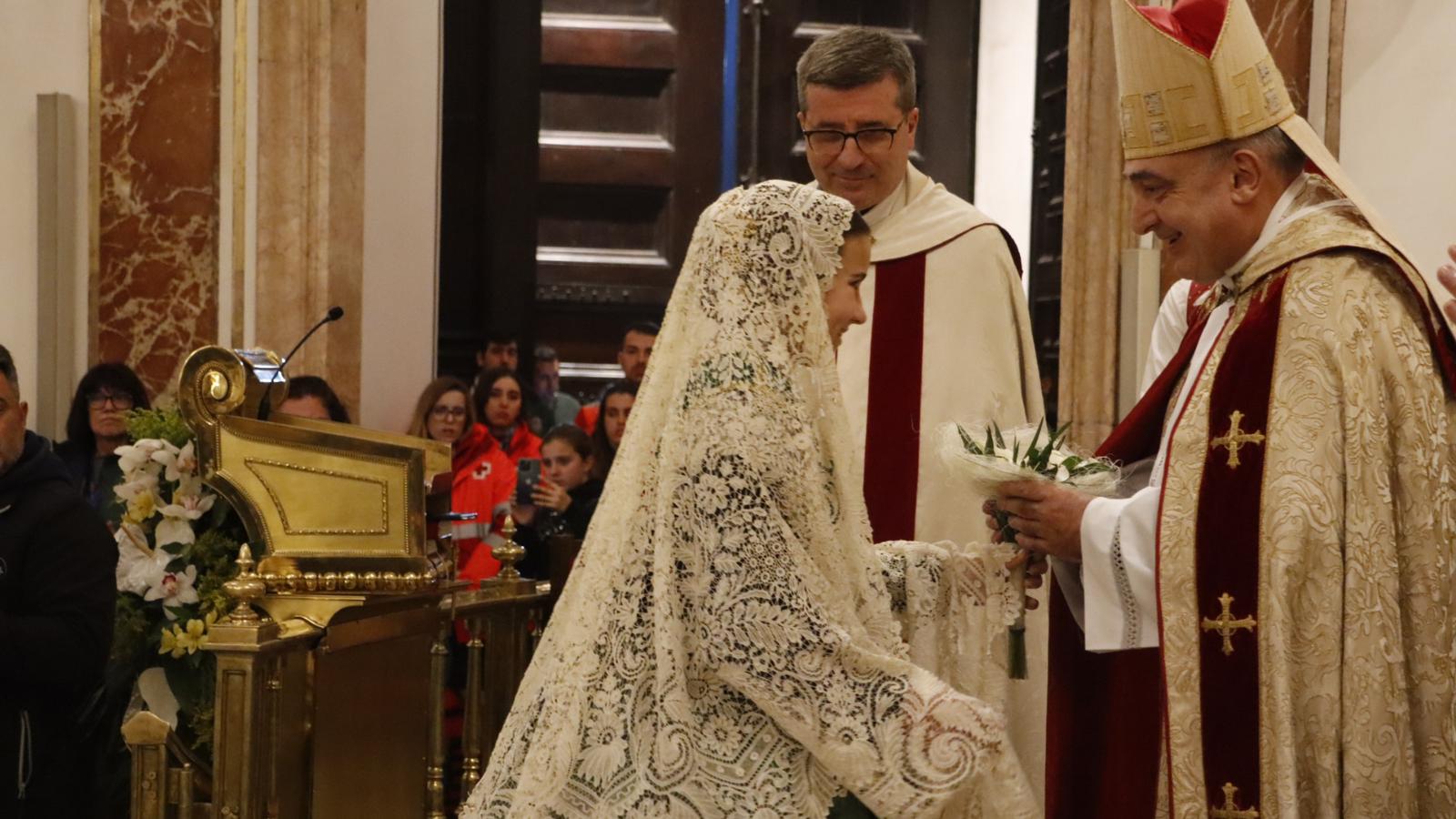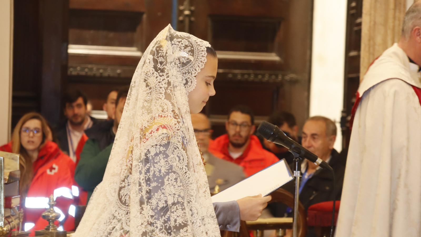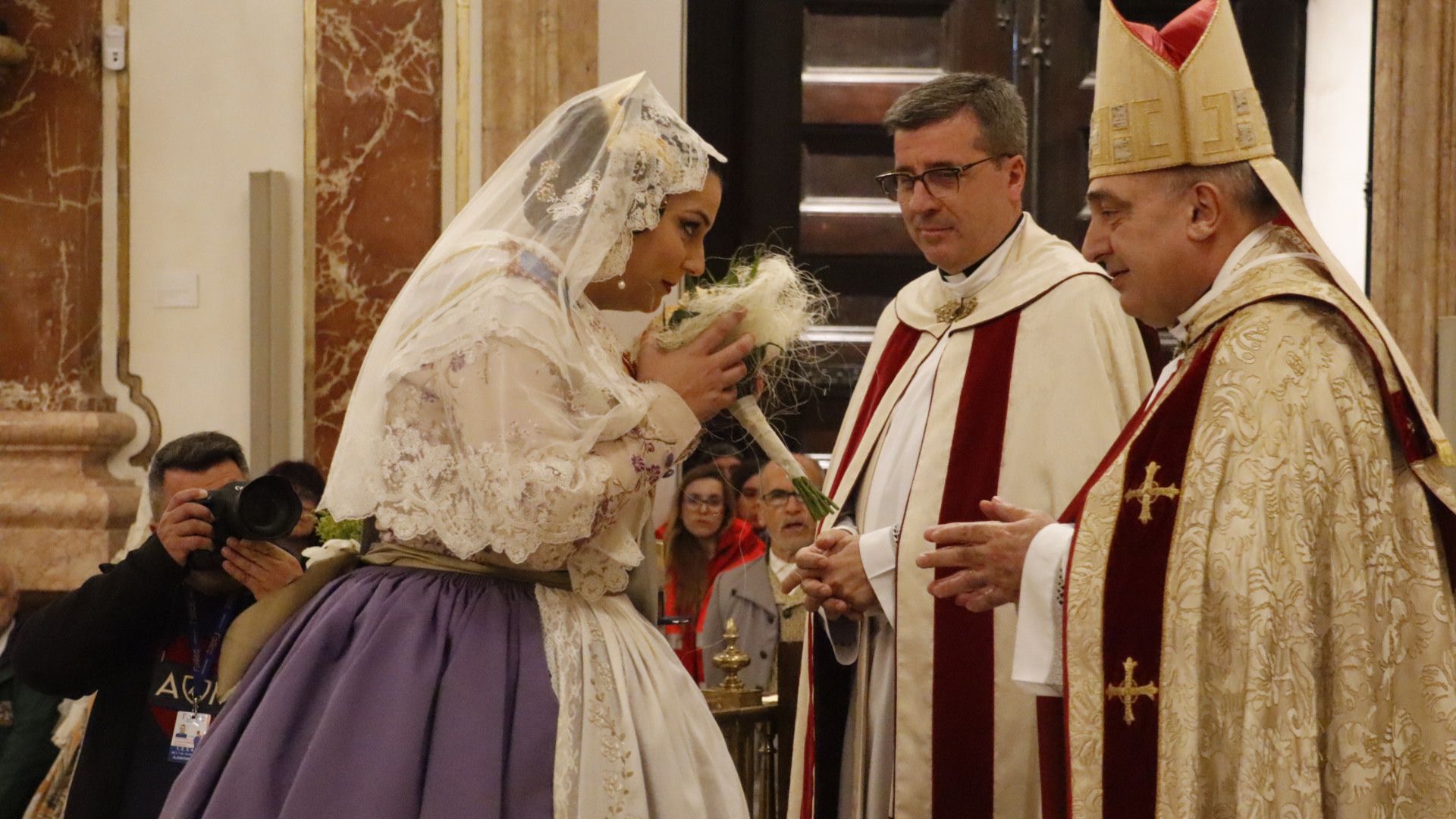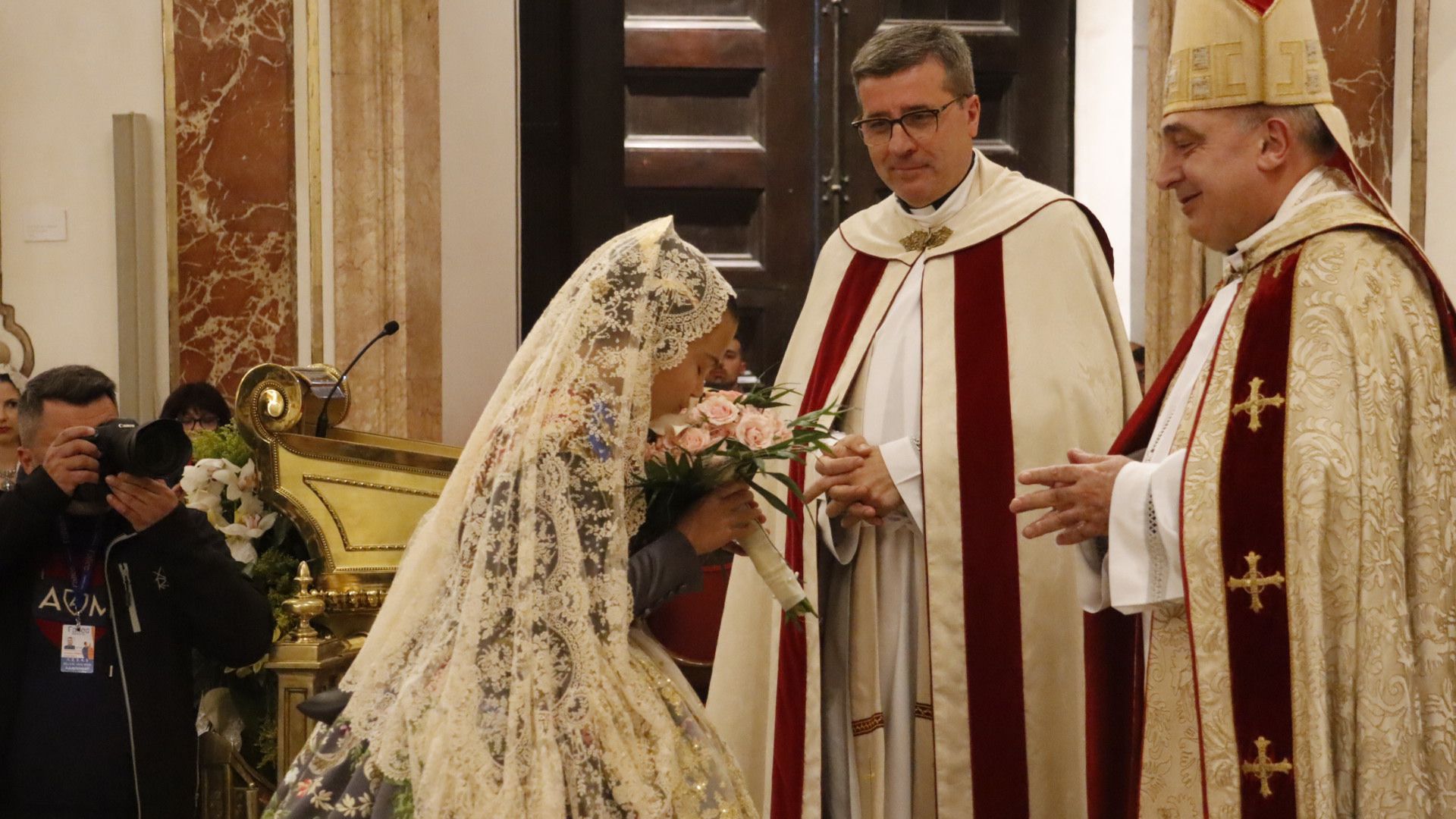 El arzobispo de Valencia, monseñor Enrique Benavent, recibió a la Fallera Mayor Infantil de Valencia, Marina García, y a su Corte de Honor en la Basílica de la Virgen de los Desamparados, donde entregaron su ramo a la Mare de Déu.