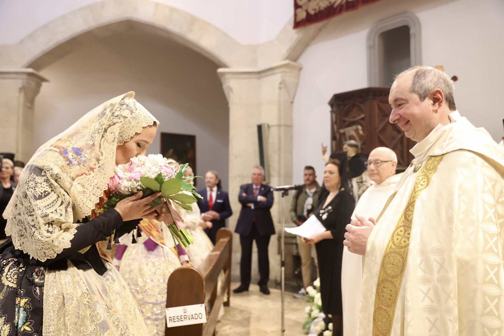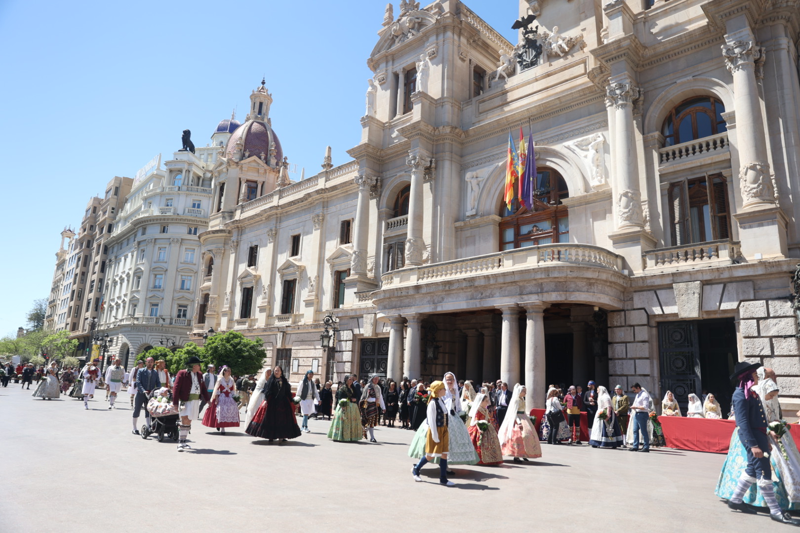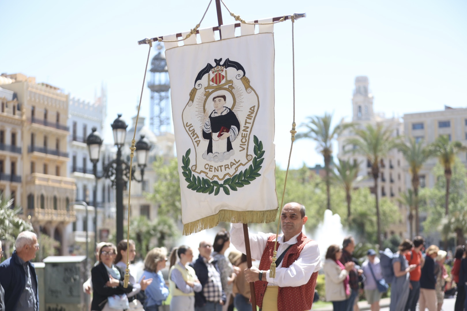 Después de la celebración de la ofrenda, el Honorable Clavariesa y el presidente de Junta Central Fallera, Pere Fuset, han colocado una corona de laurel a los pies de la imagen de San Vicente. La mañana ha culminado con la interpretación del himno regional y del nacional, así como con una mascletà disparada en la plaza de Tetuán por la pirotecnia Vulcano.