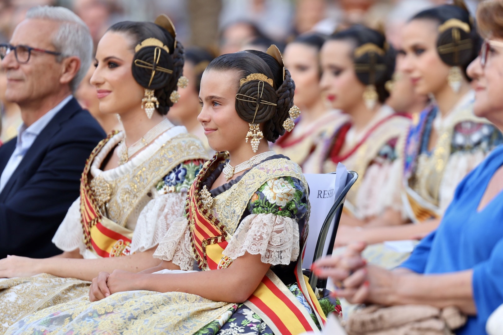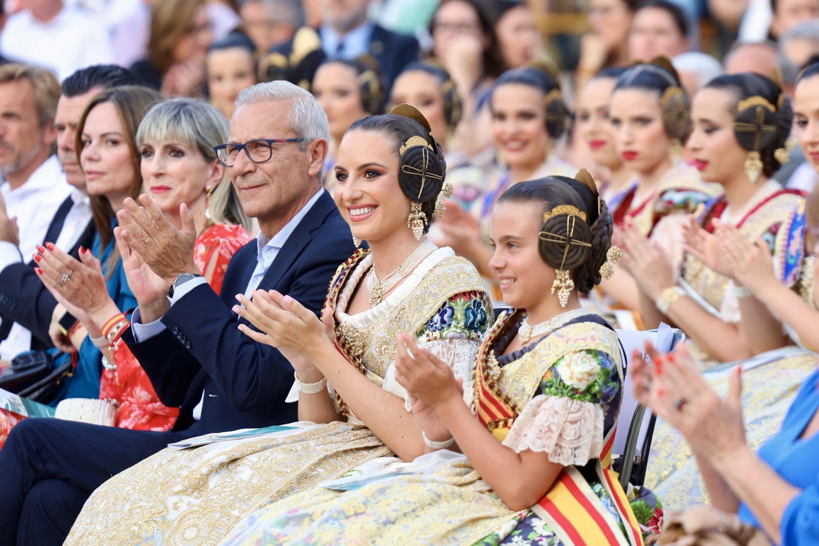 Las protagonistas, María Estela Arlandis Ferrando, Fallera Mayor de Valencia 2024, y Marina García Arribas, Fallera Mayor Infantil de Valencia 2024, acompañadas por sus respectivas cortes de honor.