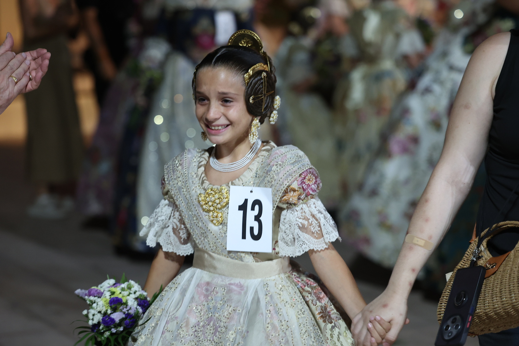Para completar su indumentaria, María Estela lució un aderezo de racimo en oro de 18 quilates con brillantes en talla rosa, acompañado de joia, pinchos, pendientes, collar y una pulsera de siete tiras de perlas de Art Antic, además de unas espectaculares puntillas de Santos Textil.