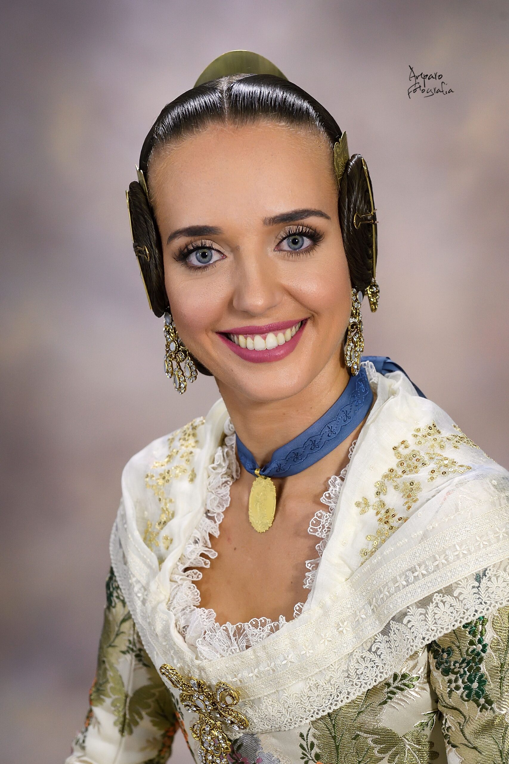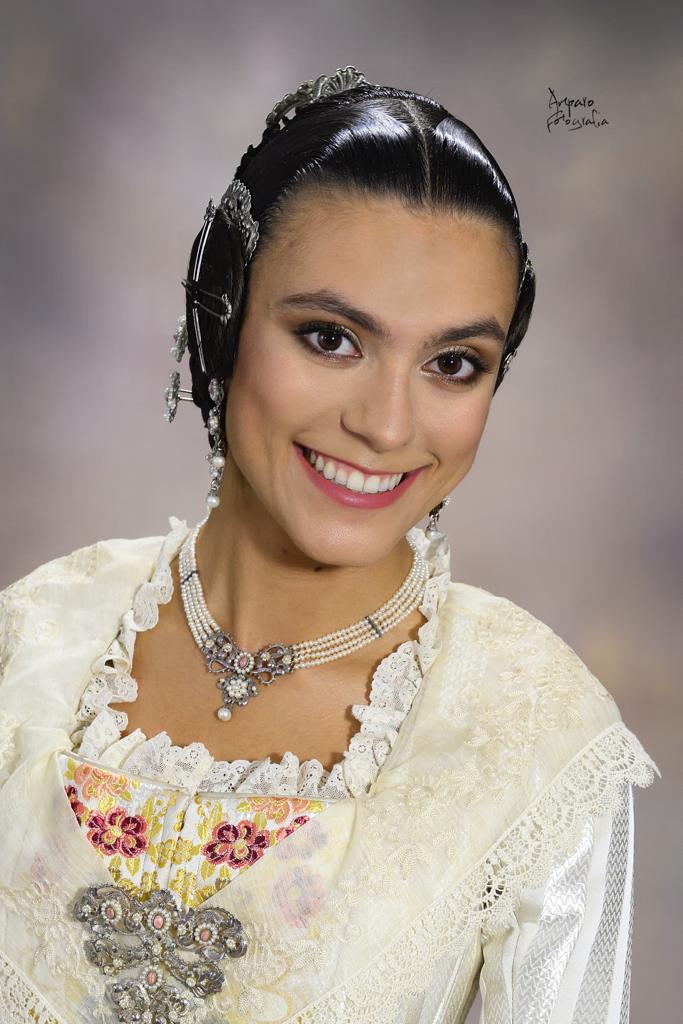 Uno de los momentos más esperados de la noche fue el descubrimiento del traje, que concentró todas las miradas del auditorio. Juana Paula Centeno Roig apareció con un espolín Soto de color azul, una elección cargada de simbolismo en la tradición valenciana, y es que este tono se asocia a la nobleza, la serenidad y la elegancia clásica de la indumentaria histórica. El tejido, confeccionado por Amparo Fabra, destaca por la riqueza del dibujo y la profundidad del color, que aporta sobriedad y presencia escénica.