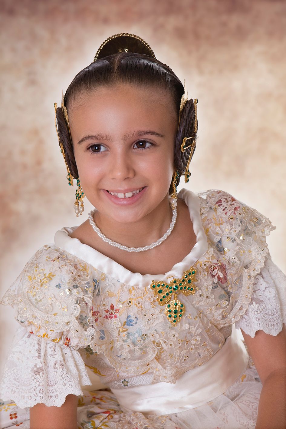 El look se completa con un aderezo original del siglo XIX, de barquillos en oro con esmeraldas y perlas. Una joya histórica que no necesita focos para brillar.