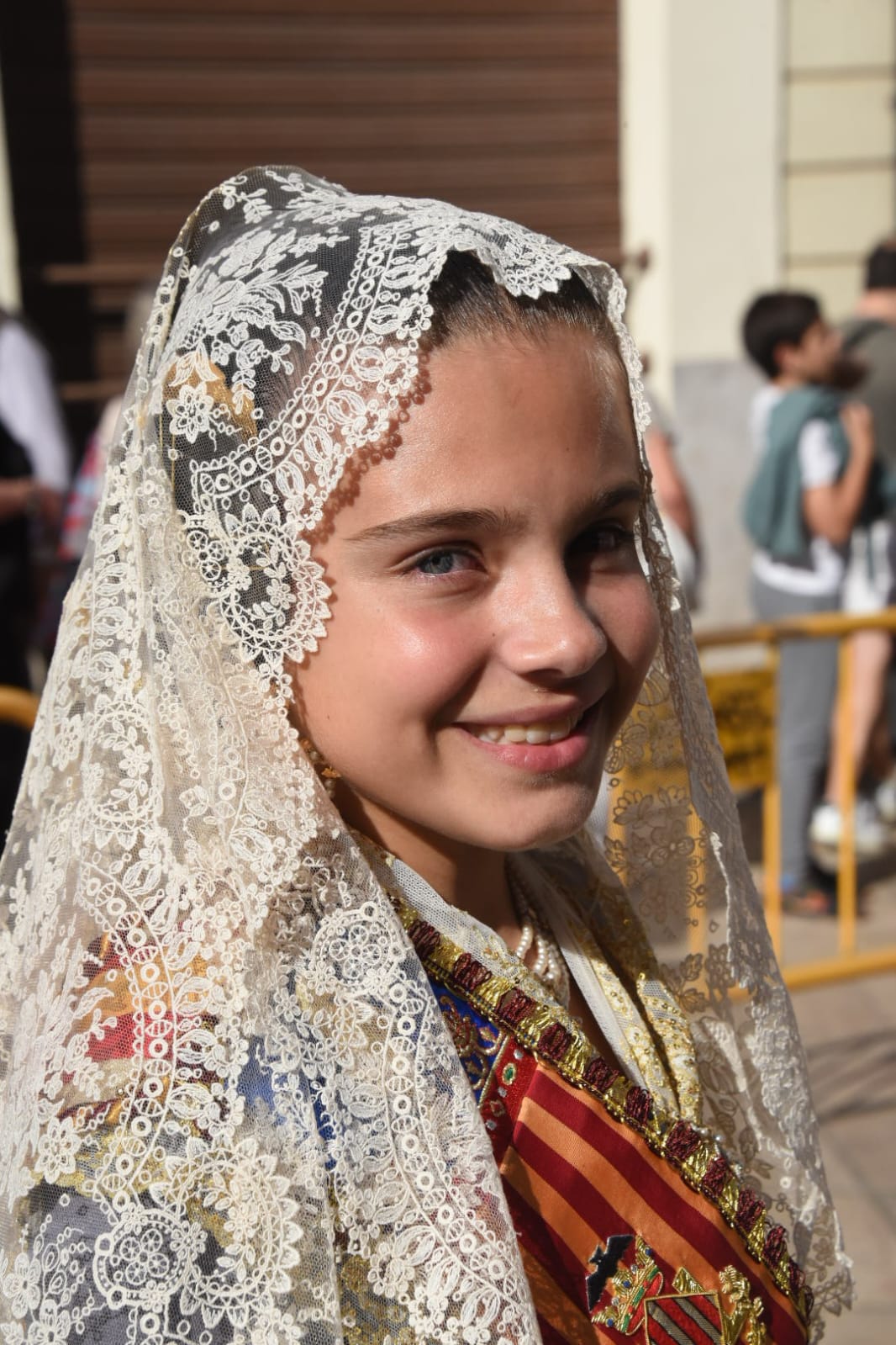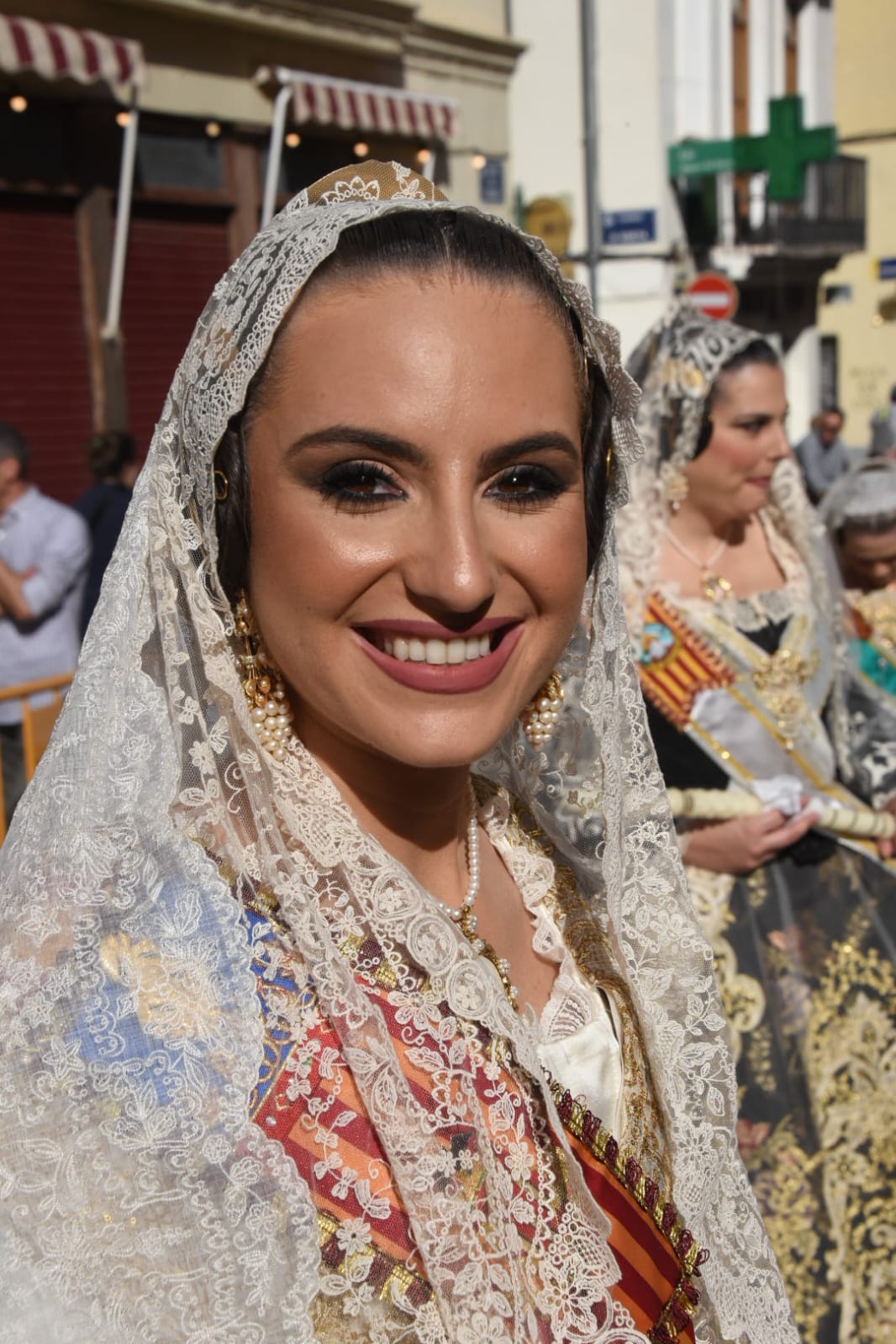 Uno de los momentos más esperados de la noche fue el descubrimiento del traje, que concentró todas las miradas del auditorio. Juana Paula Centeno Roig apareció con un espolín Soto de color azul, una elección cargada de simbolismo en la tradición valenciana, y es que este tono se asocia a la nobleza, la serenidad y la elegancia clásica de la indumentaria histórica. El tejido, confeccionado por Amparo Fabra, destaca por la riqueza del dibujo y la profundidad del color, que aporta sobriedad y presencia escénica.
