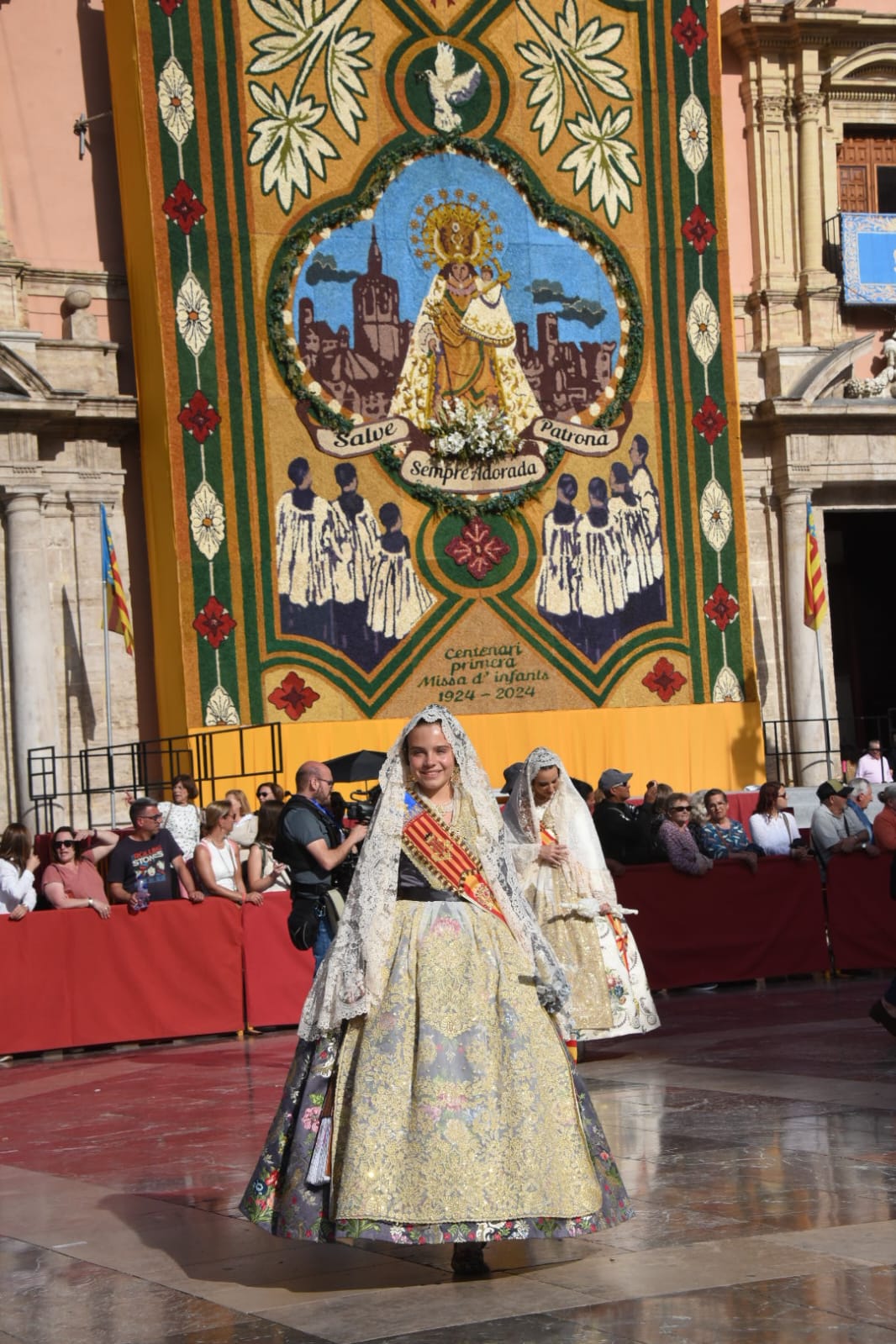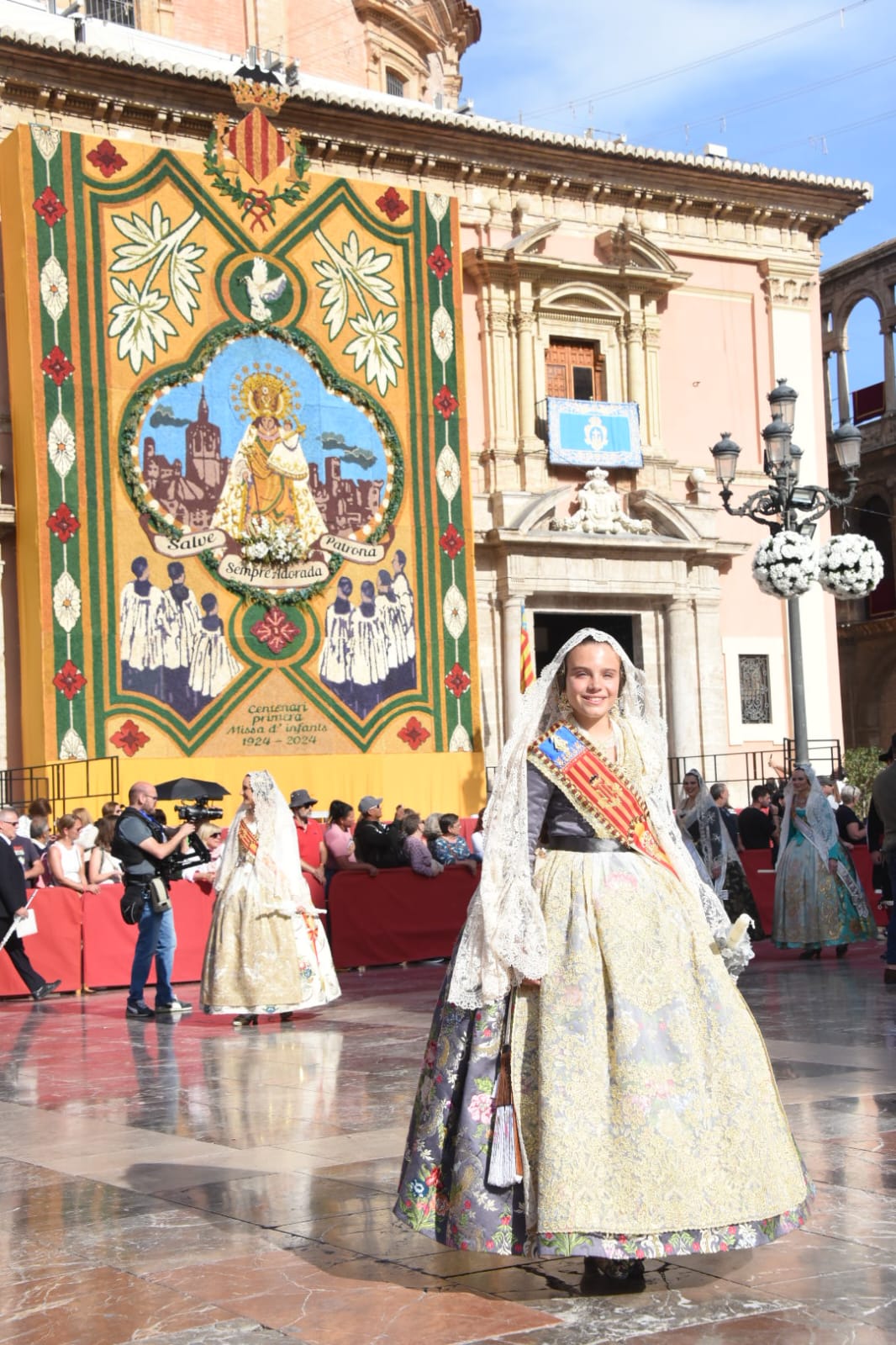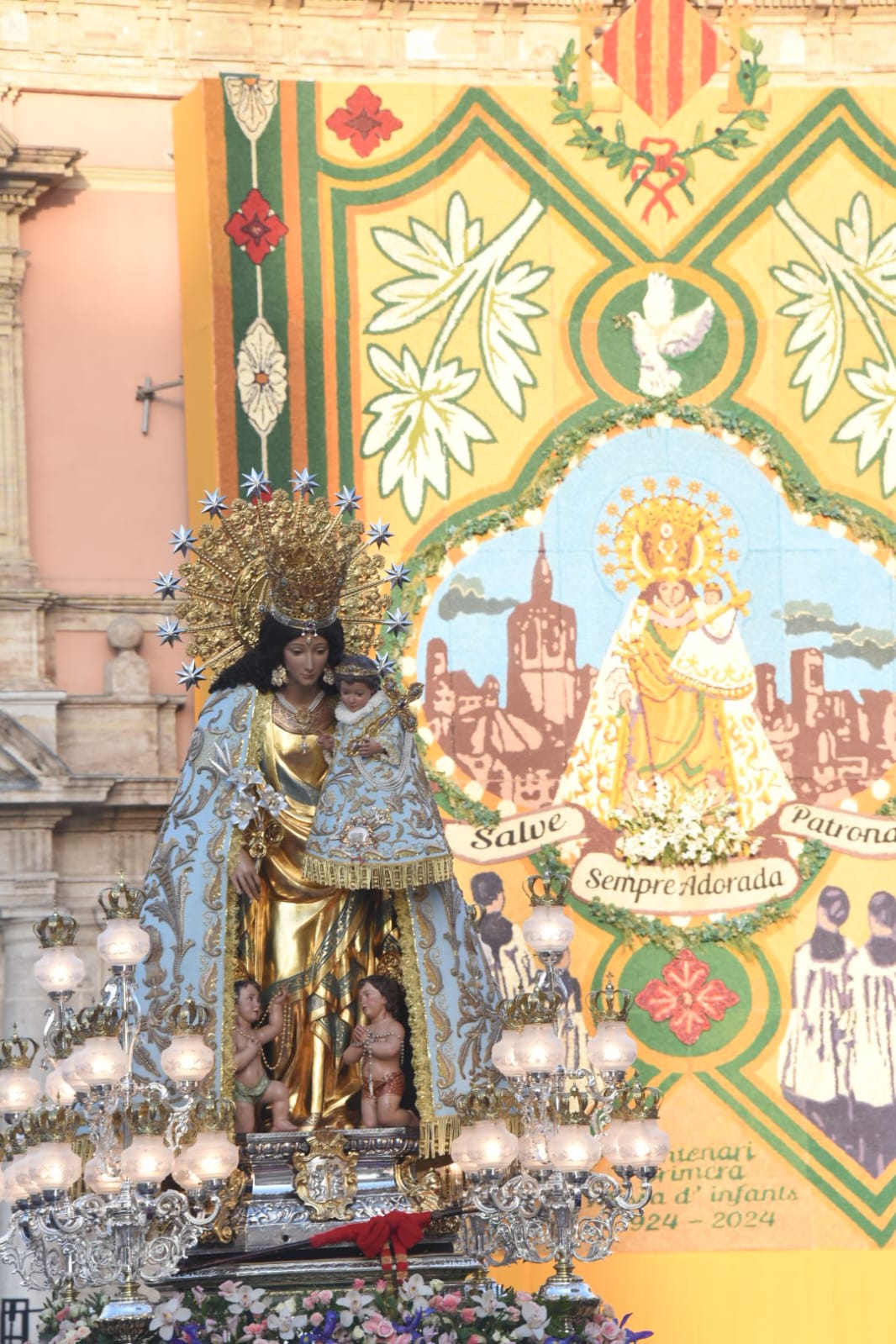 La ‘Geperudeta’, lució el famoso Manto del Año Mariano Universal de 1954, cuya restauración fue presentada esta semana en el Camarín de la Mare de Déu. Este manto fue un regalo de la ciudad de València en 1954 durante el Año Mariano convocado por el Papa Pío XII, con motivo del centenario de la proclamación del Dogma de la Inmaculada Concepción.