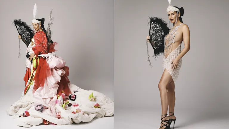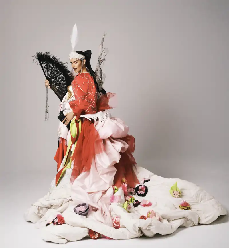 Pedroche se “lo ha puesto todo encima”, literalmente. Fragmentos de vestidos pasados, piezas icónicas recicladas, plumas, cadenas, cristales, esculturas corporales y referencias constantes a su propio archivo estético. Un ejercicio autorreferencial que funciona como resumen de su trayectoria, pero que no aporta una lectura nueva de la moda ni del cuerpo.