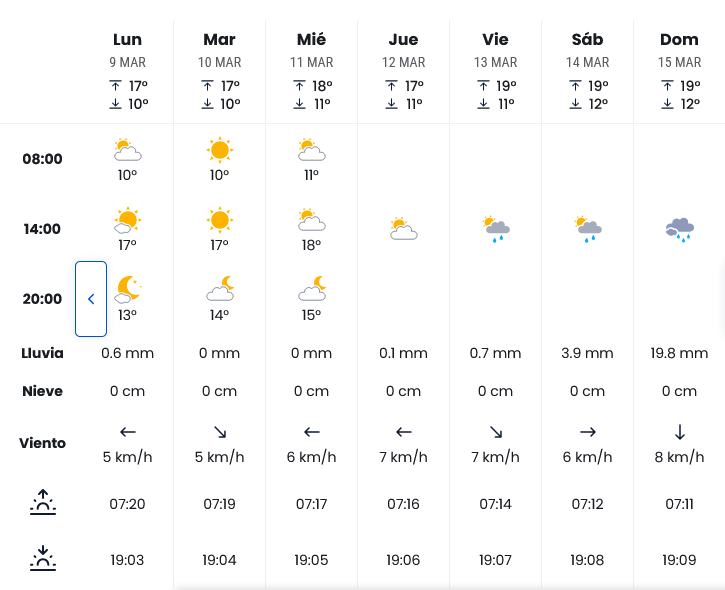 Aunque la previsión definitiva se confirmará en los días previos al 15 de marzo, el comportamiento histórico indica que lo más habitual es una combinación de sol y algún episodio puntual de lluvia, con temperaturas suaves durante el día y noches frescas.