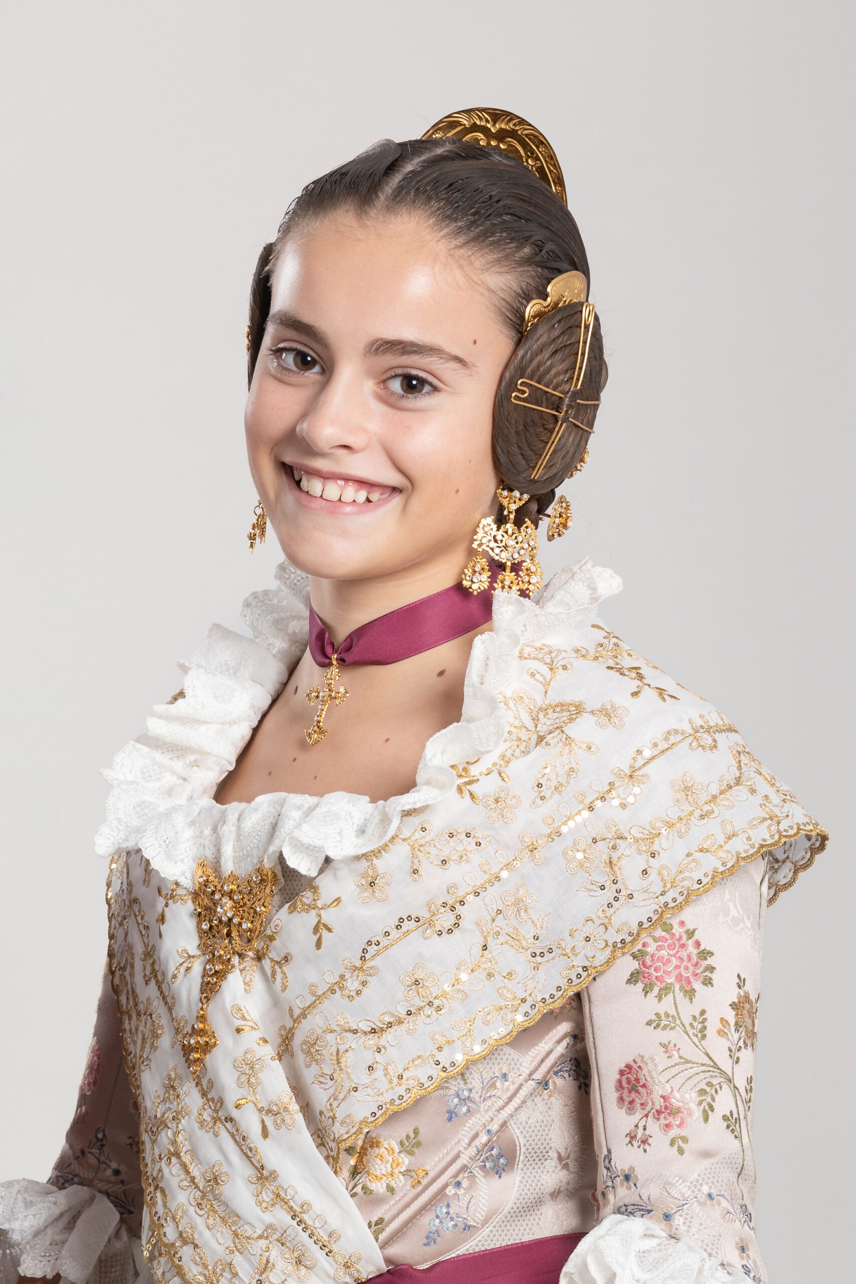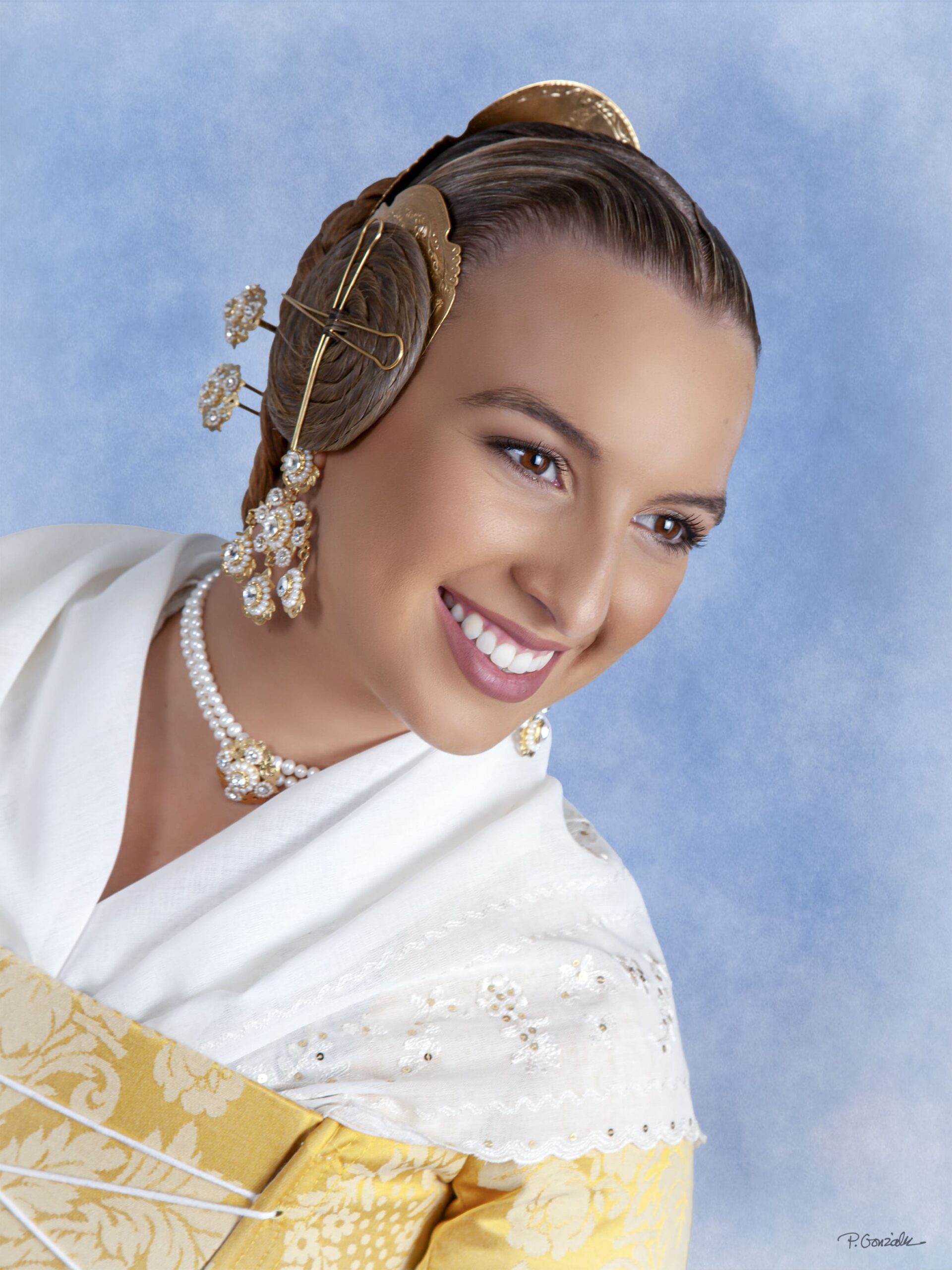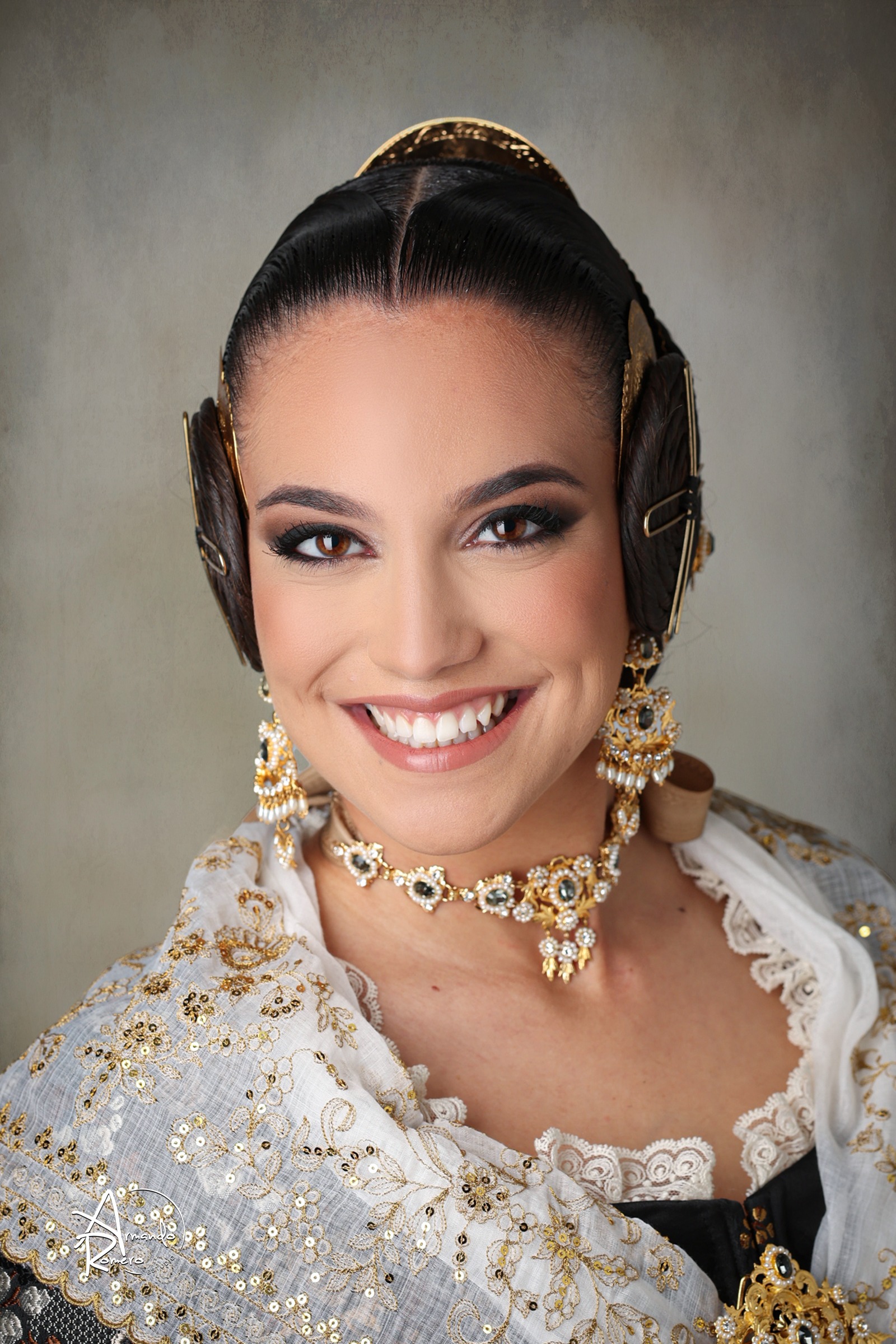 Espolín San Juan de Garin, tejido en seda gris e hilos de plata. Confeccionado por Dª Carmen Ferres Insa. Las manteletas de Campoy son de organza hechas a mano con hilo de plata a juego con el dibujo del traje y filtire. El aderezo y peinetas son de la joyería Pajarón. Las peinetas están cinceladas a mano en plata con baño de oro, y el aderezo de oro y esmeraldas.