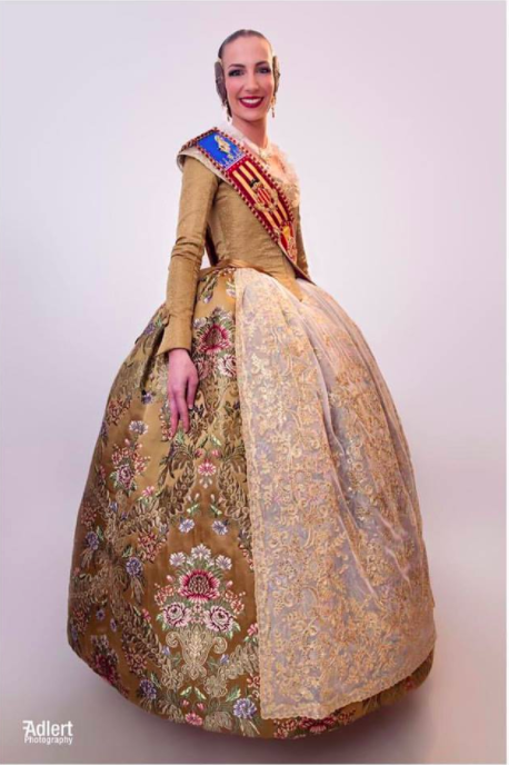 Para esta ocasión, la Fallera Mayor de Valencia lucía una seda estrecha de nombre ‘Valls’ tejido por la Compañía Valenciana de la Seda. Se trata de un dibujo clásico de casulla en fondo de seda arena combinado con metal oro. Tiene la particularidad de que el dibujo tiene un damasco de sobrefondo sobre el que resaltan pequeñas flores de colores suaves.