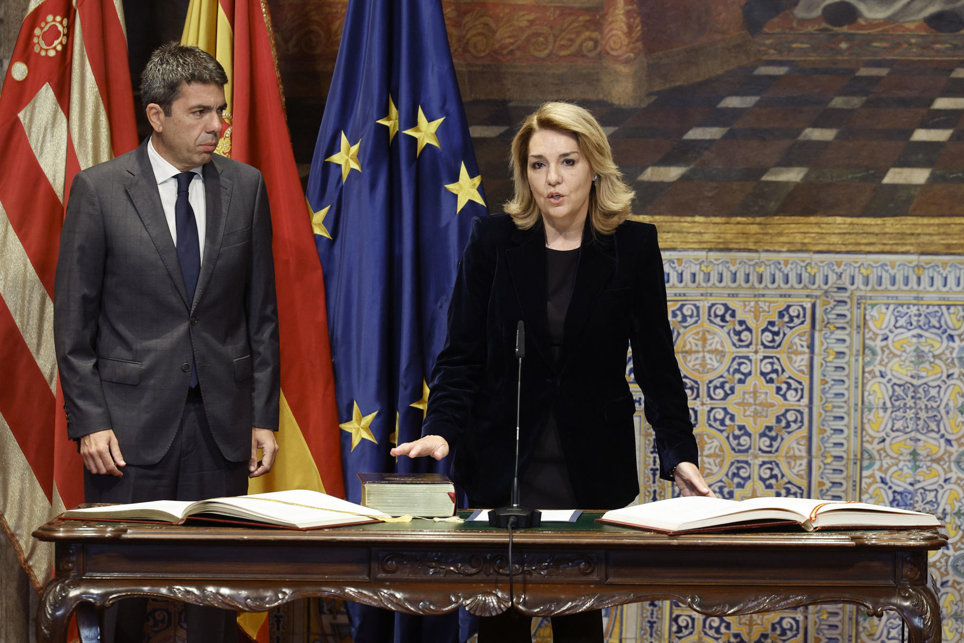 El acto, celebrado en el Palau de la Generalitat, ha estado presidido por el president Carlos Mazón, que en su discurso posterior a la toma de posesión ha reconocido el trabajo realizado por las conselleras destituidas, Salomé Pradas, que estaba al frente de Justicia e Interior, y Nuria Montes, en Industria y Turismo.