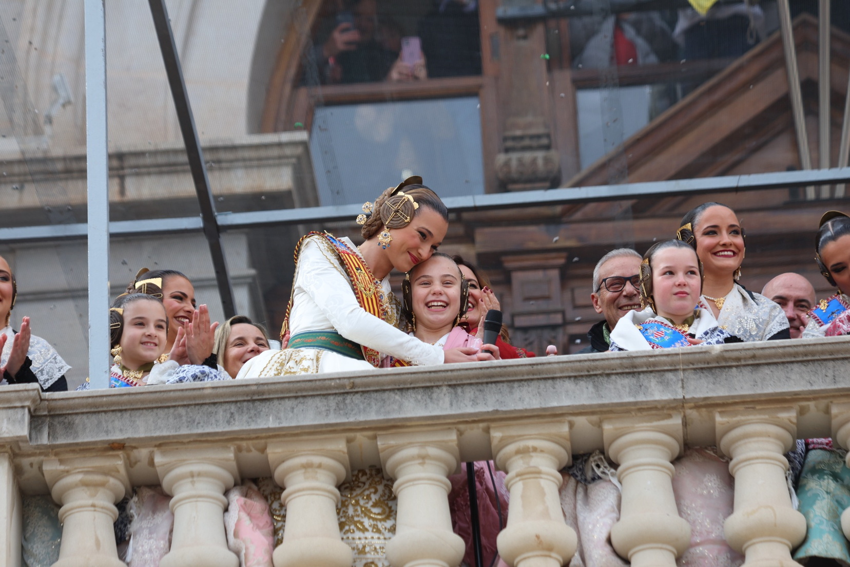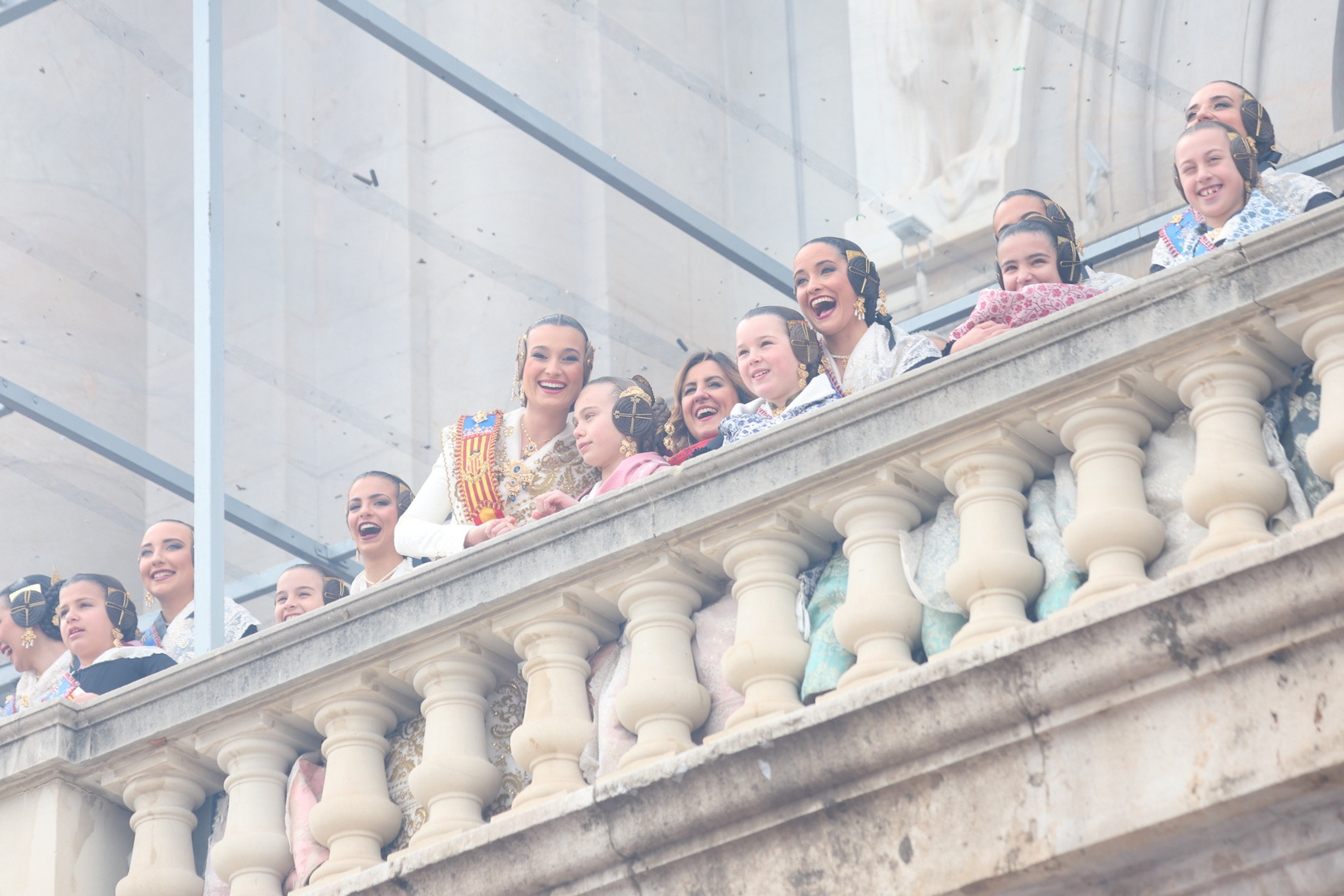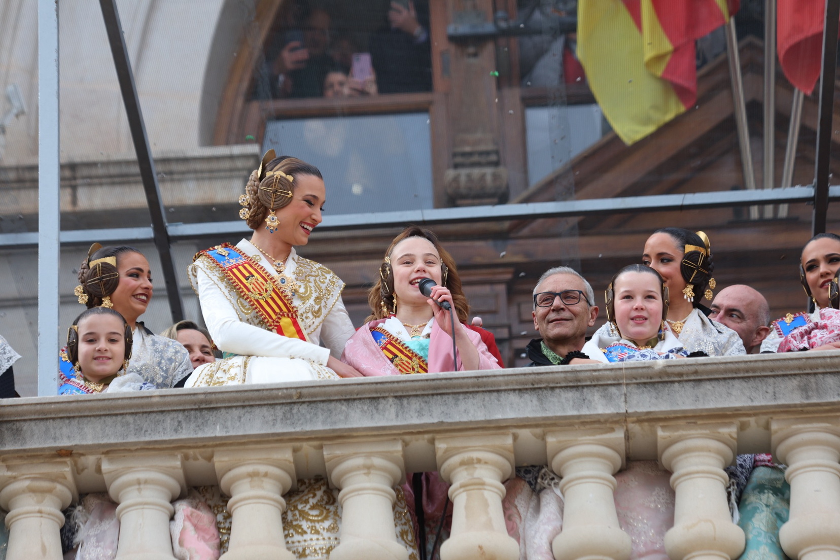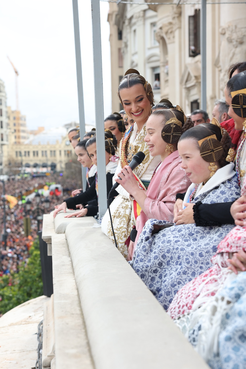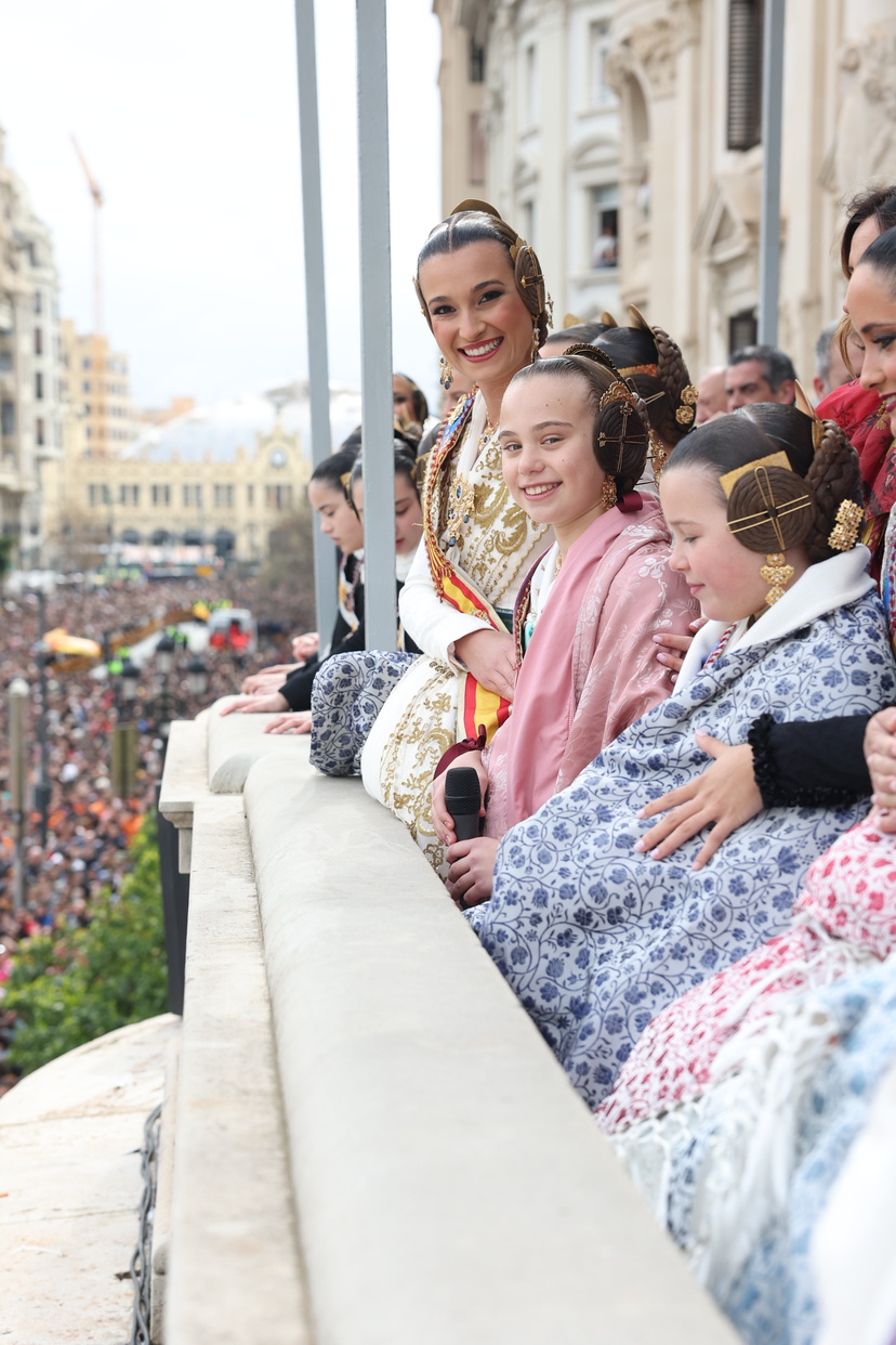 En el balcón del Ayuntamiento, como cada día, han estado presentes las falleras mayores, Berta Peiró García y Lucía García Rivera, junto con la alcaldesa de la ciudad, María José Catalá. Sin embargo, no se ha visto a ningún miembro del Consell en esta jornada.
