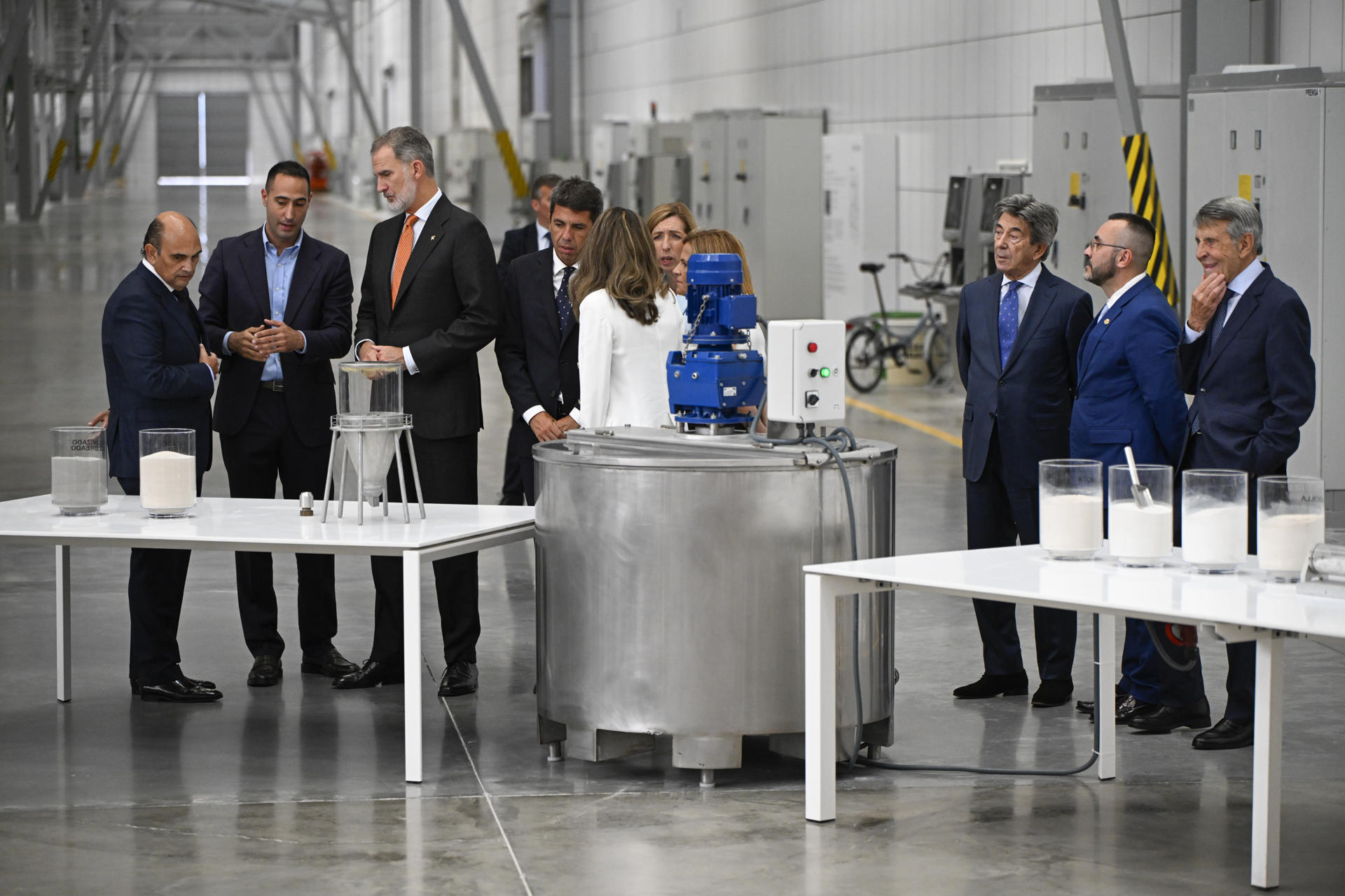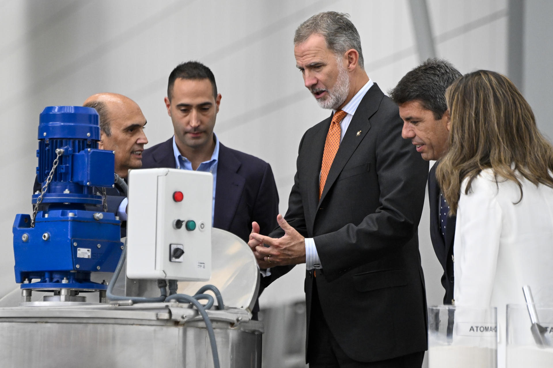 El rey Felipe, acompañado por el president de la Generalitat, Carlos Mazón (2º d), durante la visita a las instalaciones de Porcelanosa Grupo con motivo del 50 aniversario de este empresa azulejera. EFE/Andreu Esteban