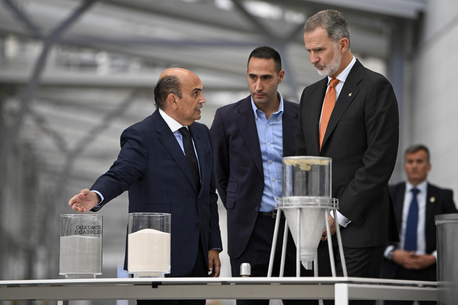 El rey Felipe atiende al vicepresidente de Porcelanosa, Silvestre Segarra (i), durante la visita a las instalaciones de Porcelanosa Grupo con motivo del 50 aniversario de este empresa azulejera. EFE/Andreu Esteban