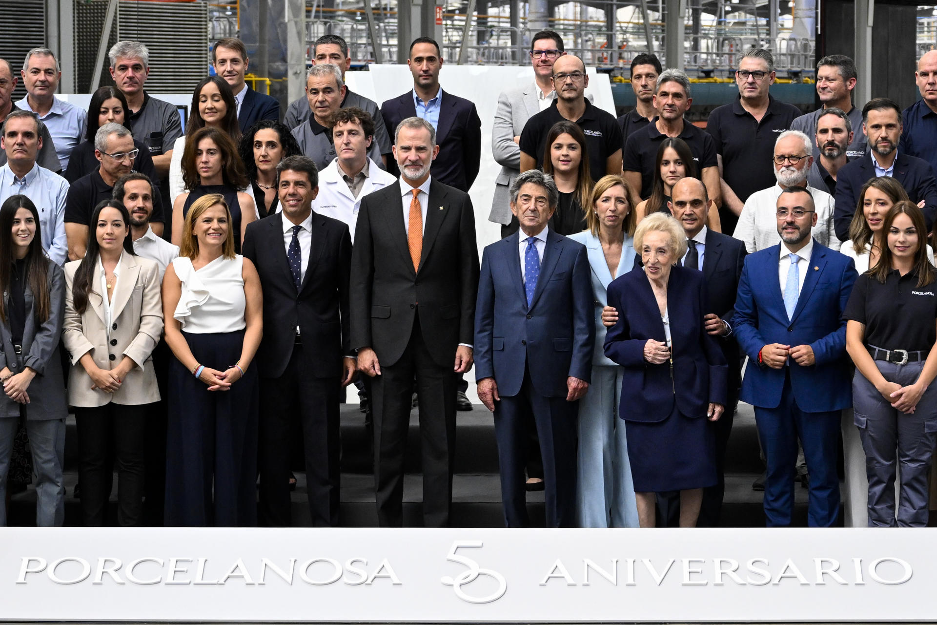 El rey Felipe posa con autoridades y empleados de Porcelanosa Grupo durante la visita a las instalaciones de esta empresa azulejera con motivo de su 50 aniversario. EFE/Andreu Esteban