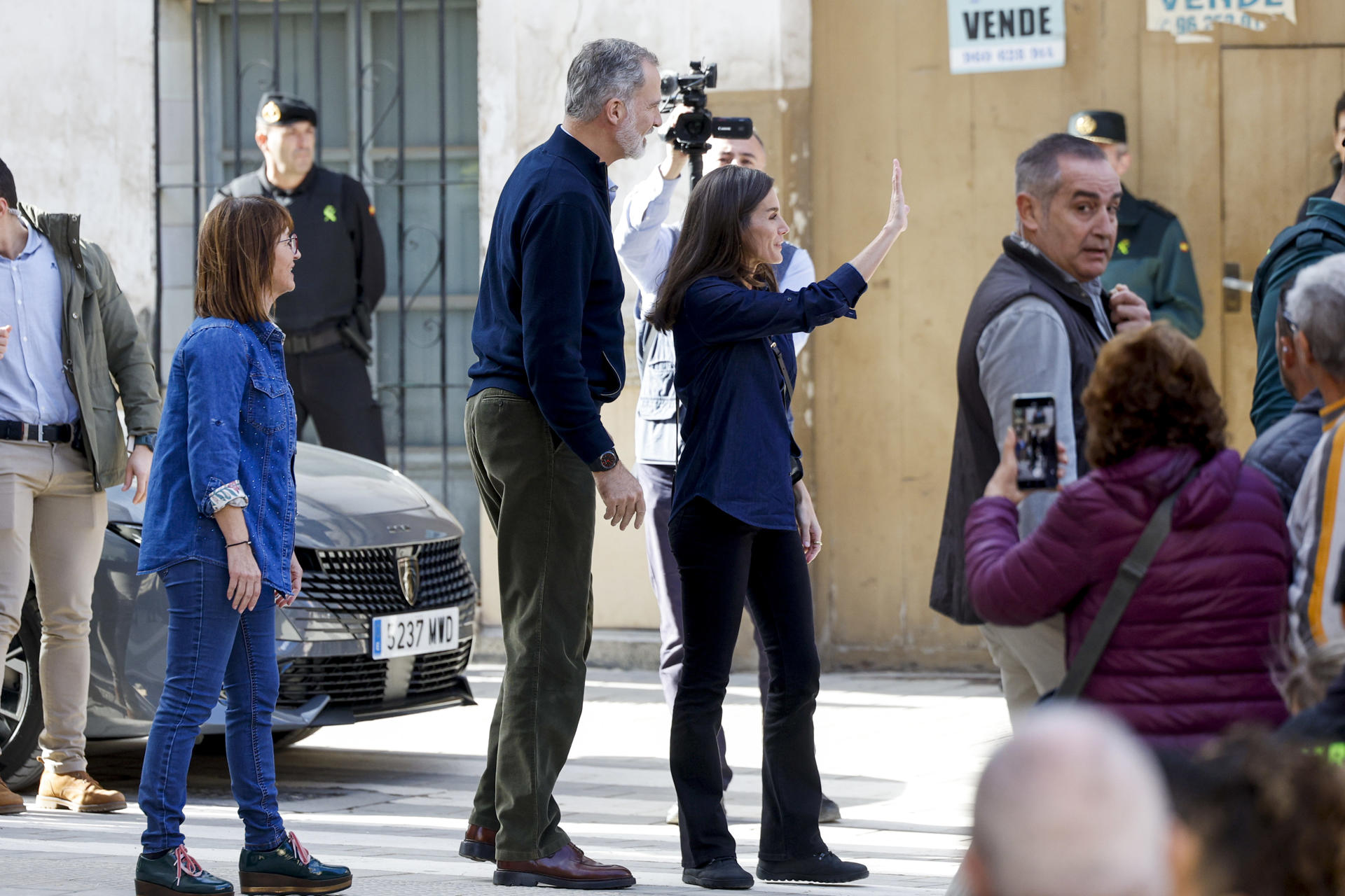 - CHIVA (VALENCIA), 19/11/2024.- Los reyes Felipe y Letizia, durante su visita a la localidad valenciana de Chiva este martes. EFE/ Kai Försterling