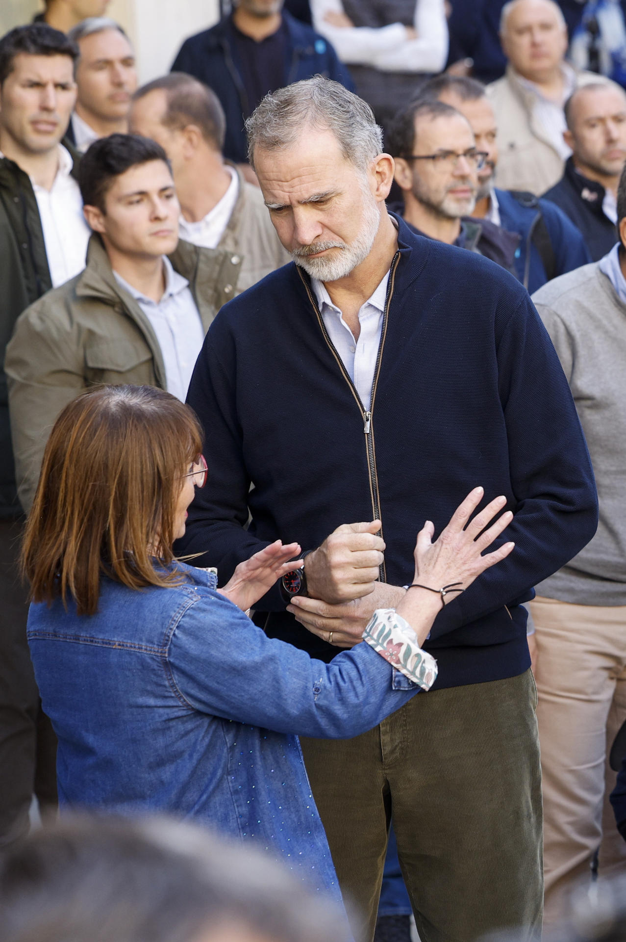 - CHIVA (VALENCIA), 19/11/2024.- El rey Felipe conversa con la alcaldesa de Chiva Amparo Fort (i), durante su visita a la localidad valenciana de Chiva este martes. EFE/ Kai Försterling