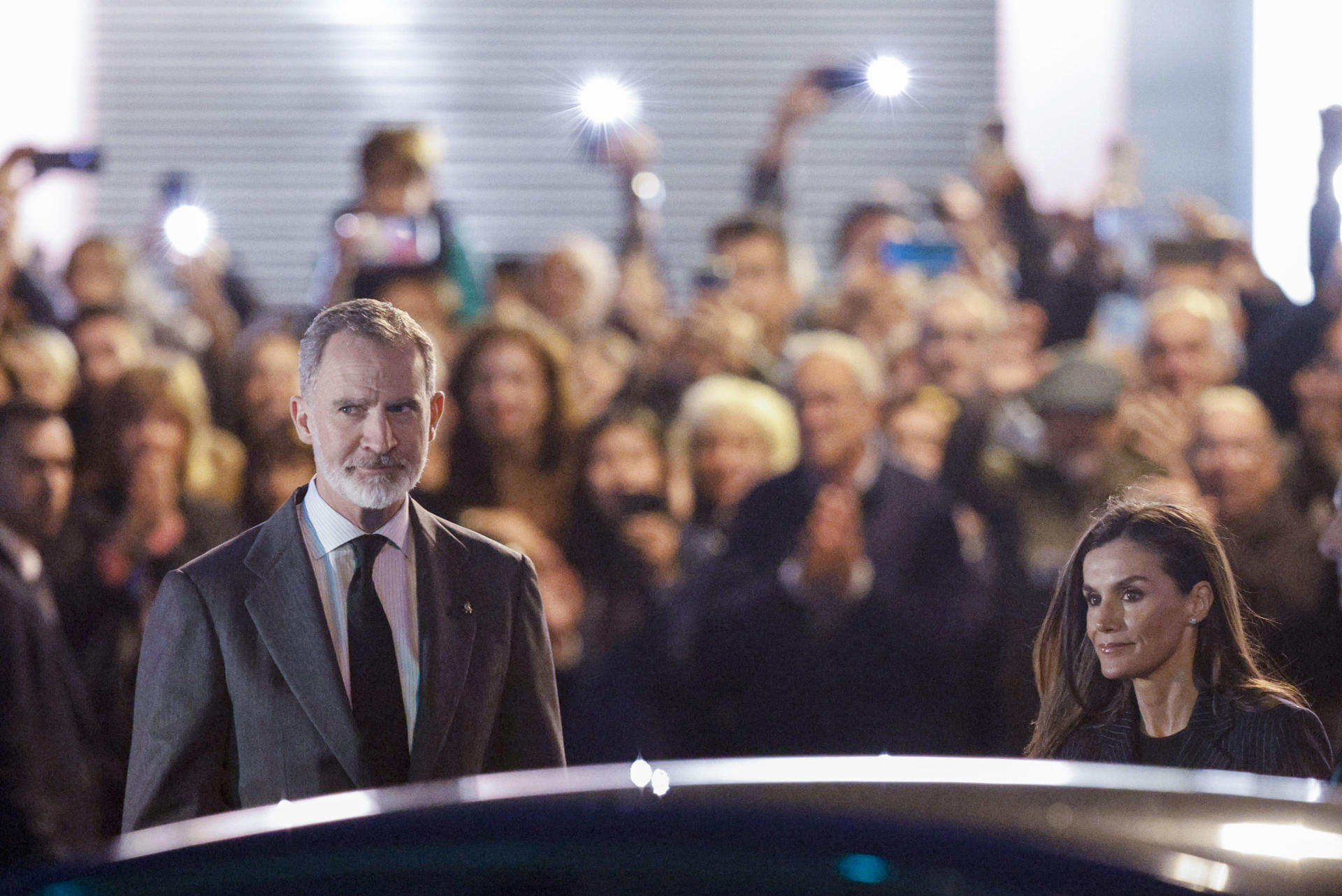 Los reyes Felipe (i) y Letizia (d) visitan este lunes el Palau de la Música de Valencia para solidarizarse con los afectados por el devastador incendio de un edificio en el barrio de Campanar de Valencia. EFE/Kai Försterling
